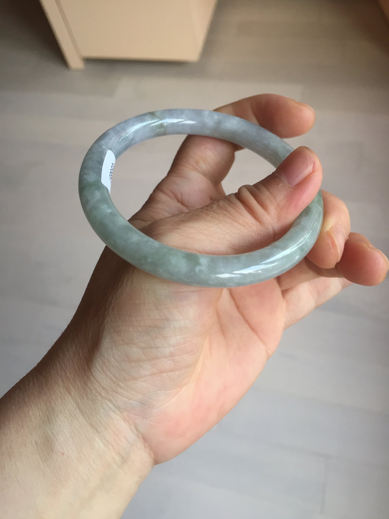 No crack. No hairline. One around the bangle color root. The bangle is solid. Quite a lot of cotton areas and spots. The purple is lighter than in the photos. Has some gray color.