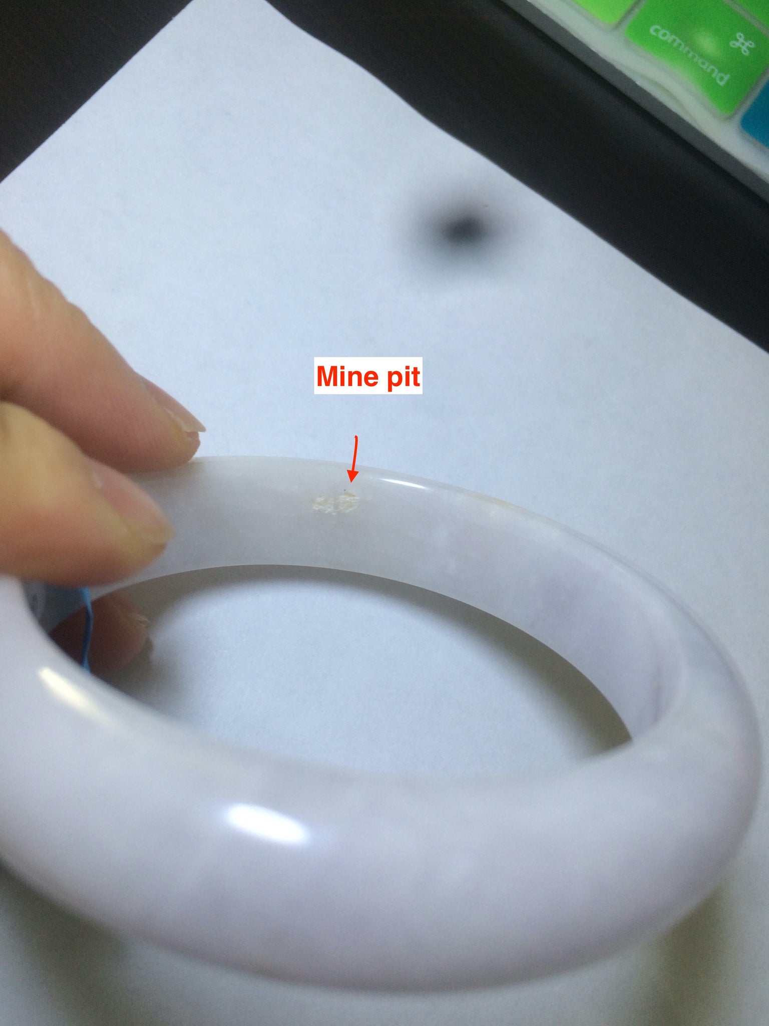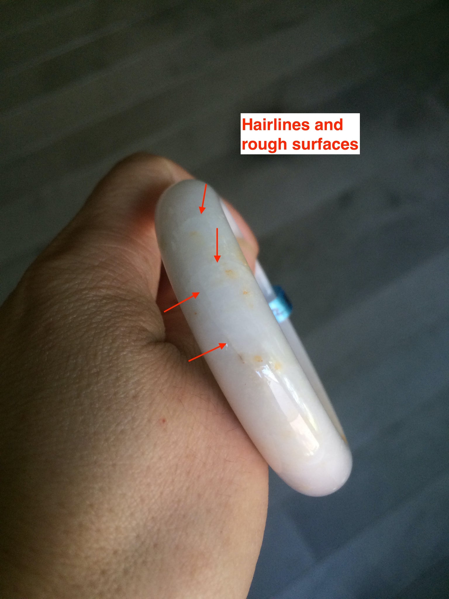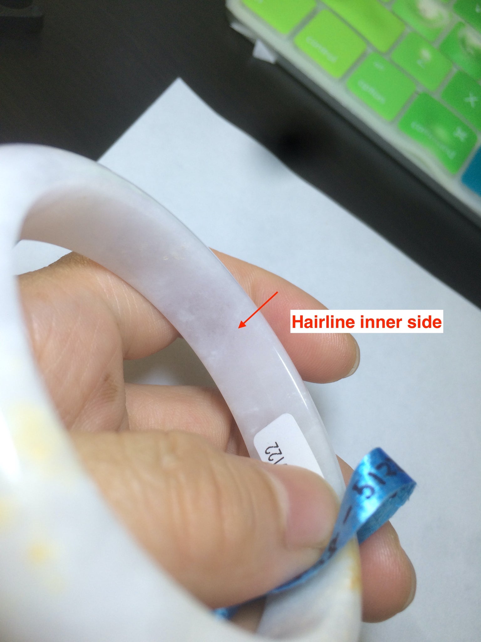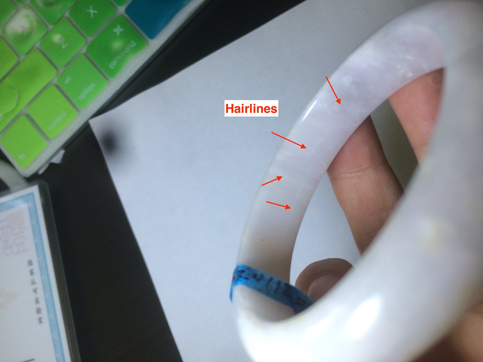 No crack. Some hairlines(photos may not show all). One is long, almost alongside half of the bangle. Cotton spots and cotton lines. Rough surfaces and mine pits. The purple is super light. Way lighter than photos.
