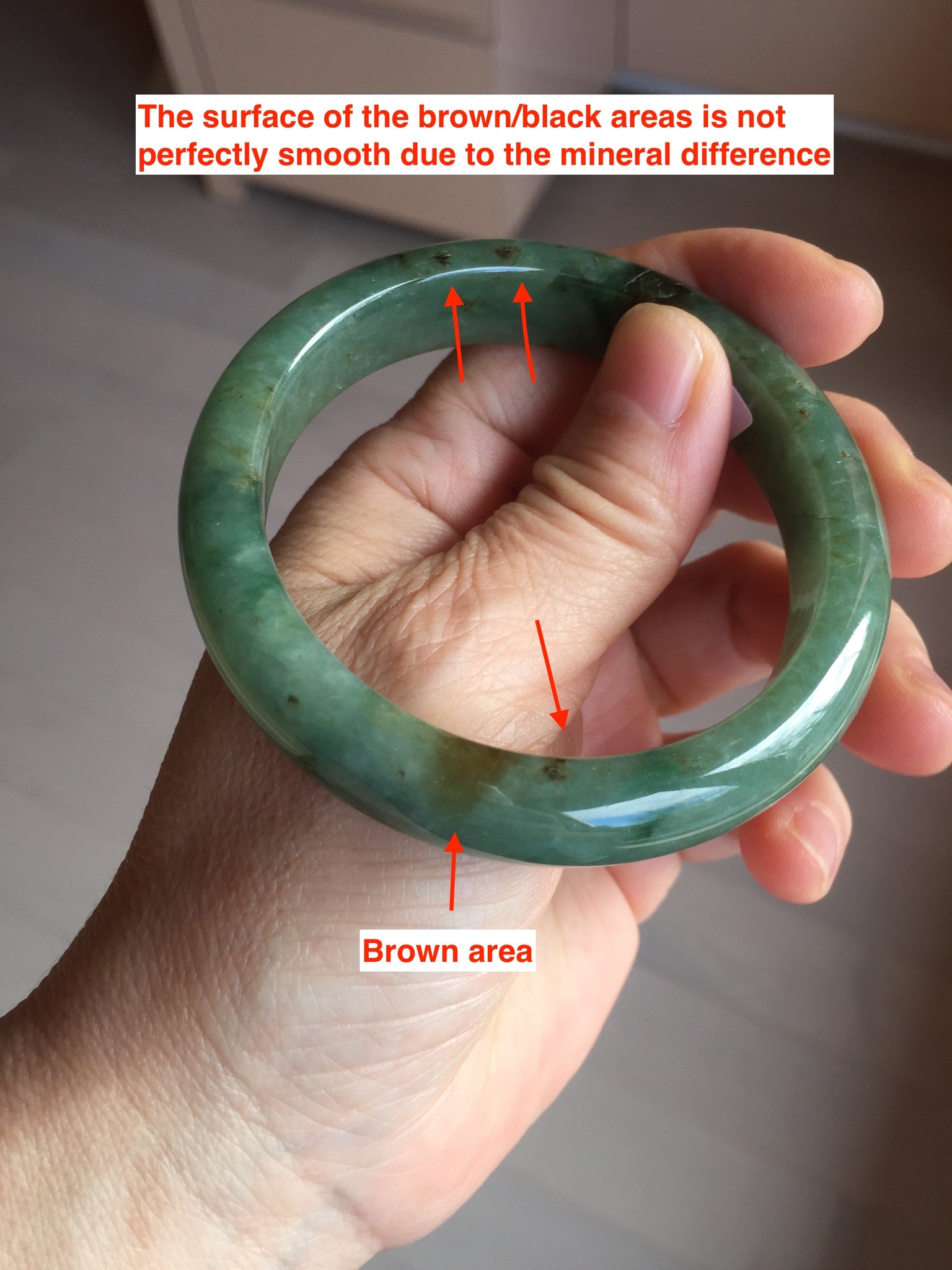 Some cracks. One of them is an around the bangle crack. But the inner part of the bangle is connected. The bangle is solid(Guaranteed). Makes high pitched sound when clicked. Some hairlines, color roots, or cotton lines. The surface of the brown/black areas is not perfectly smooth due to the mineral difference.  No transparent. Has some gray colors.