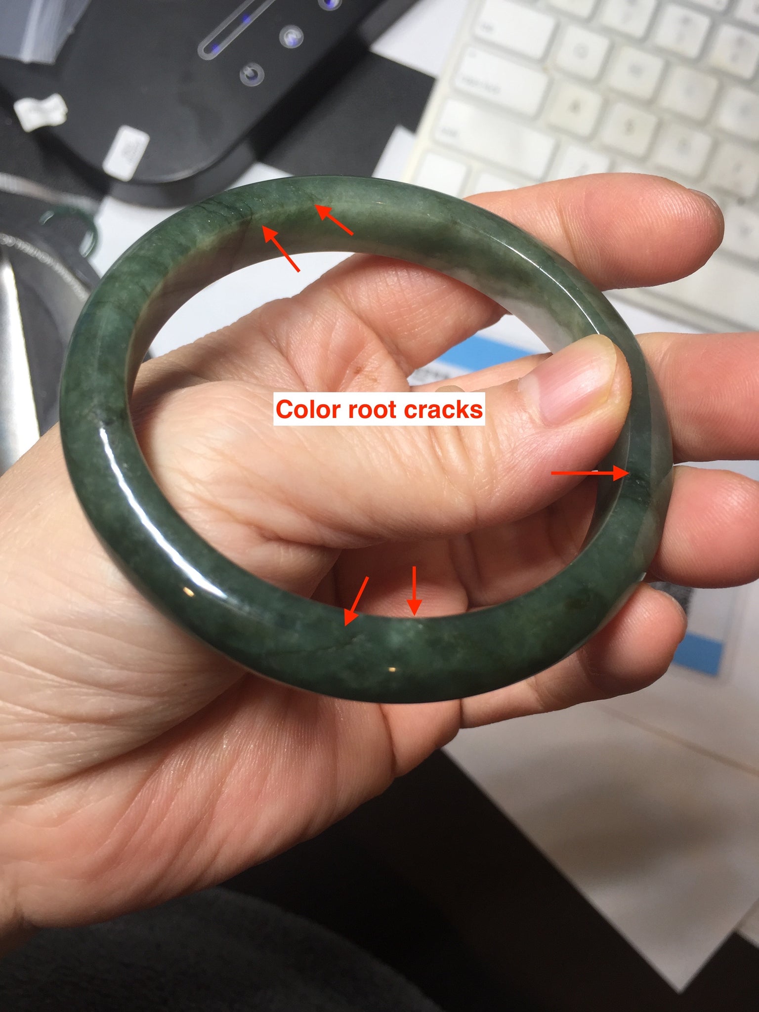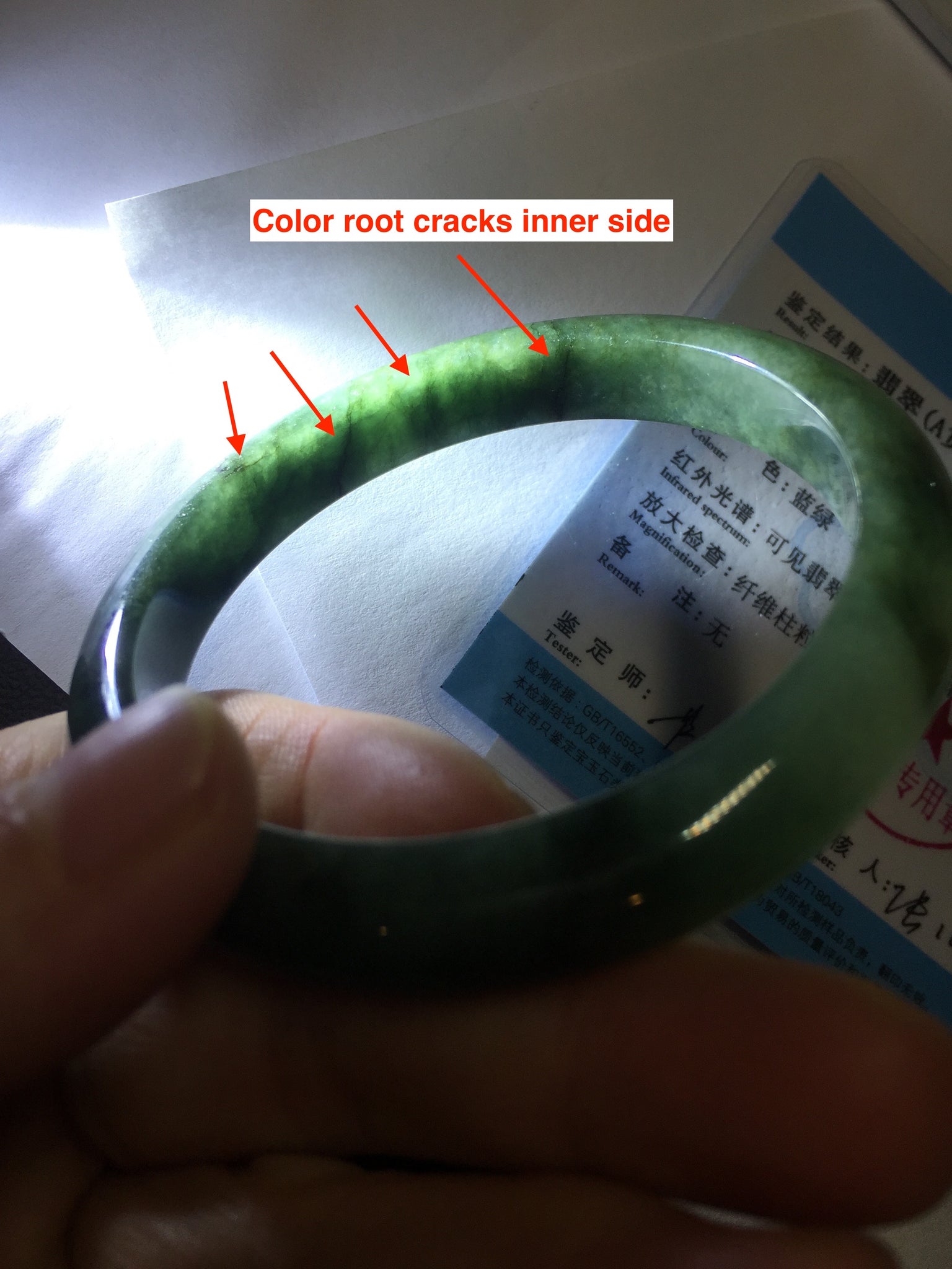 Some color root cracks. Some of them are around the bangle cracks. But the inner part of the bangle is connected. The bangle is solid(Guaranteed). Makes high pitched sound when clicked. Some hairlines, color roots, or cotton lines.  No transparent. Has some gray/black colors.