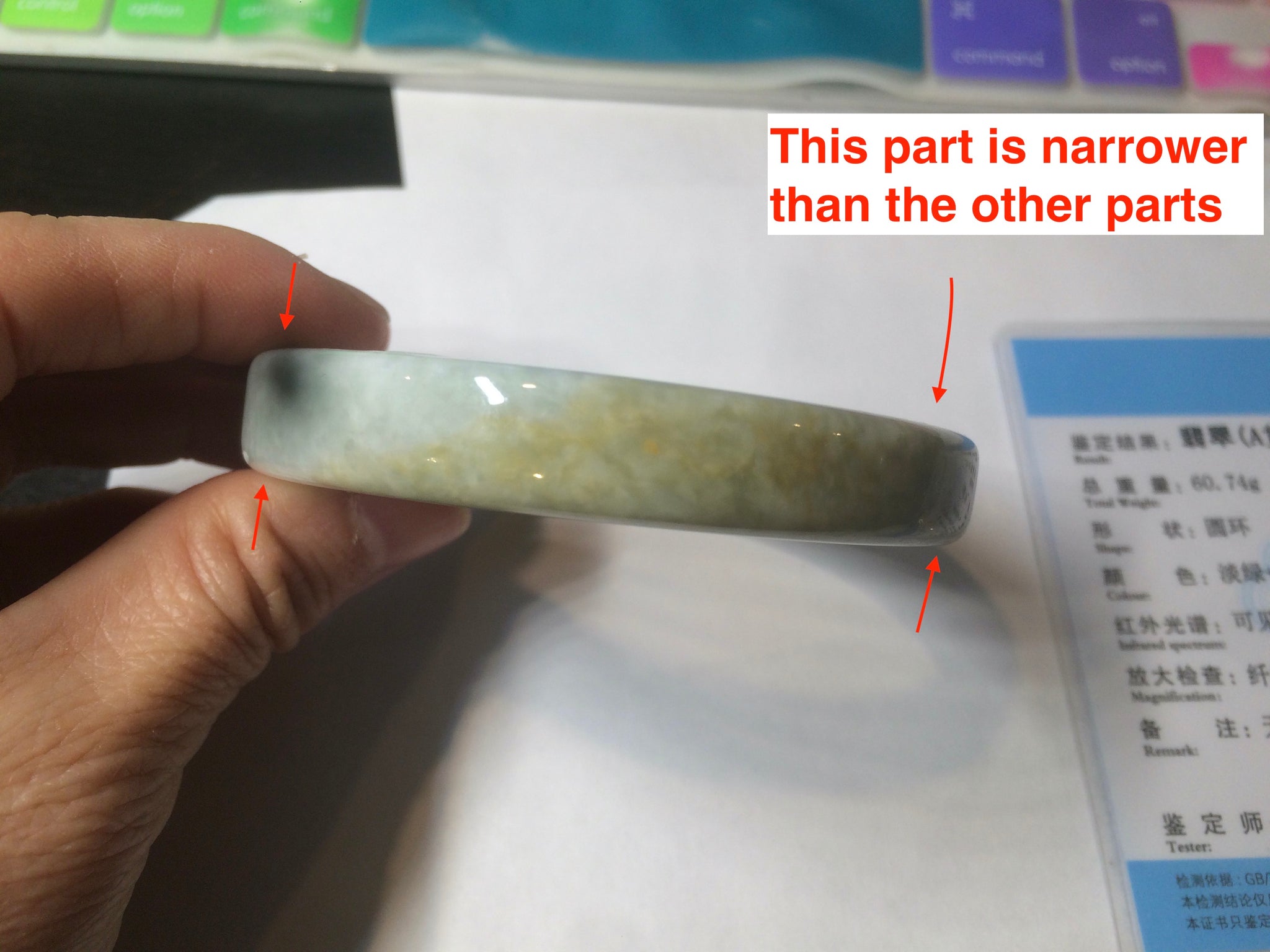 One crack. Some color roots or hairlines. Some rough surfaces on the yellow jade areas. One rough surface with wax. One part is narrower than the other parts 12.2vs 11.8mm.