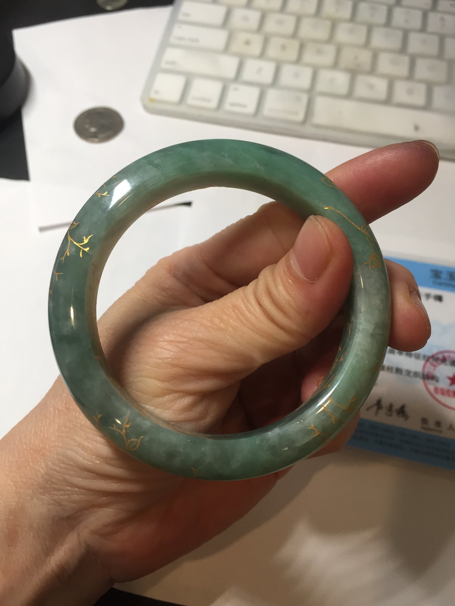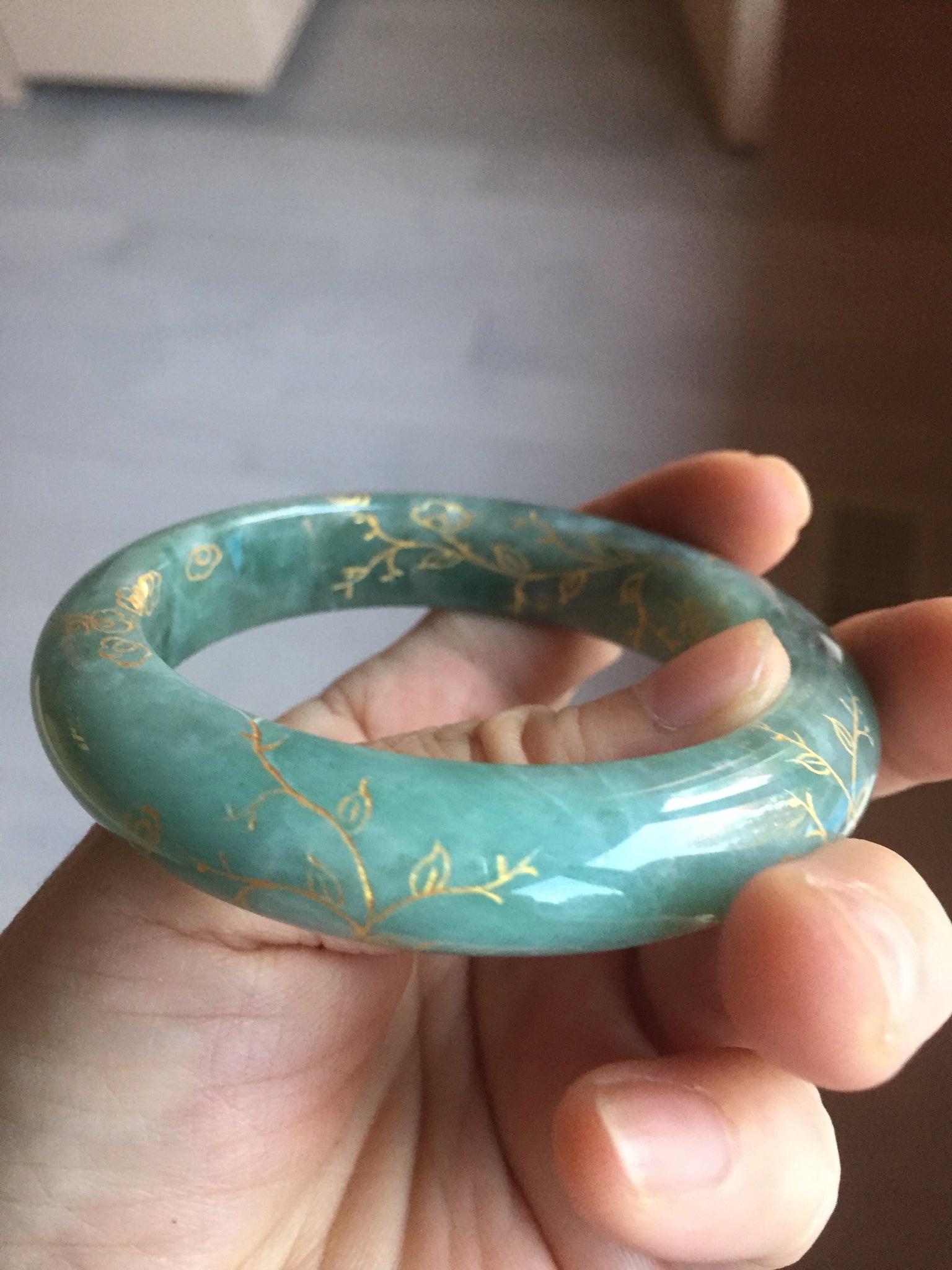 56mm 100% Natural type A green/gray carved flowers and golden-painted Jadeite Jade bangle PB249-5681