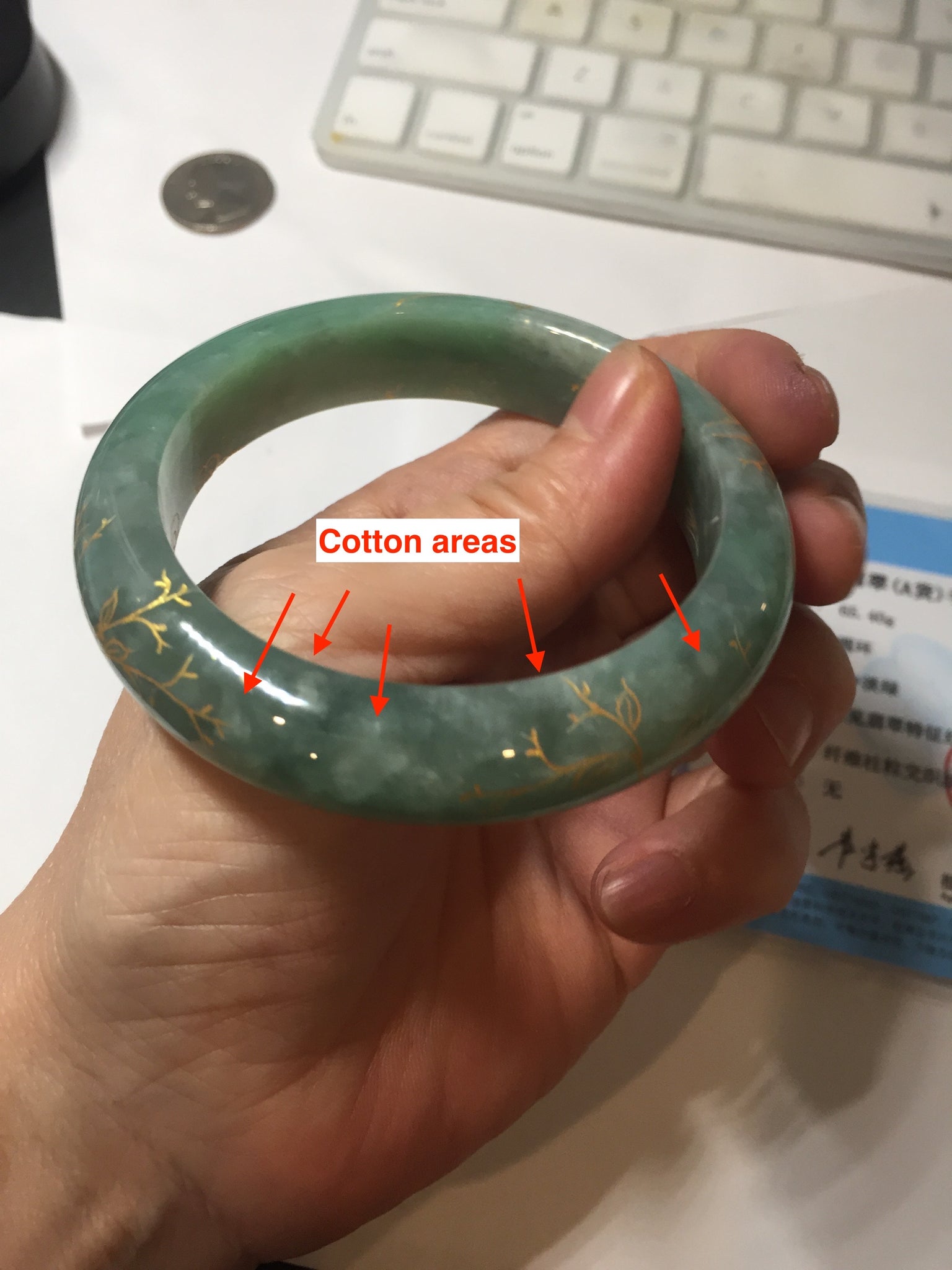 Some surface cracks, hairlines, rough surface mostly covered by the carving. The bangle is still firm(Guaranteed!). Some hairline, cotton lines, cotton areas. Has some gray color.