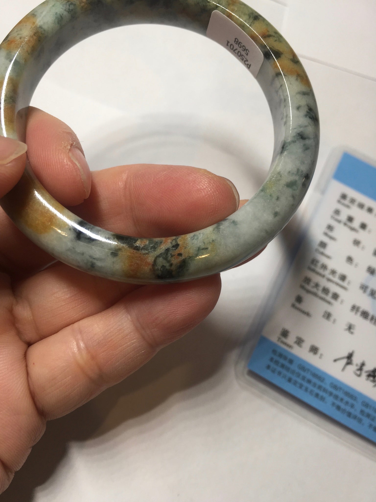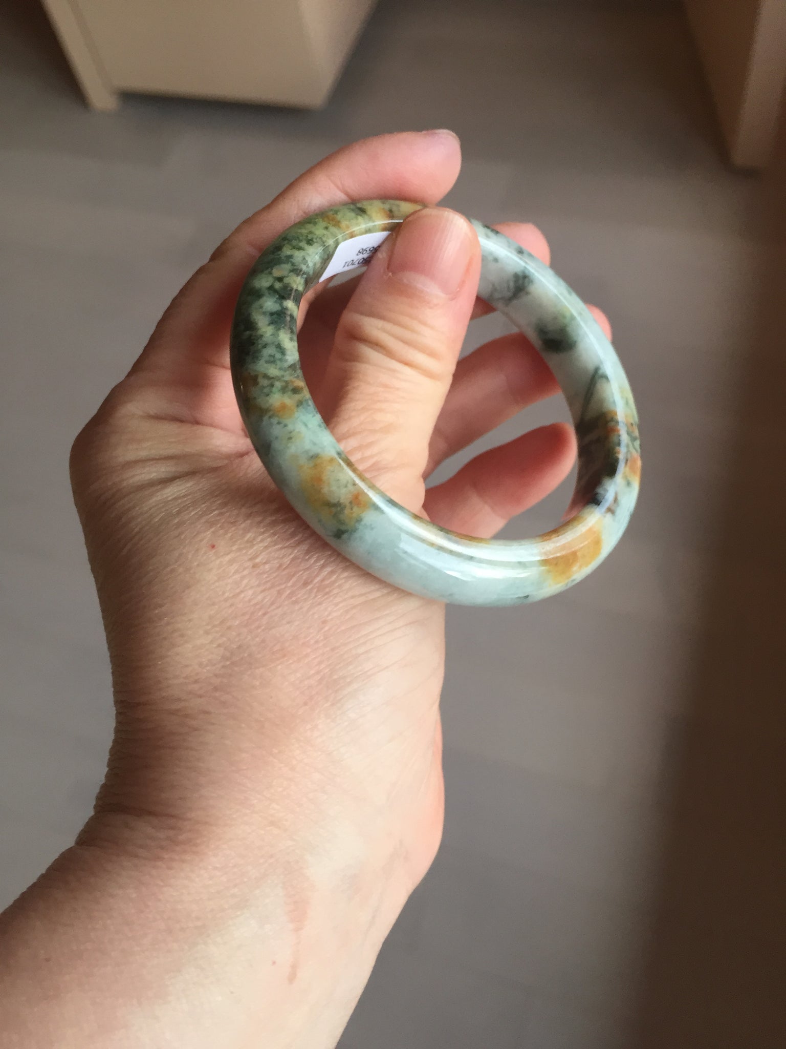 Type A natural jadeite bangle features a rich combination of forest green, soft celadon, and warm golden-brown tones — like an autumn forest captured in stone.
