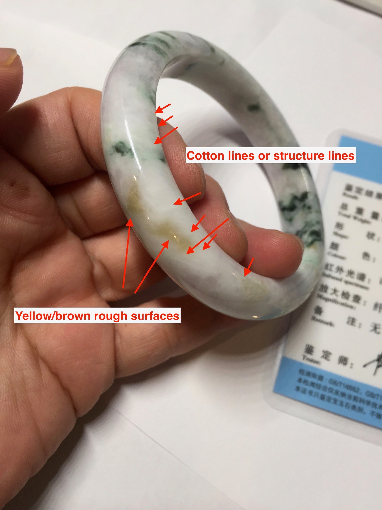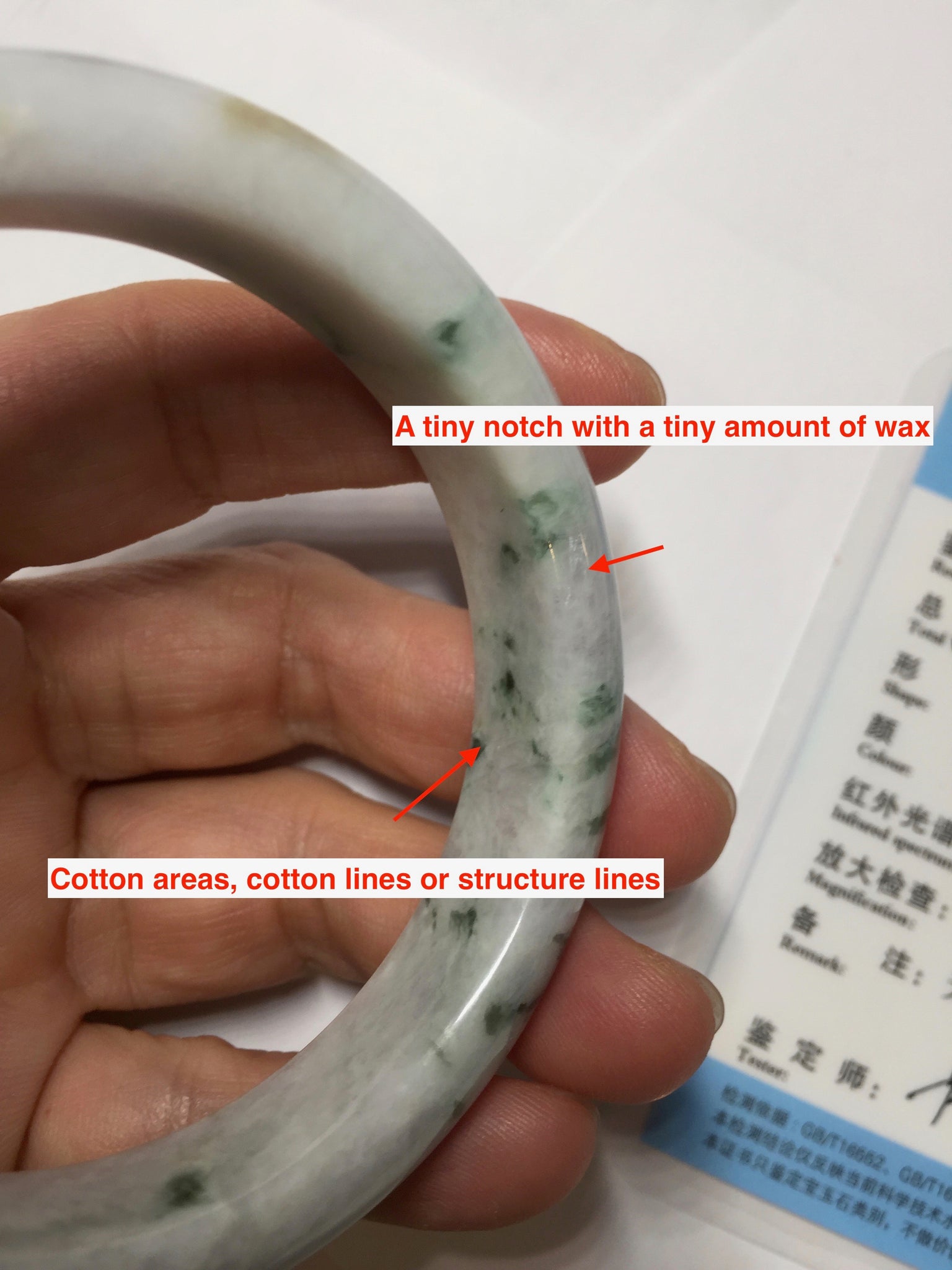 One unnoticeable notch with a tiny amount of wax. Some cotton areas, cotton lines or structure lines. Some brown/yellow rough surface areas. No transparent. No watery. The purple color is super light, lighter than photos.