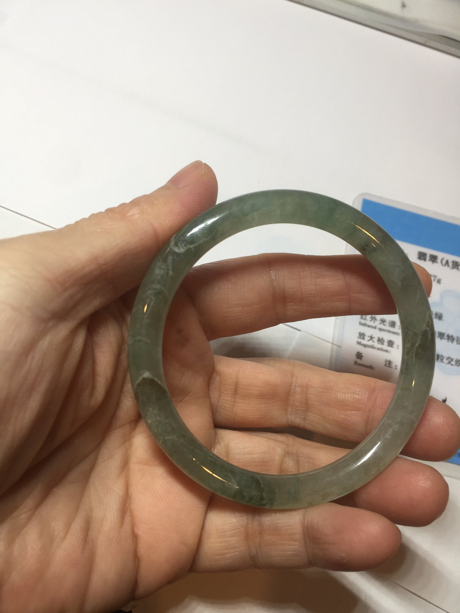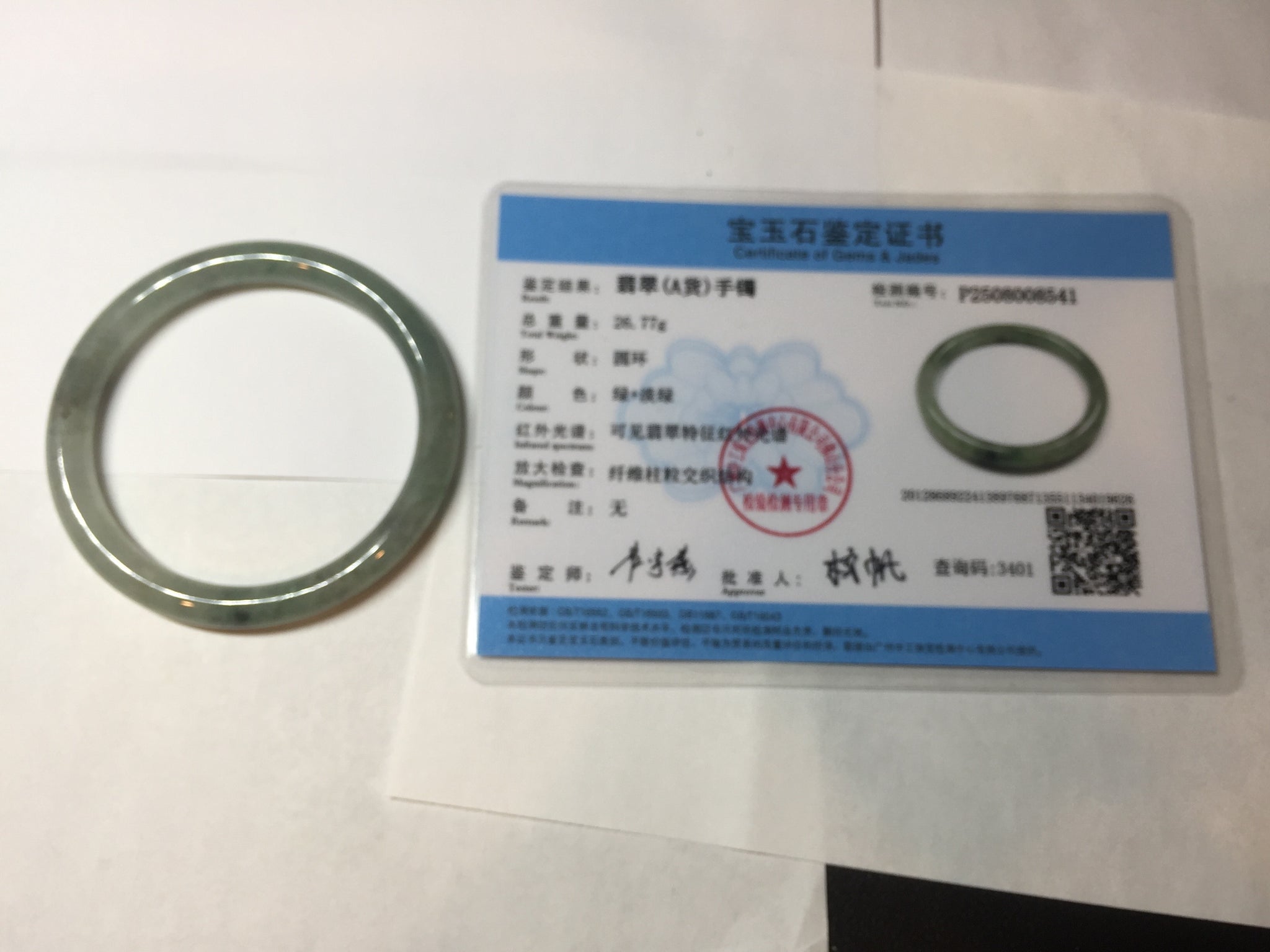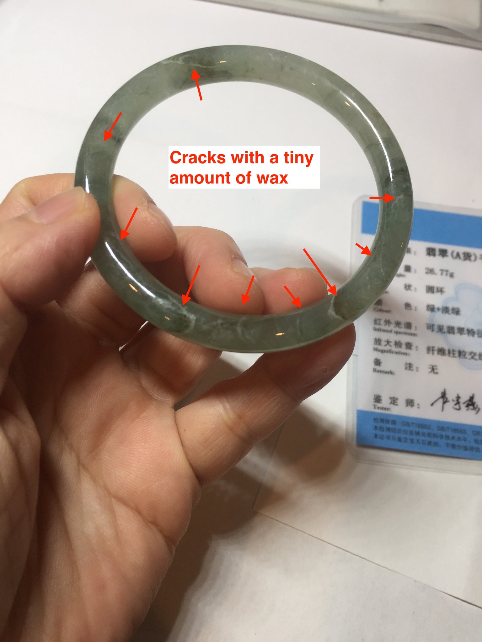 Quite a lot of cracks, fissures, rough surfaces, and mine pits with tiny amount of wax. The bangle is firm(Guaranteed). Some dark/brown rough surface areas. Some cotton areas, cotton lines, structure lines, and cotton spots. Black color roots, black spots, and brown areas.
