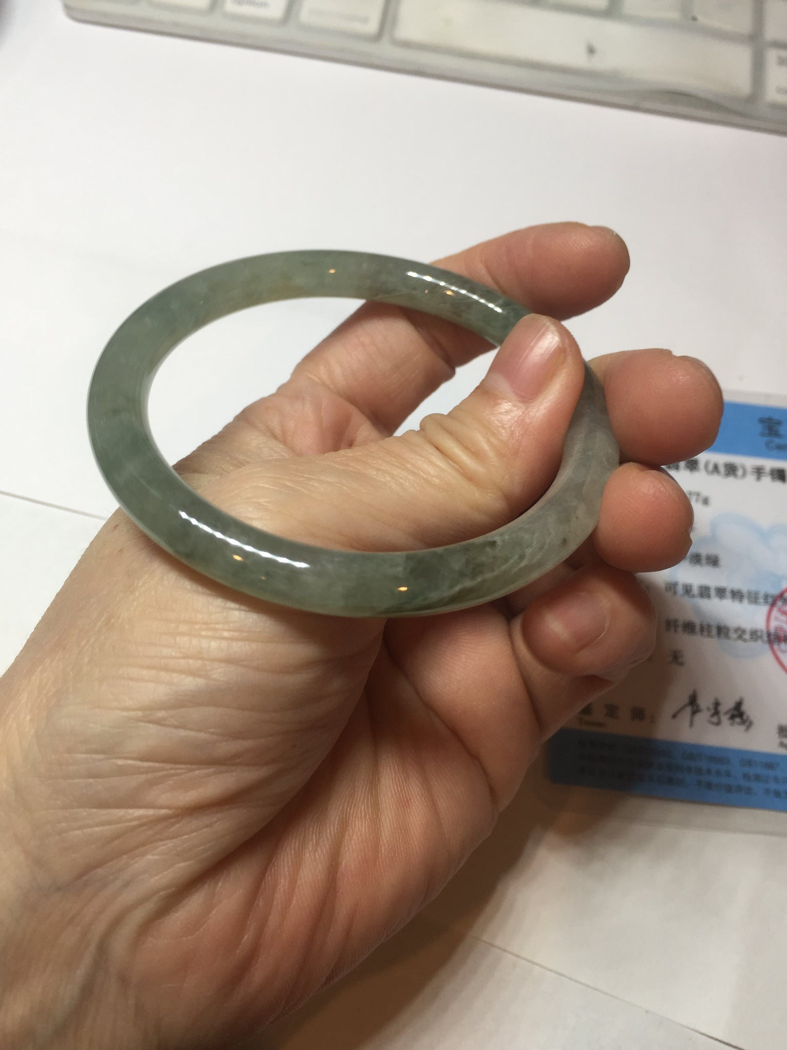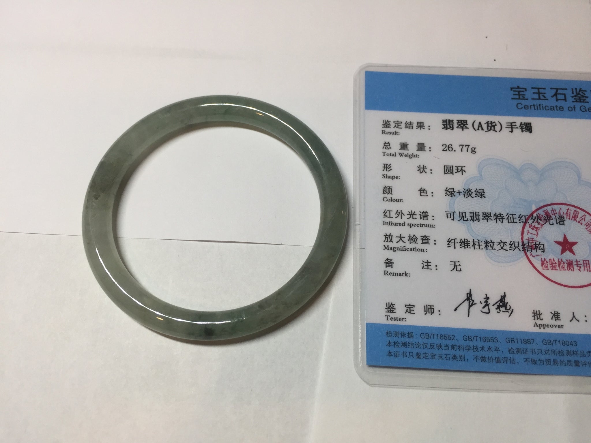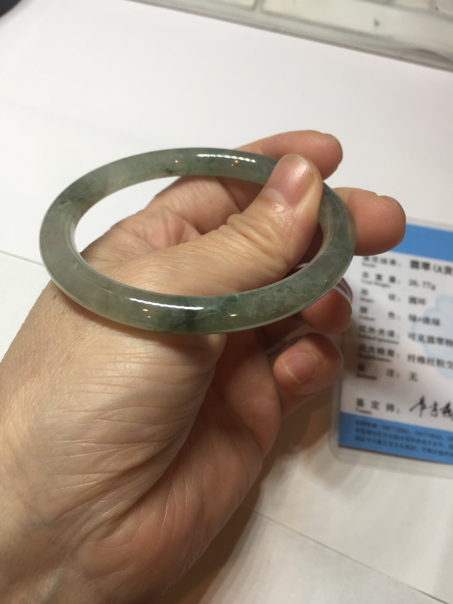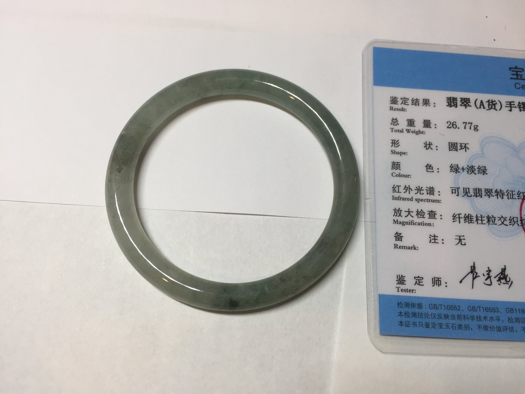 Quite a lot of cracks, fissures, rough surfaces, and mine pits with tiny amount of wax. The bangle is firm(Guaranteed). Some dark/brown rough surface areas. Some cotton areas, cotton lines, structure lines, and cotton spots. Black color roots, black spots, and brown areas.