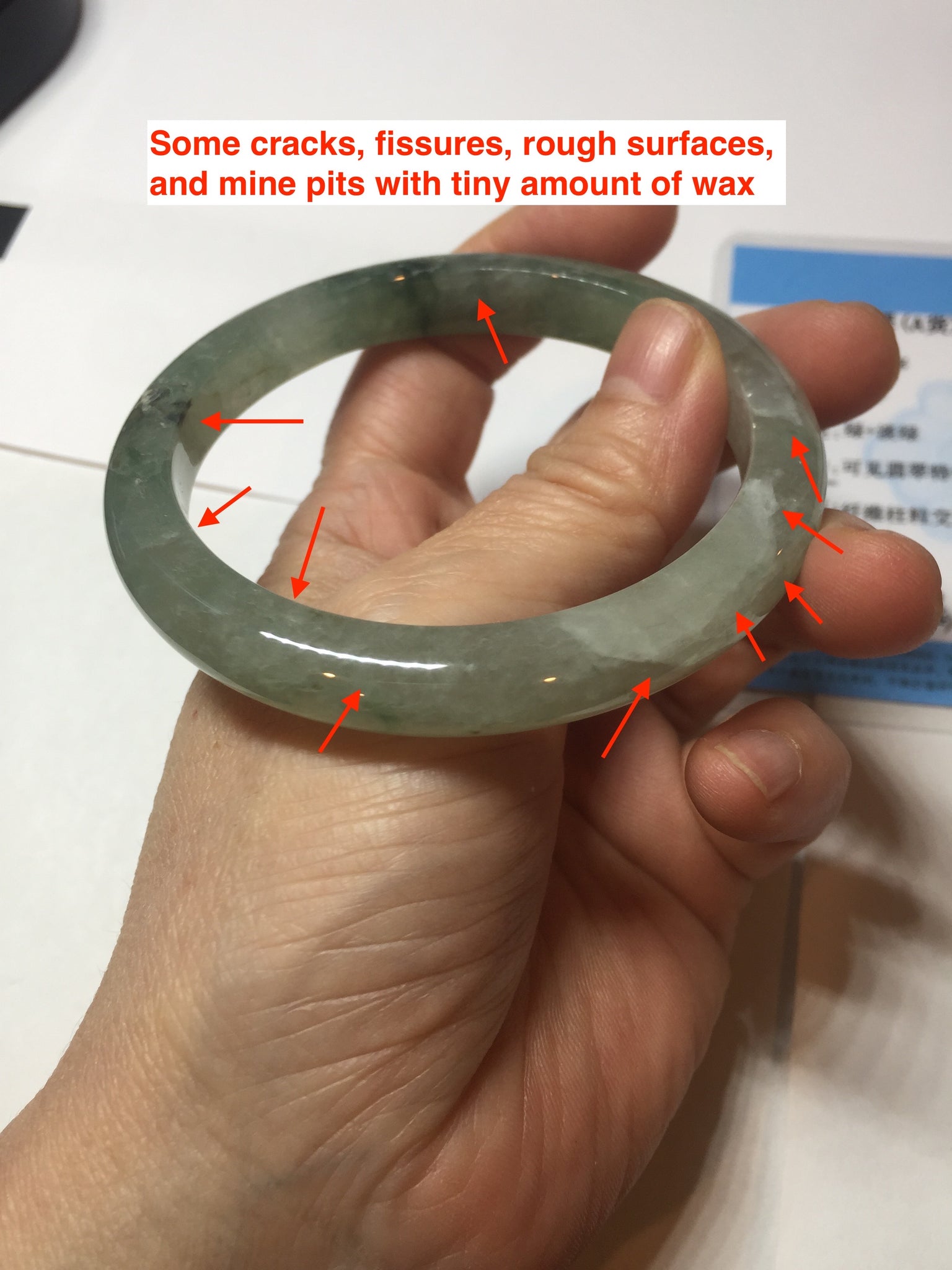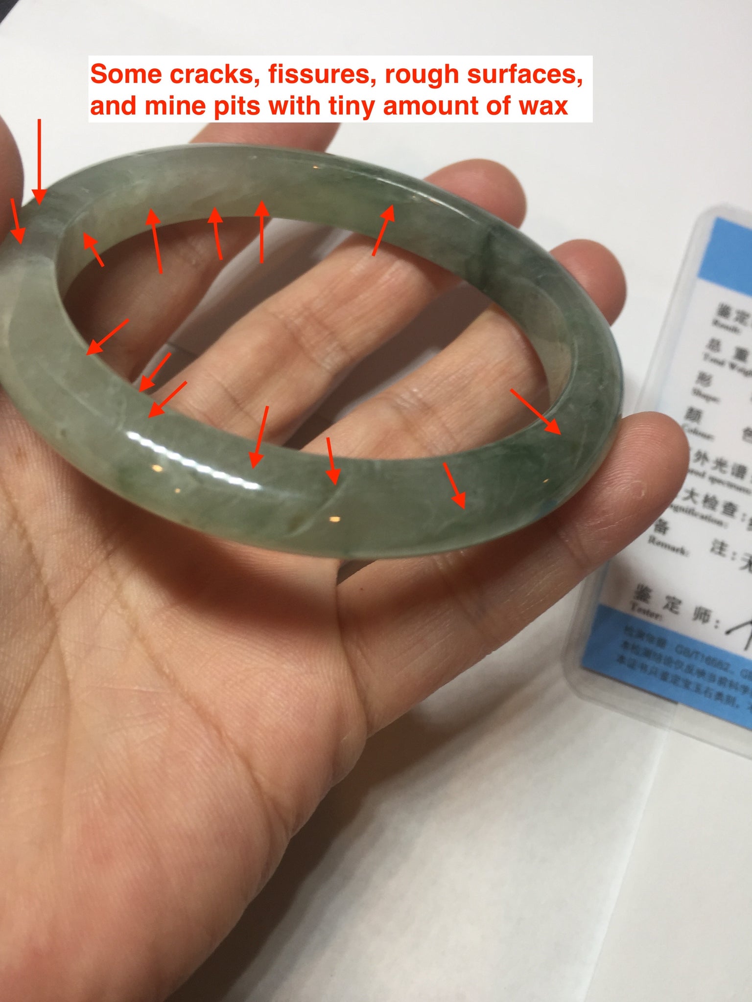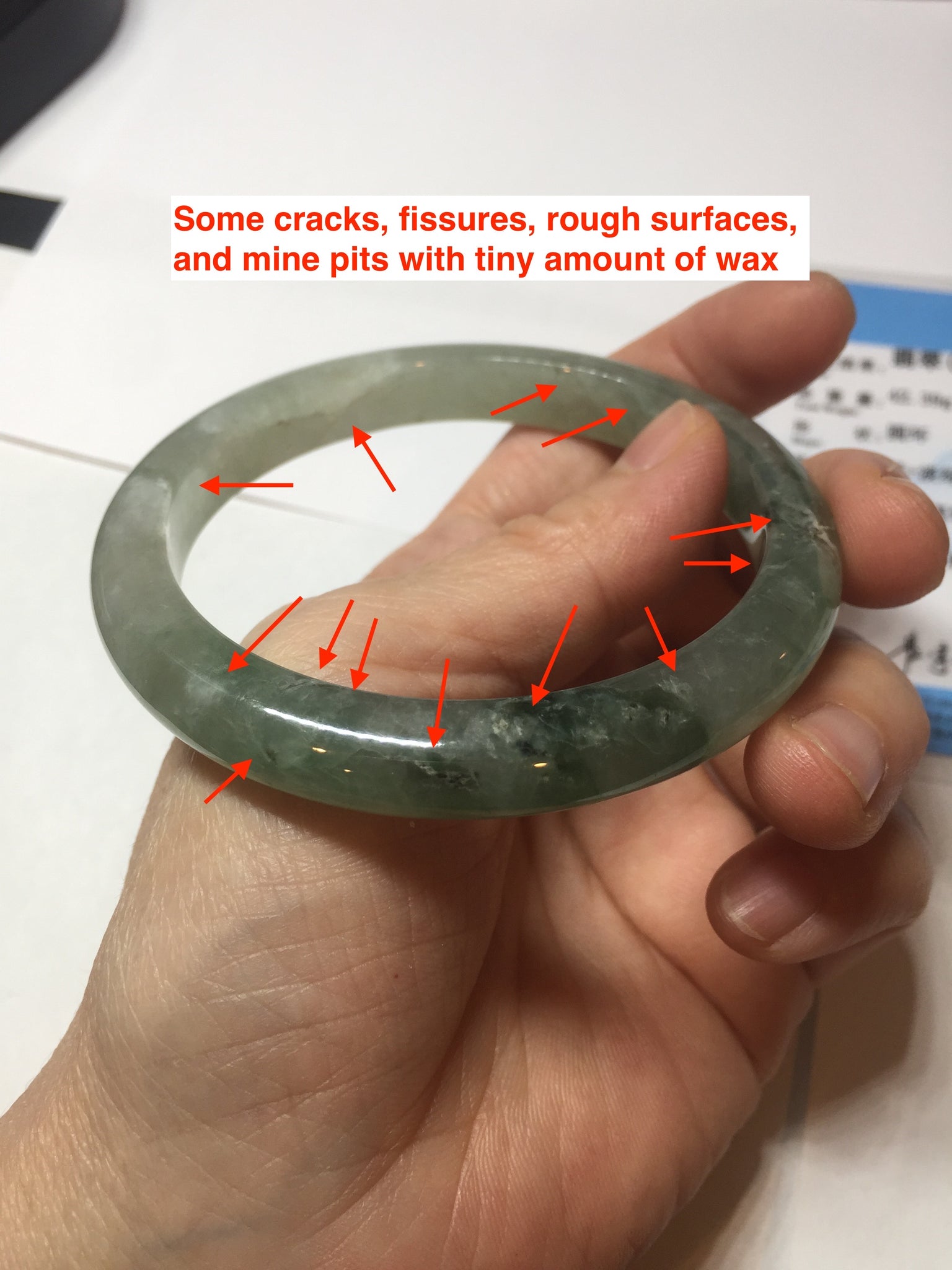 Quite a lot of cracks, fissures, rough surfaces, and mine pits with tiny amount of wax. The bangle is firm(Guaranteed). Some dark/brown rough surface areas. Some cotton areas, cotton lines, structure lines, and cotton spots. Black color roots, black spots, and brown areas.