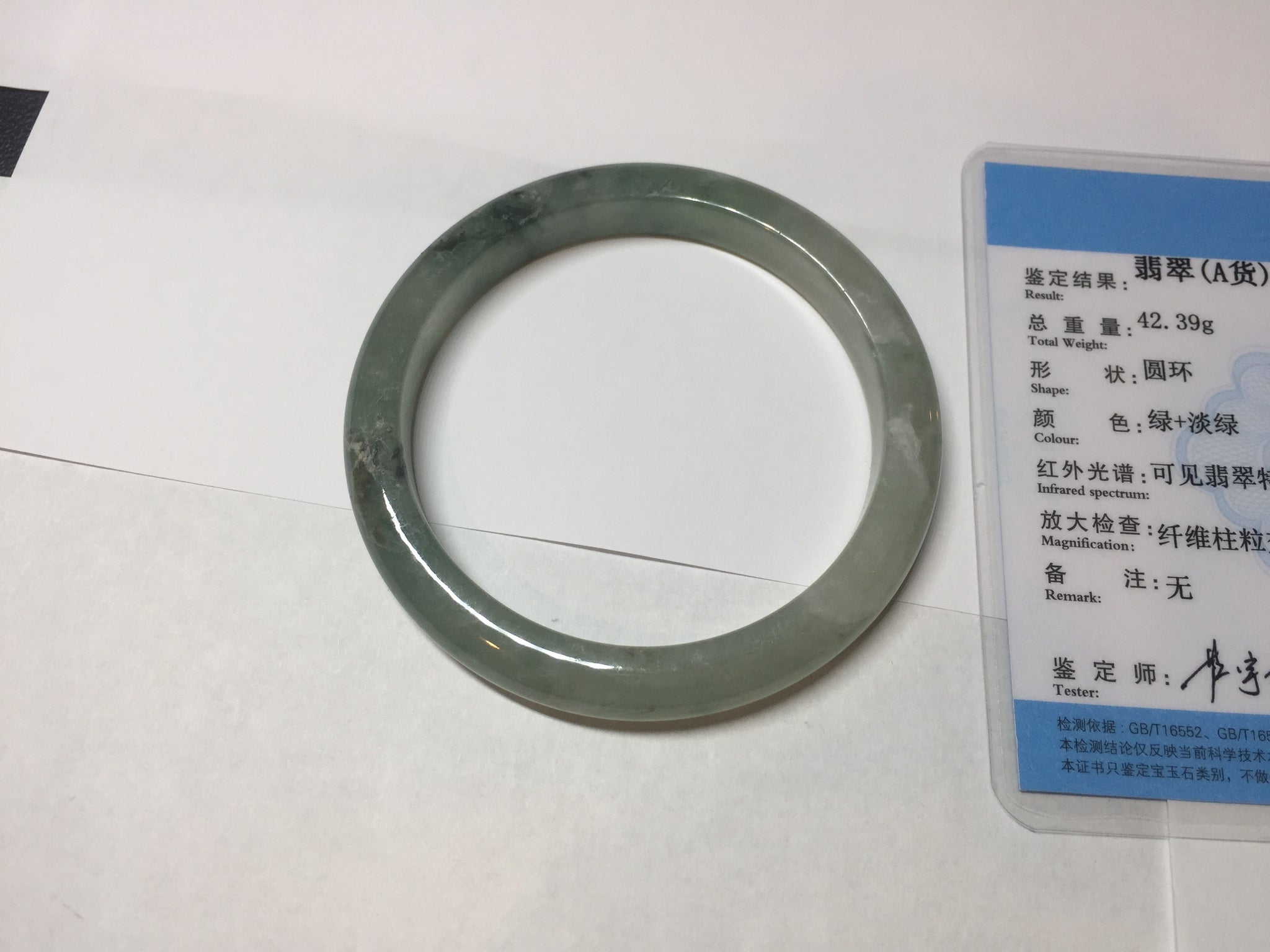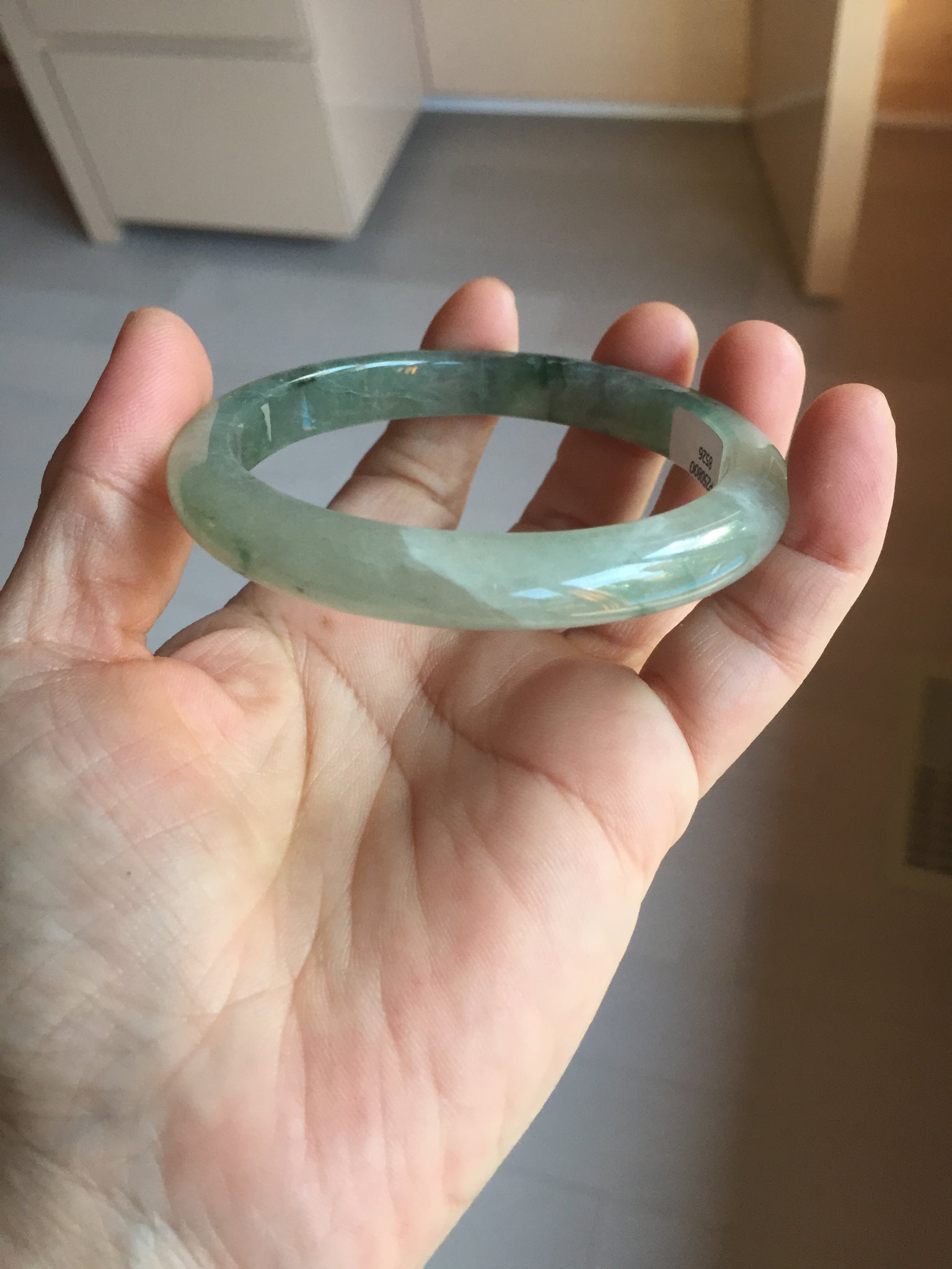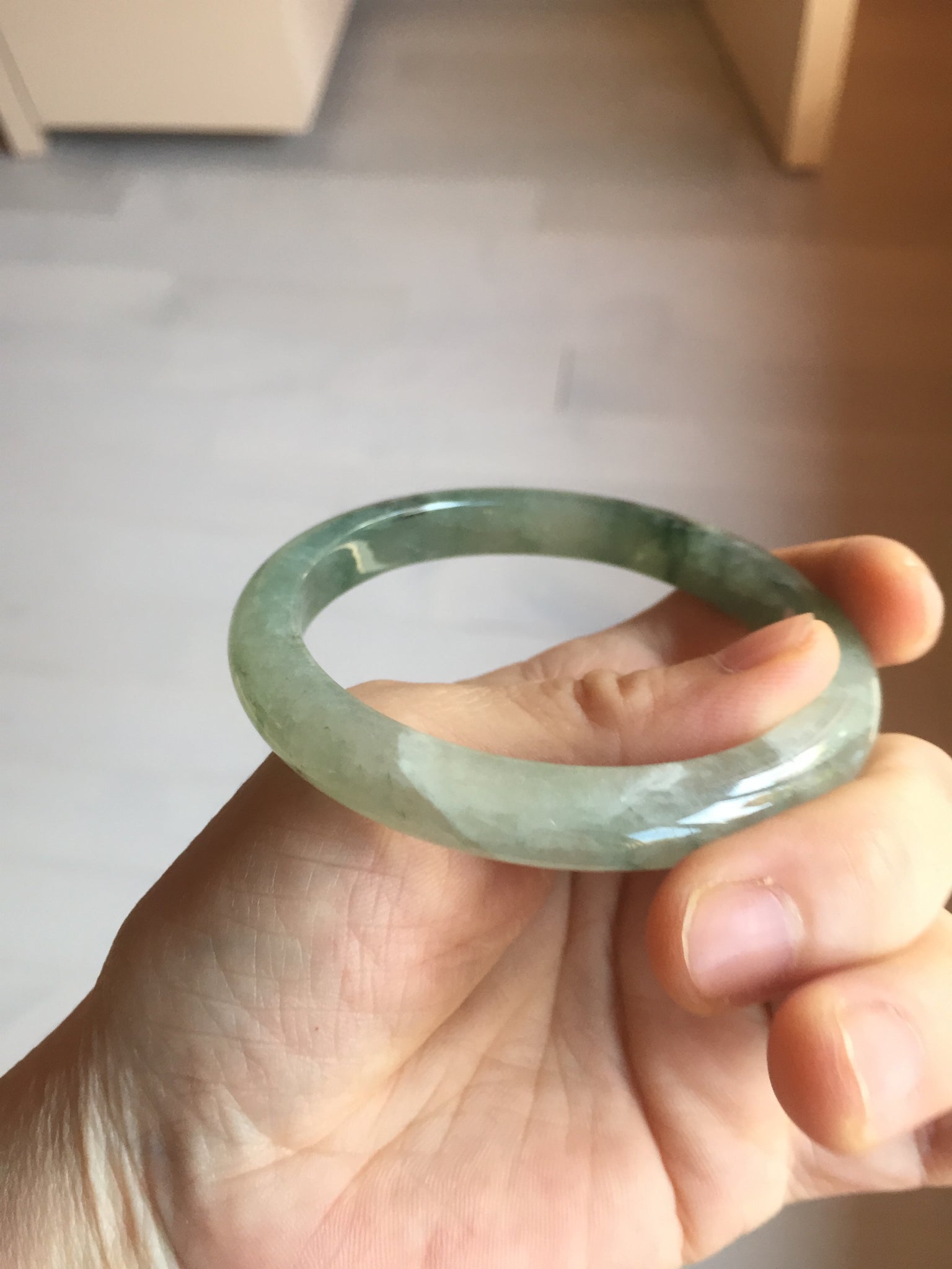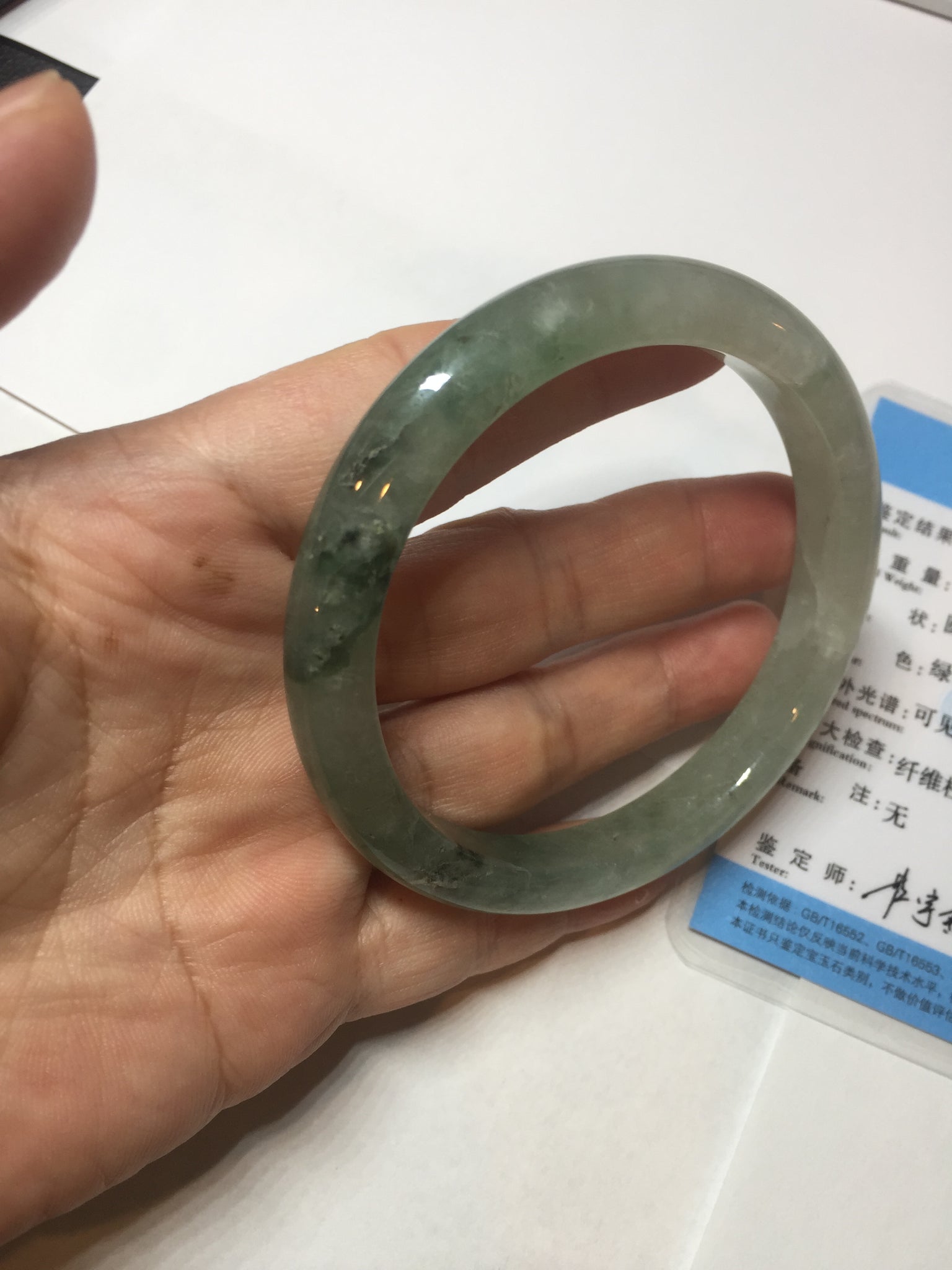 Quite a lot of cracks, fissures, rough surfaces, and mine pits with tiny amount of wax. The bangle is firm(Guaranteed). Some dark/brown rough surface areas. Some cotton areas, cotton lines, structure lines, and cotton spots. Black color roots, black spots, and brown areas.