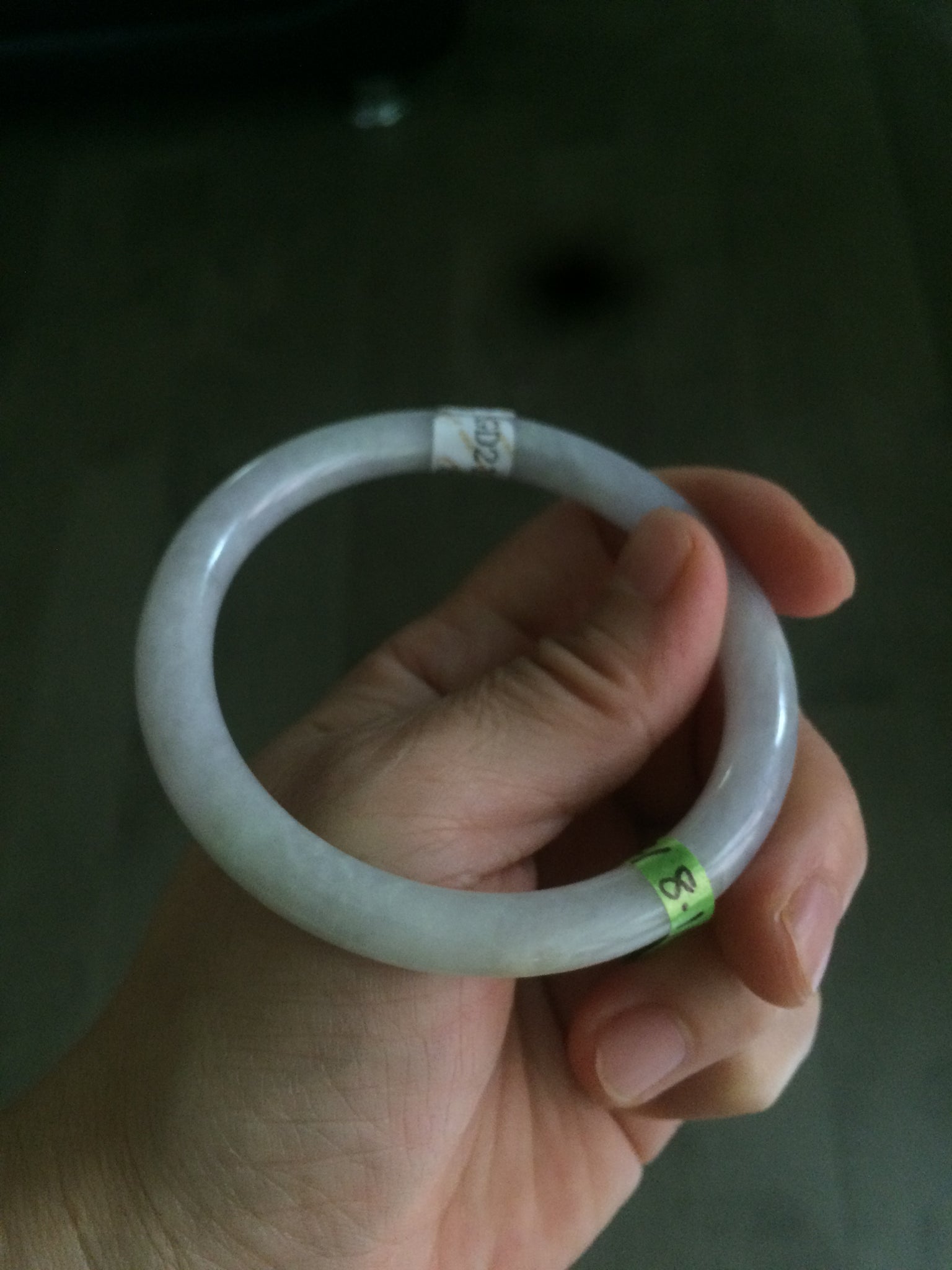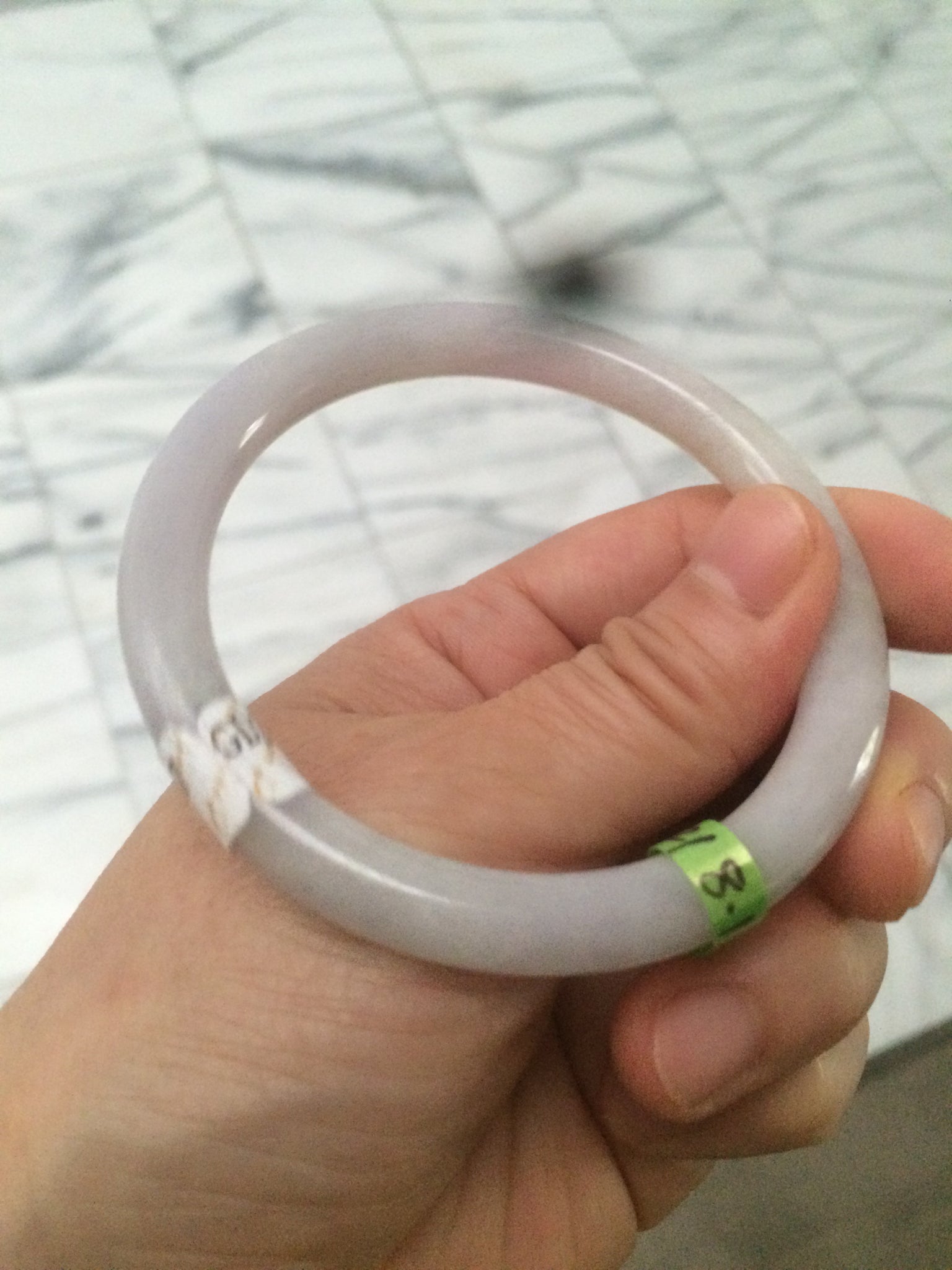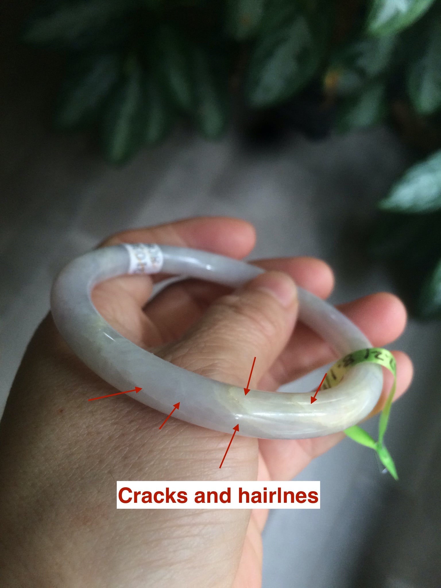 Some cracks (at least 8) and hairlines. Some of them are long U shape with a tiny trace of wax. But none of them are around the bangle or cut-through crack. Cotton spots. The purple is lighter than photos due to the purple always being camera-friendly.