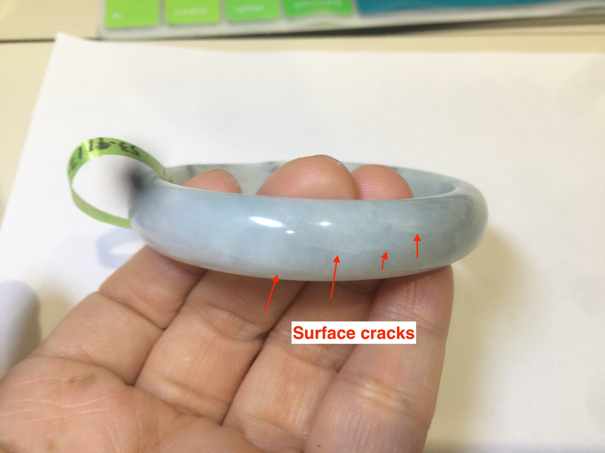 Some cracks. Some hairlines. One area is not so smooth. No transparent. No watery.