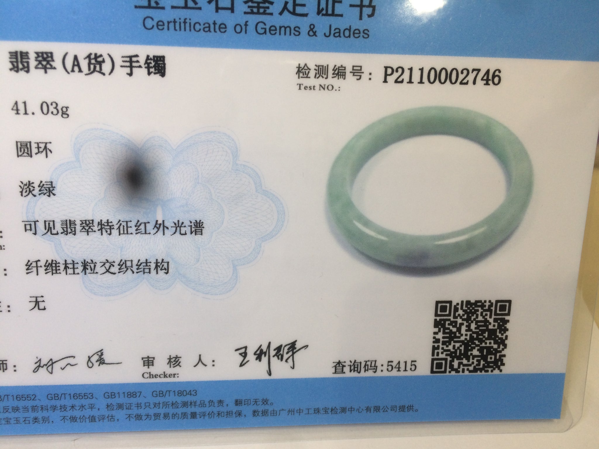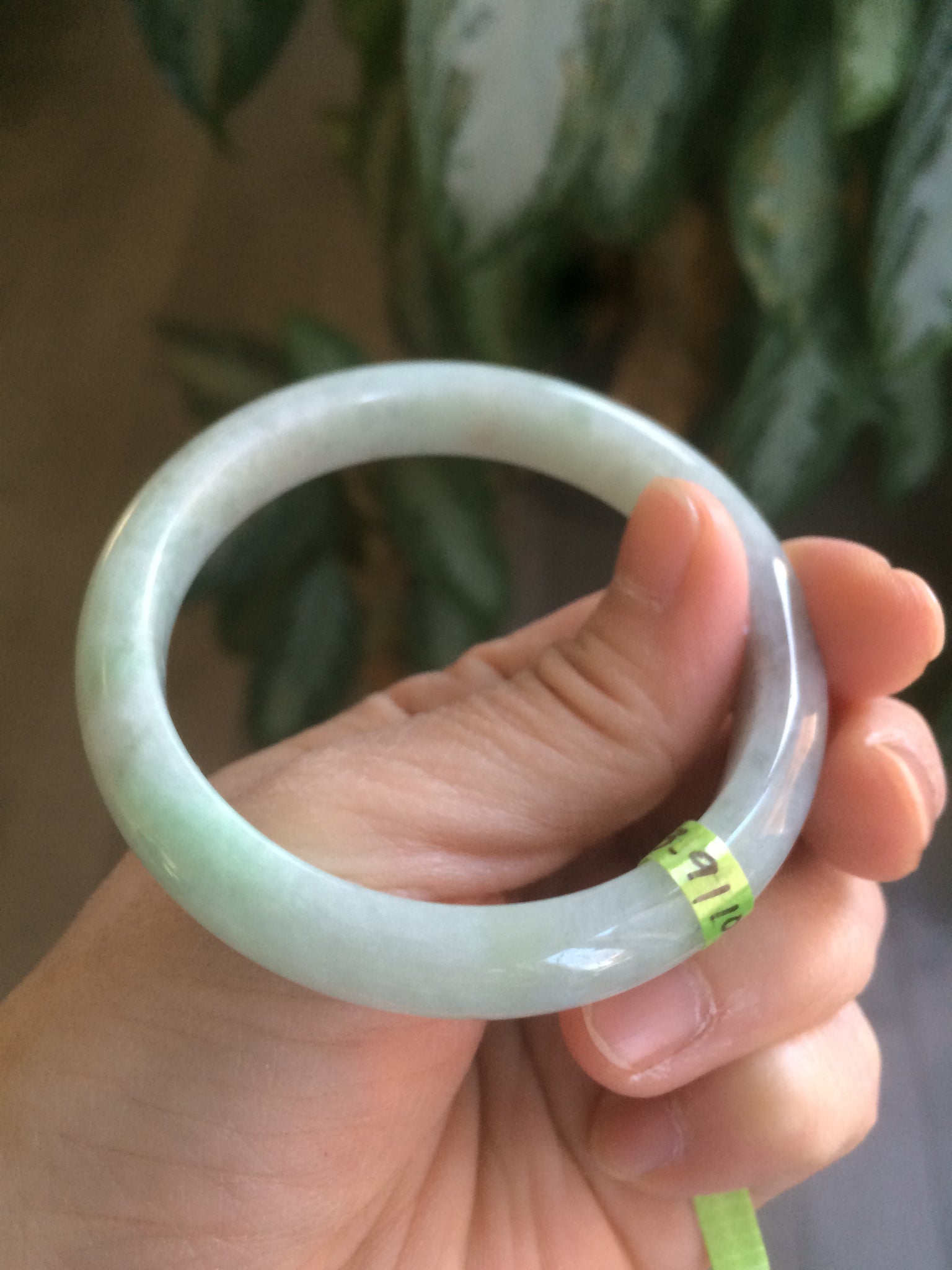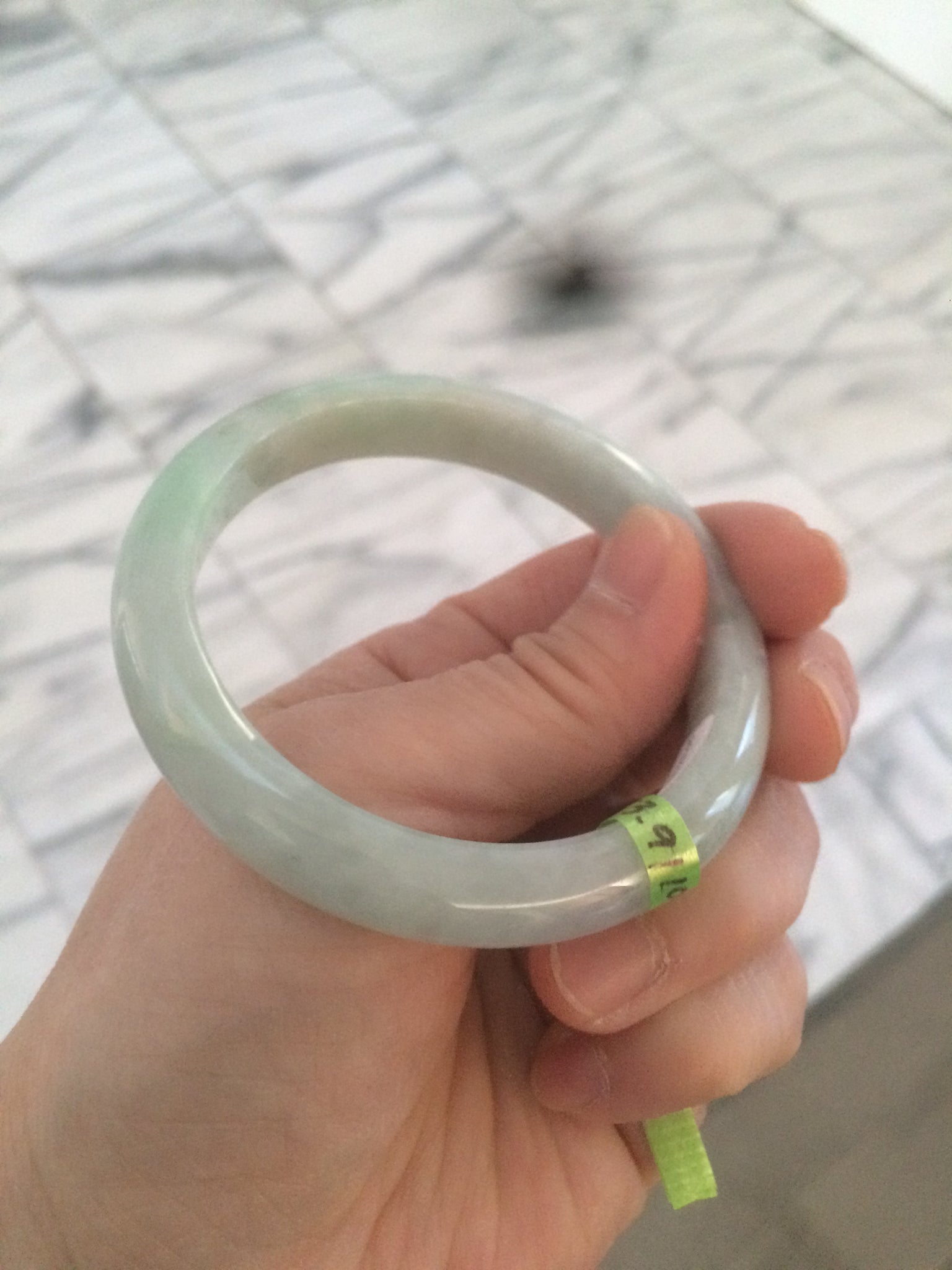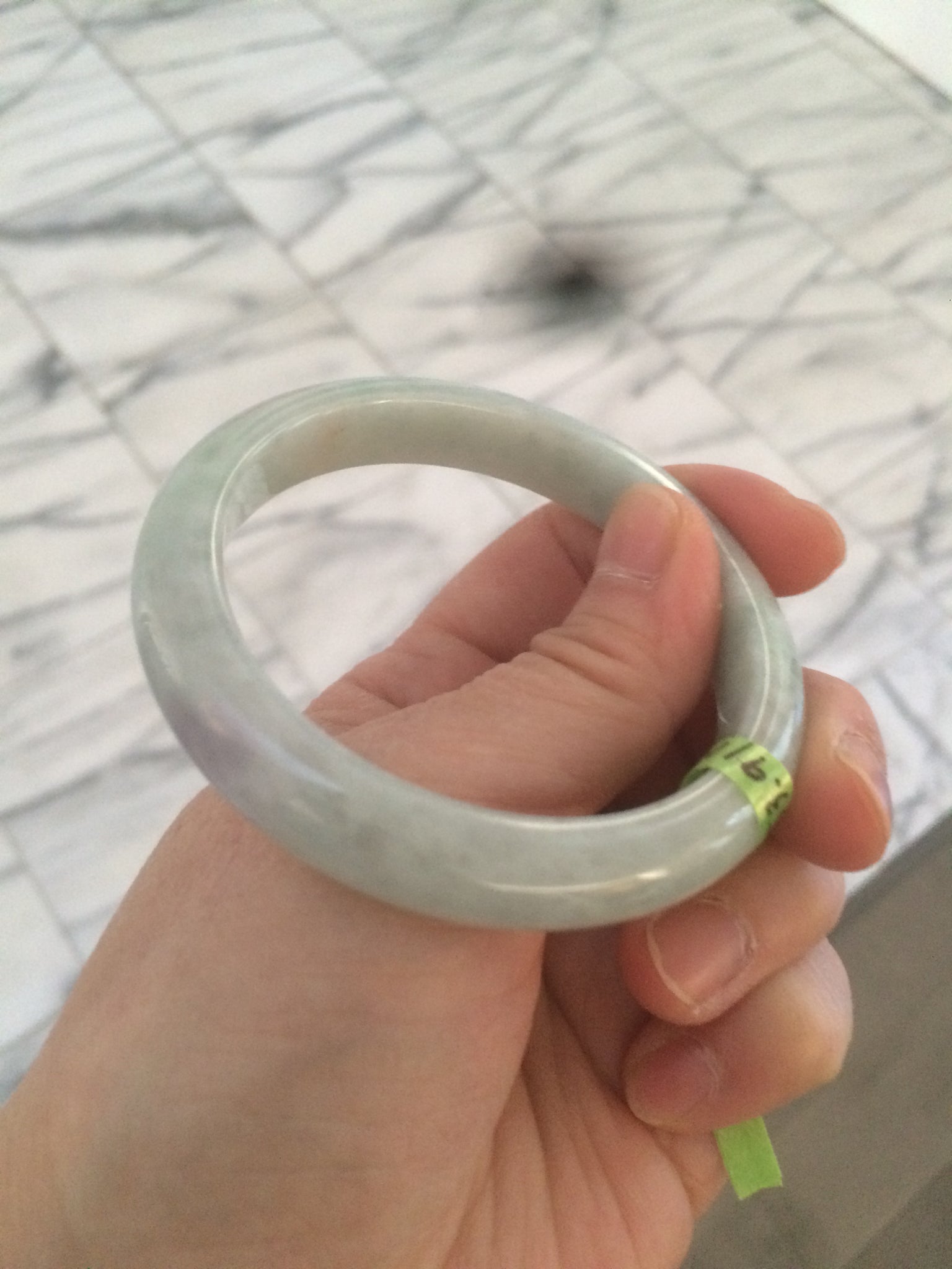 2 cracks with wax residue. One is around the bangle crack. This may decrease the firmness of the bangle. Tight fit is not recommended. One hairline. The texture is not so fine. You can see a lot of jade structures. The purple is extremely light. Lighter than photos.
