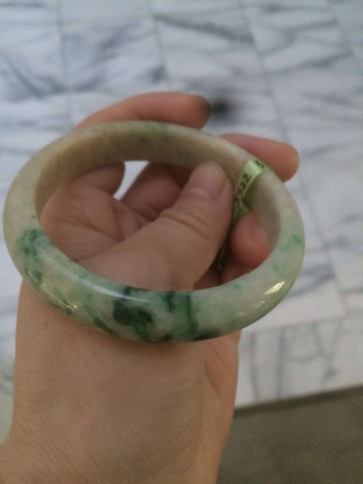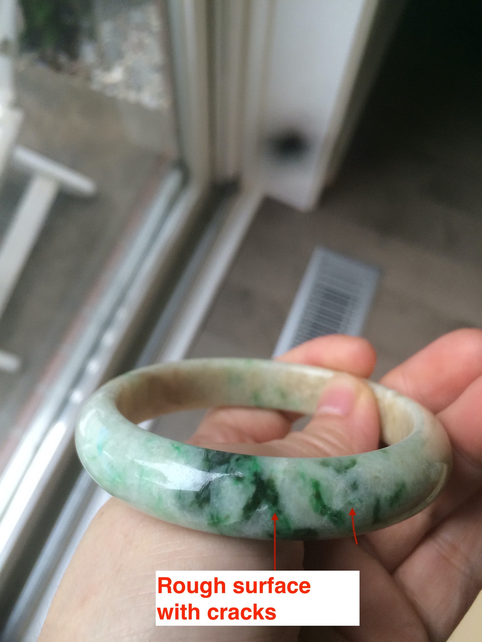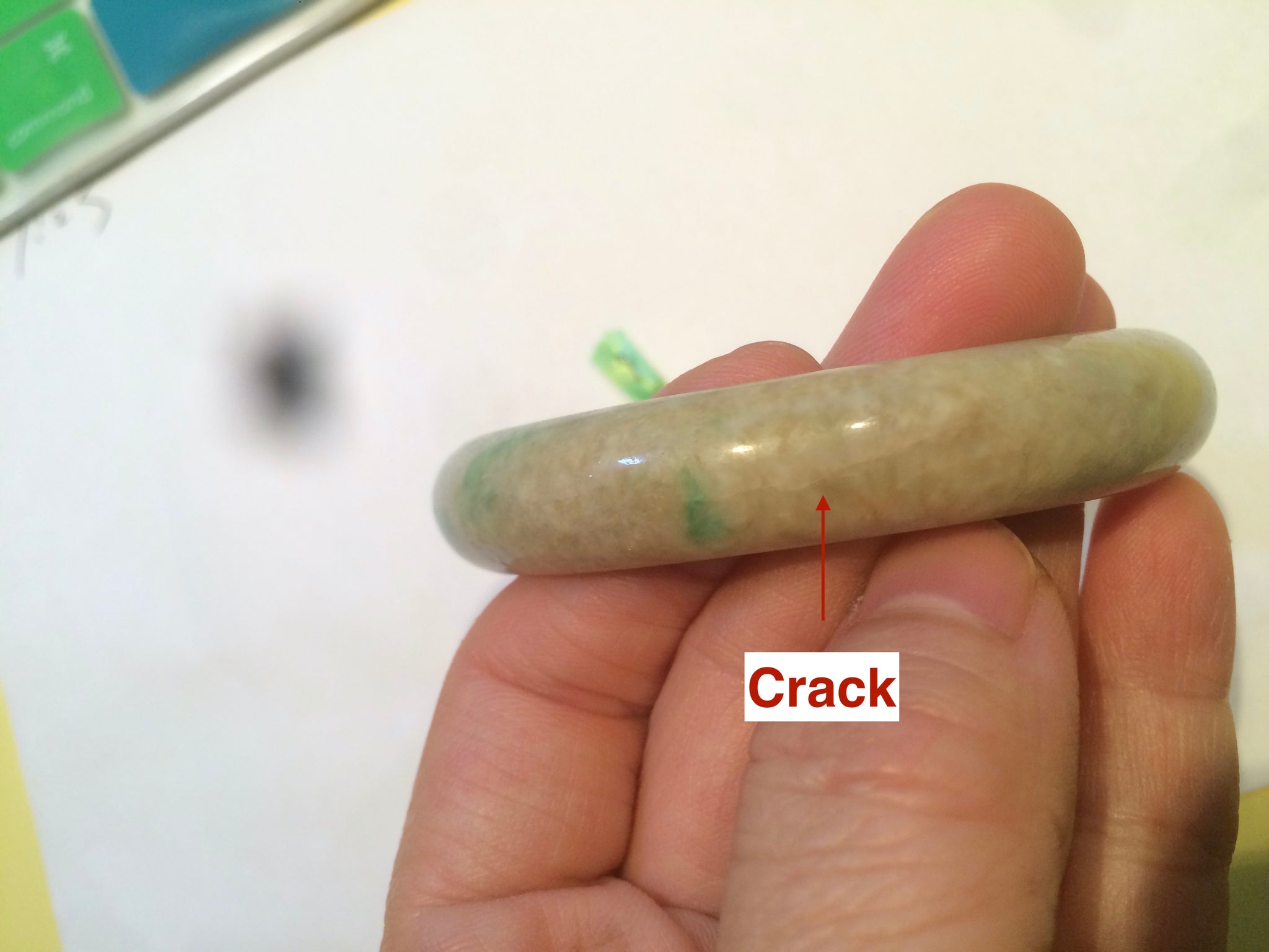 Some surface cracks. The bangle surface is not so smooth. Some rough surfaces have tiny traces of wax residue. The green-yellow color is nice, but not transparent and watery. The texture is not so fine, kind of dry and coarse.