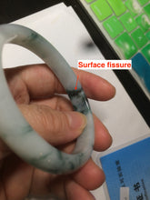 Tow cracks. One surface fissure. Some cotton lines or hairlines, one of them is around the bangle. The bangle is still solid. Cotton areas and spots.