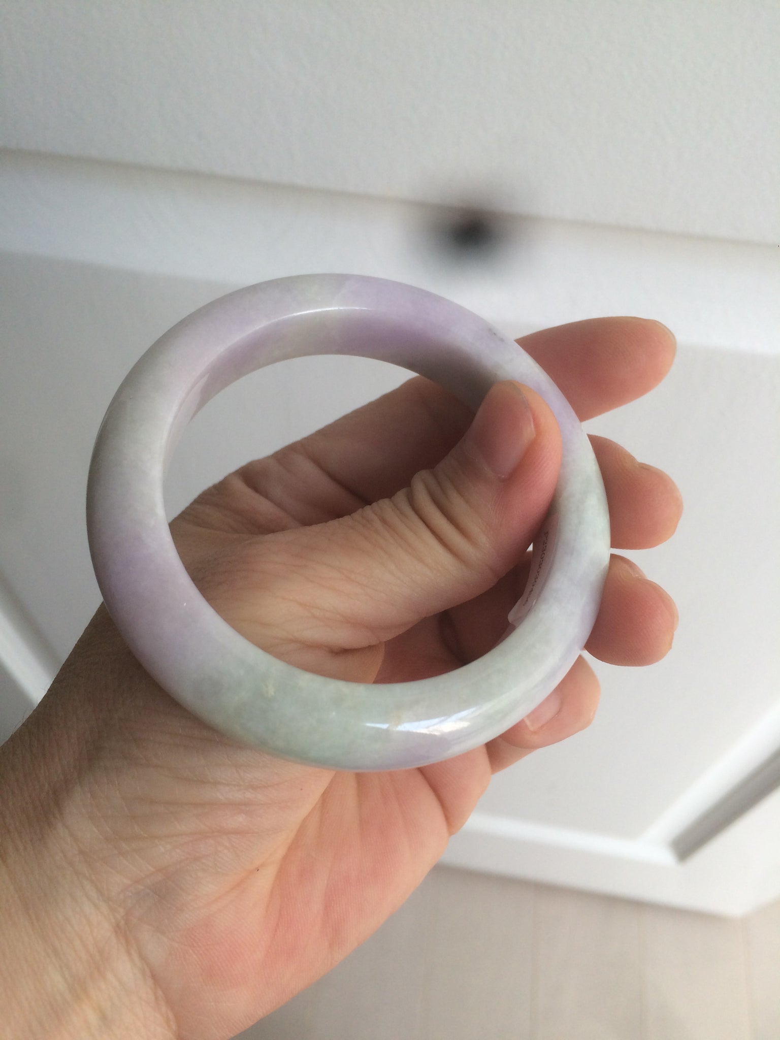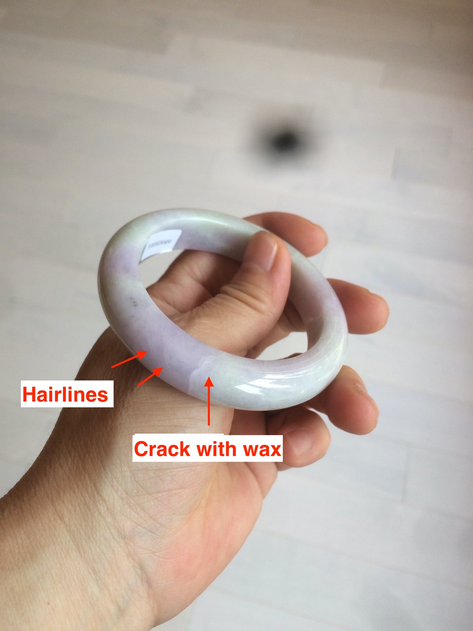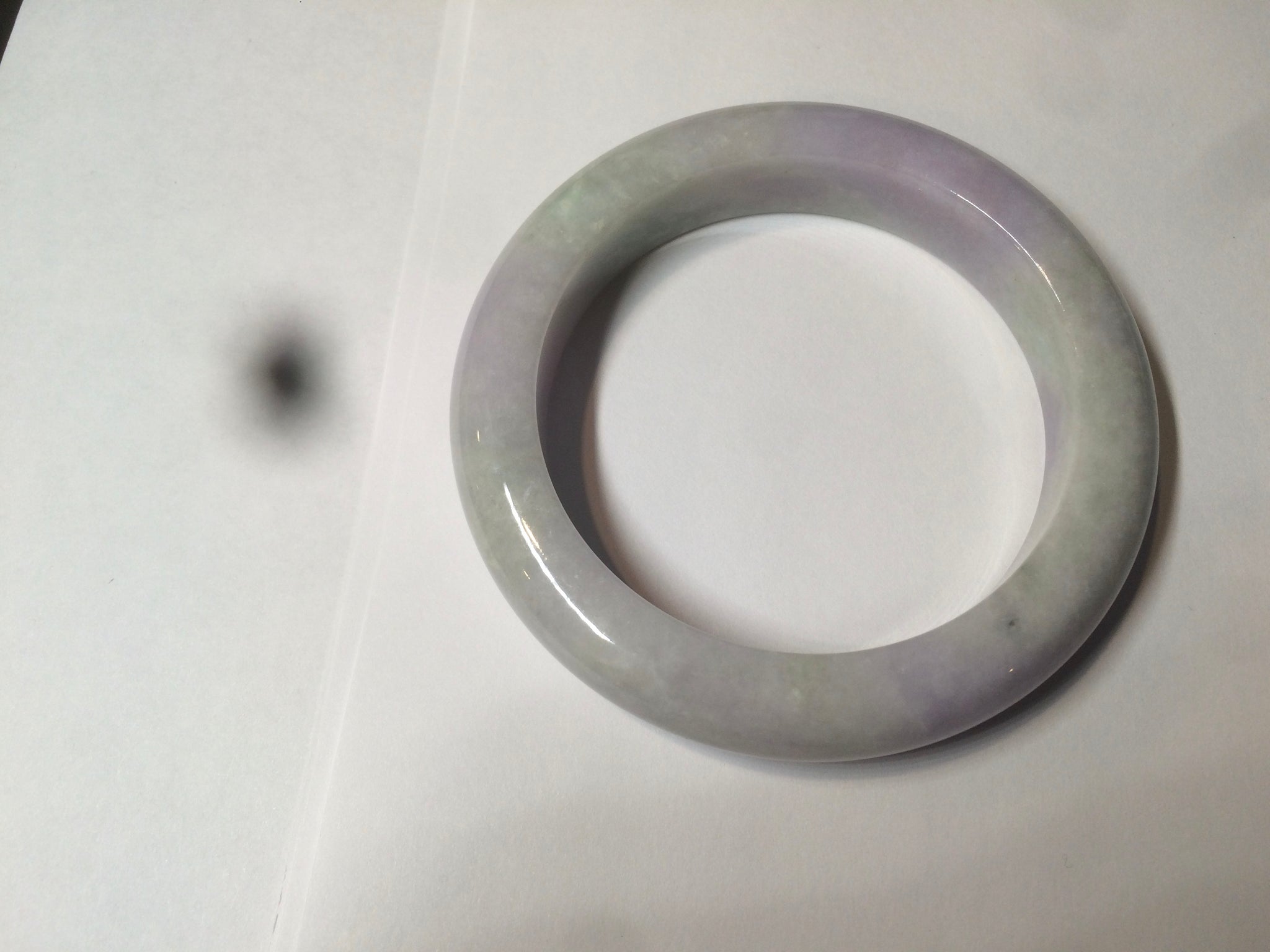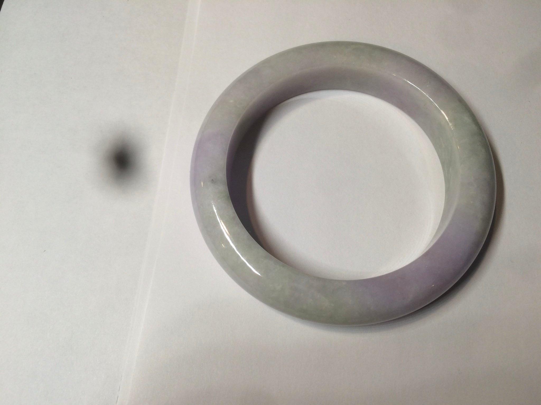 One crack with wax. The bangle is solid. Some hairlines and cotton lines. Cotton areas and spots. Some tiny rough spots with wax. Not transparent. The purple is lighter than in the photos.