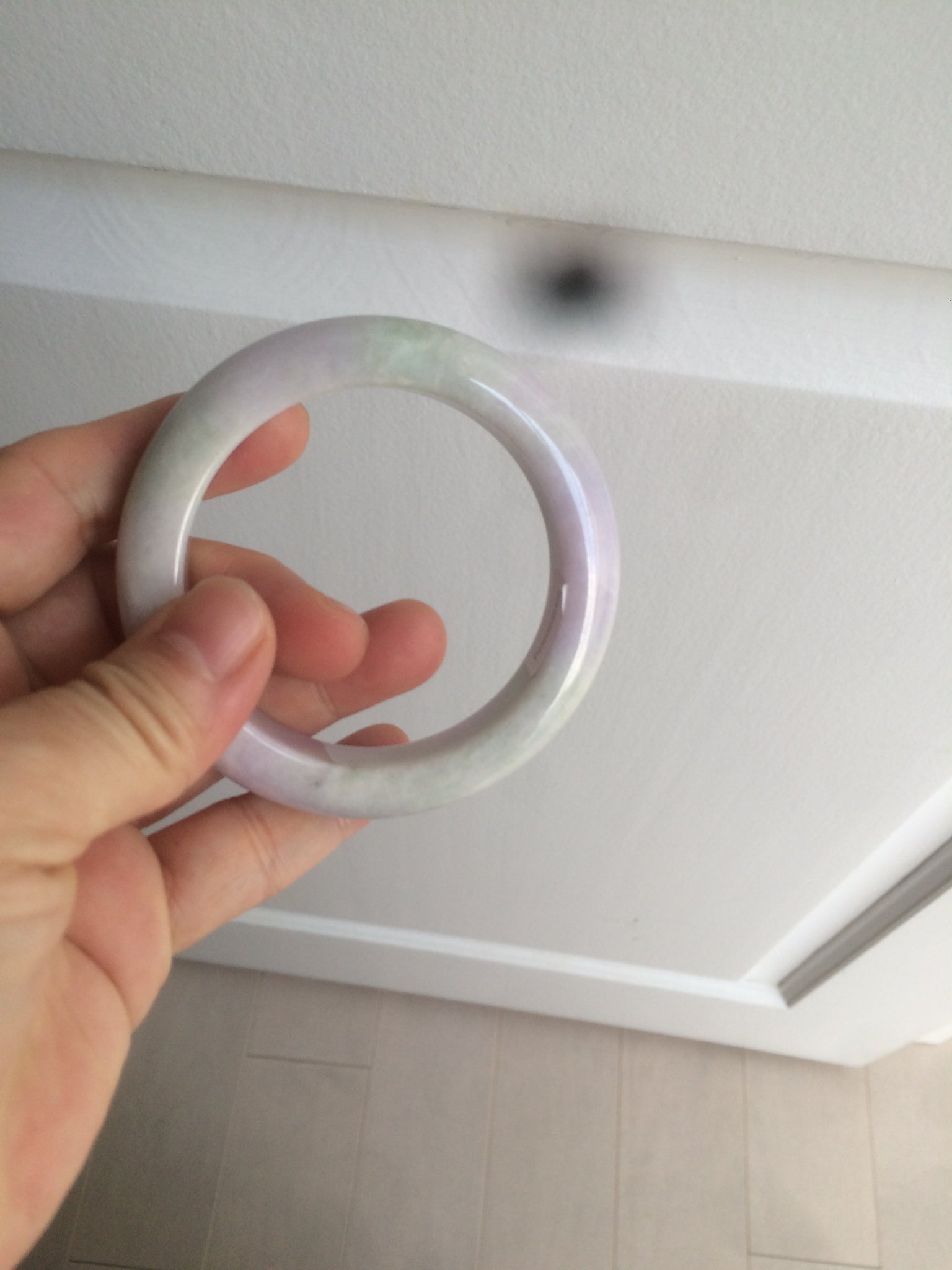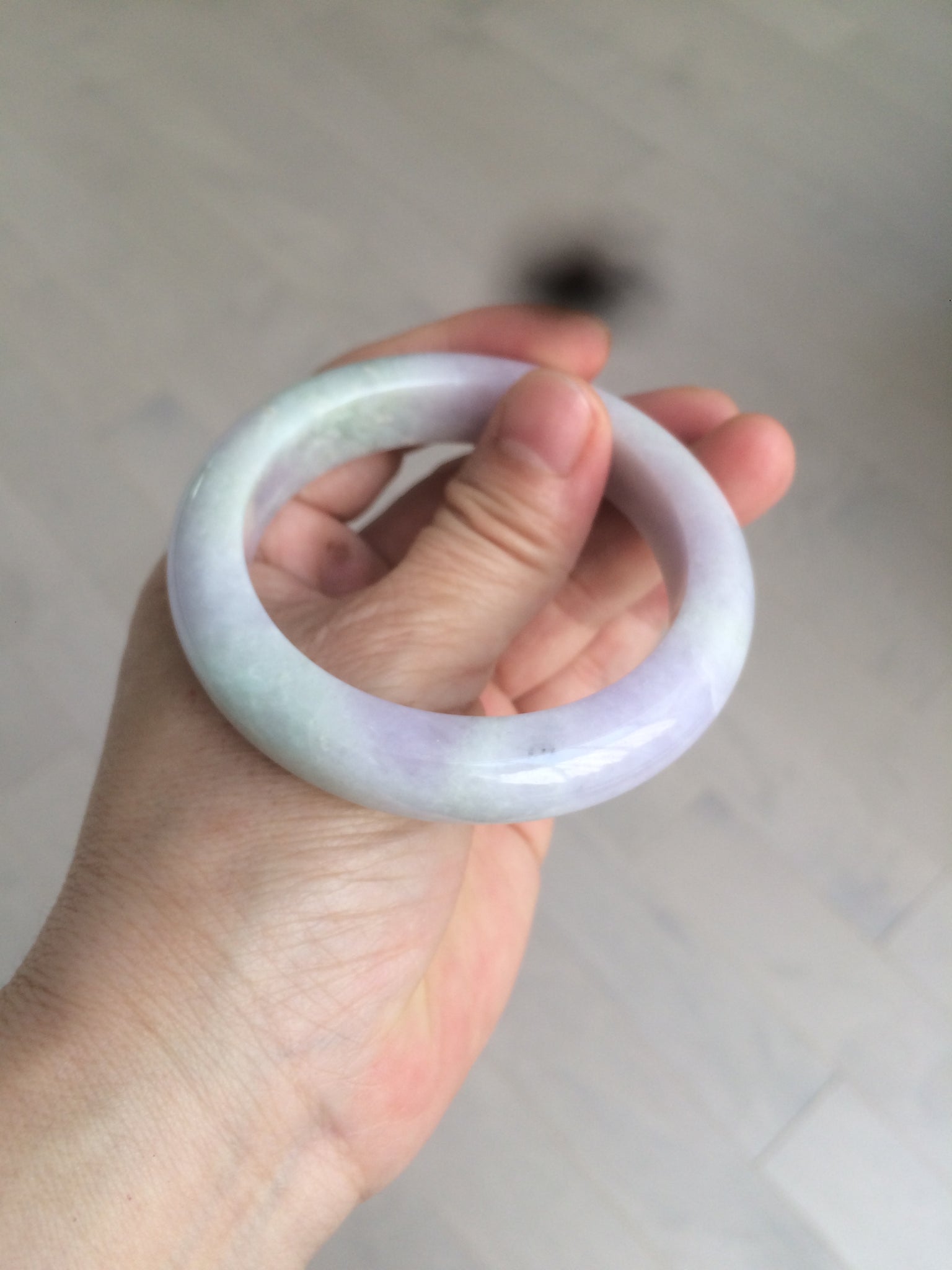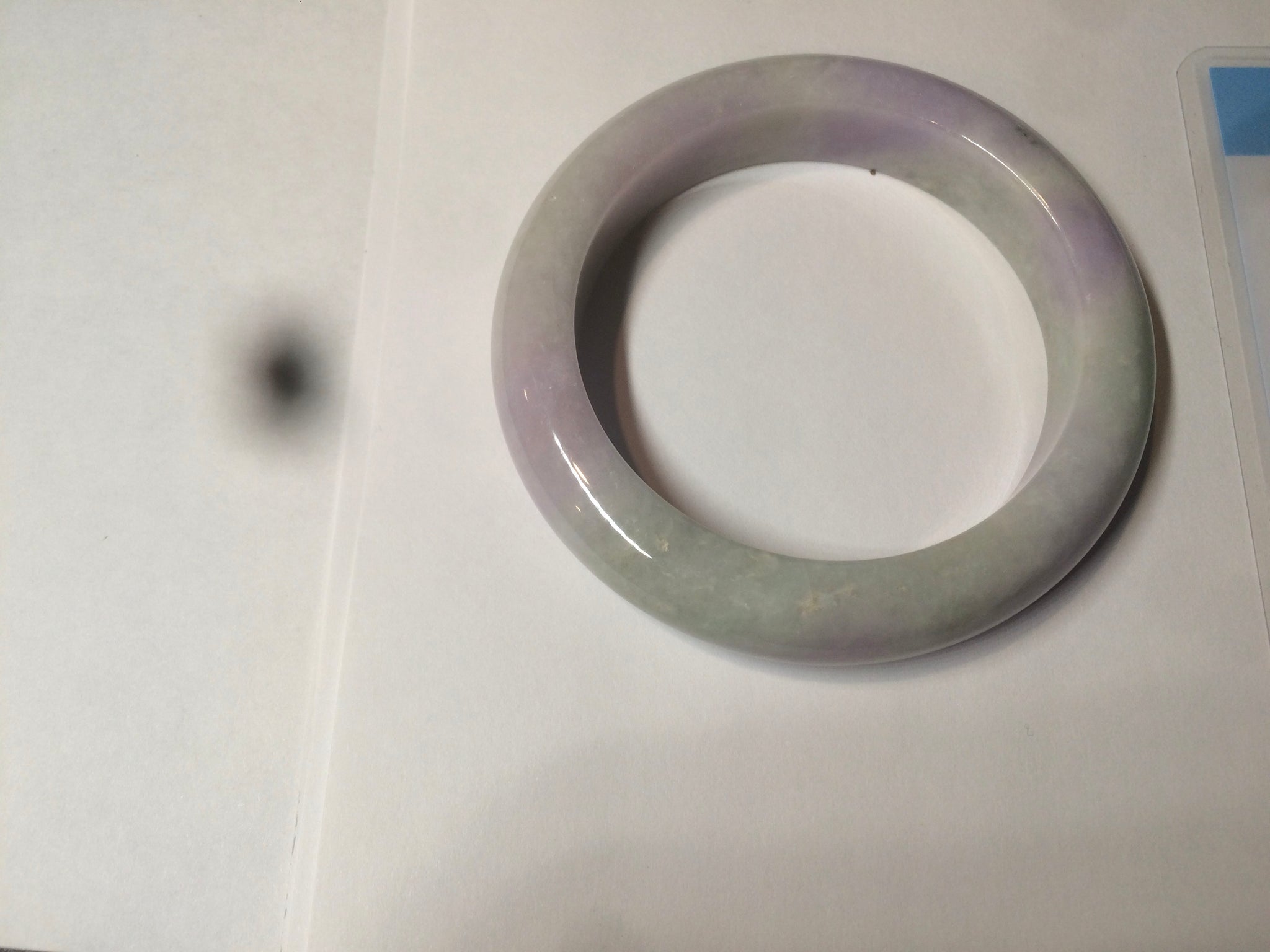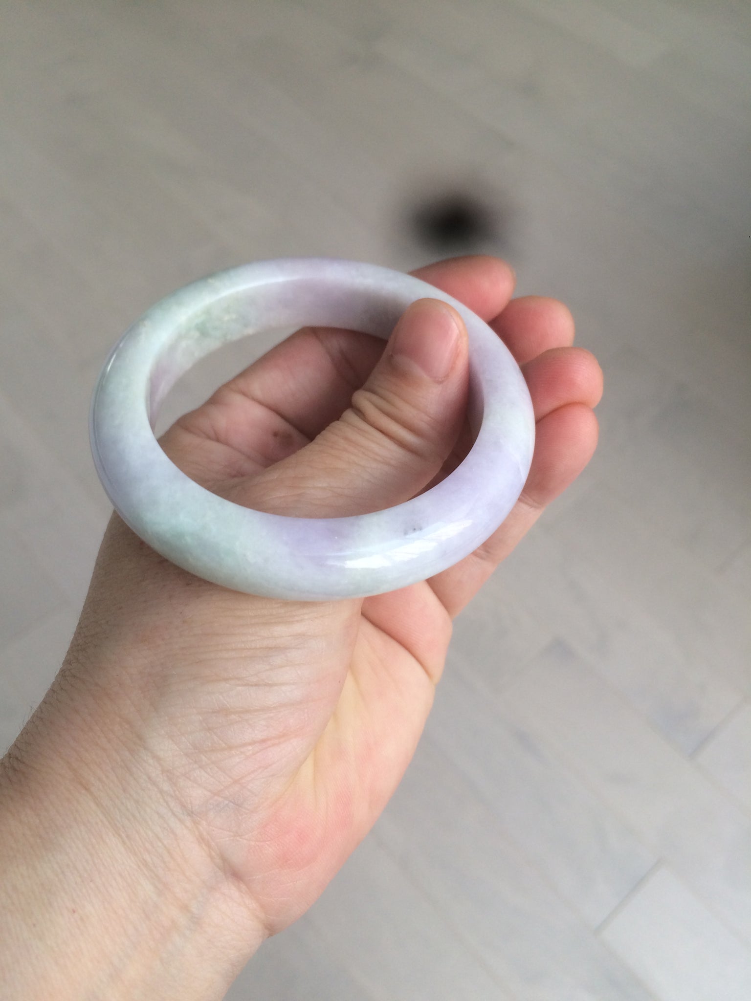 One crack with wax. The bangle is solid. Some hairlines and cotton lines. Cotton areas and spots. Some tiny rough spots with wax. Not transparent. The purple is lighter than in the photos.