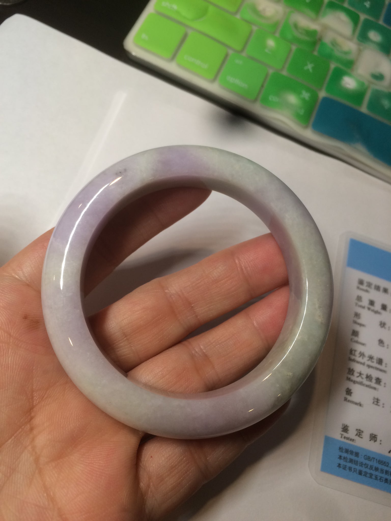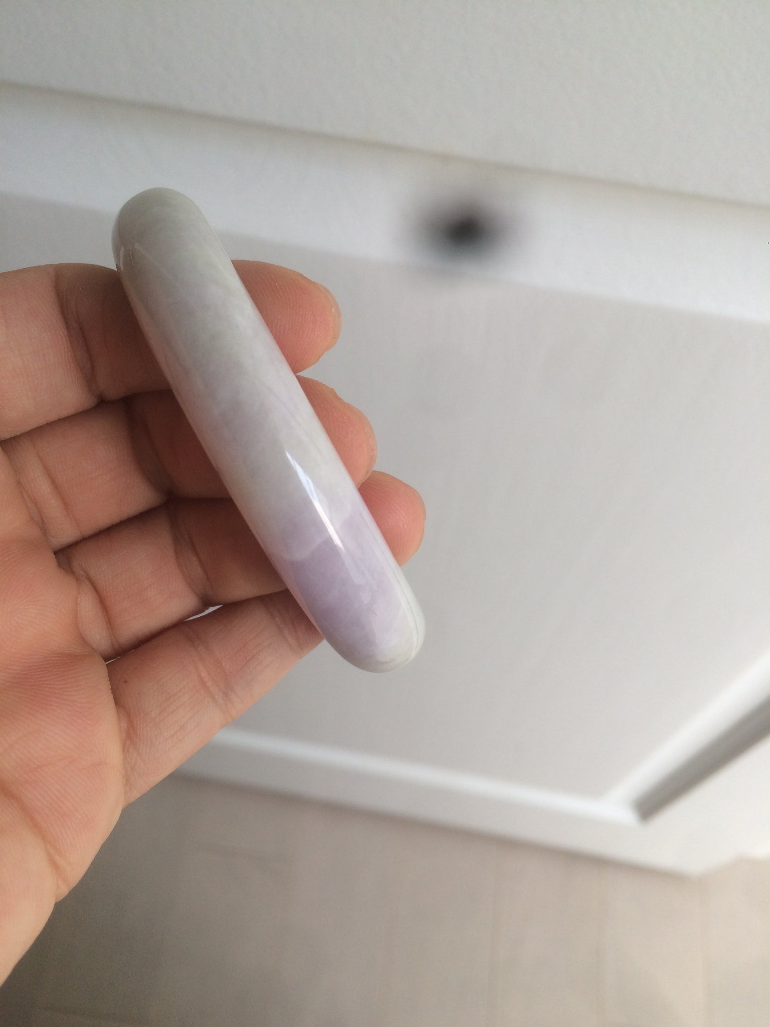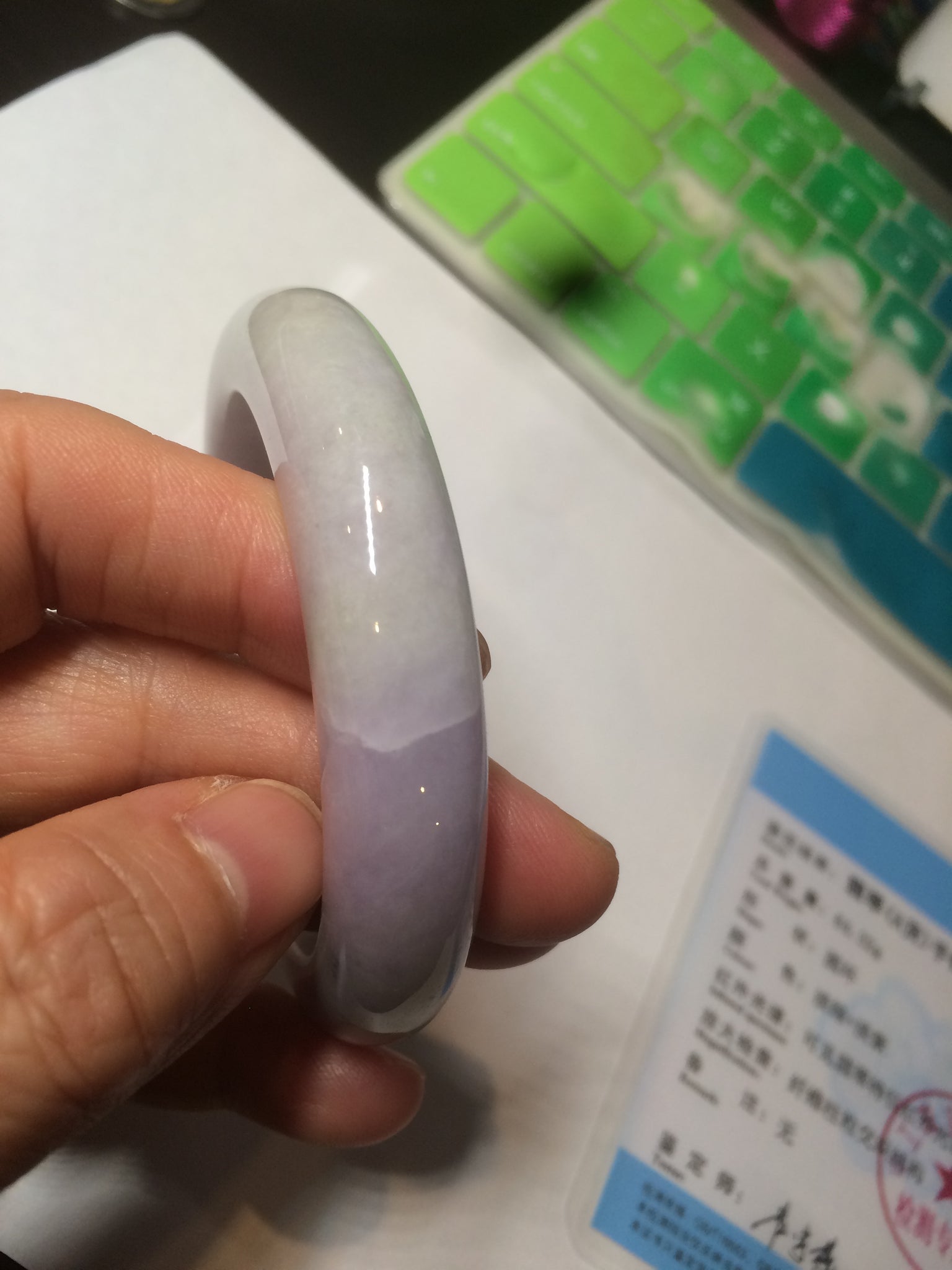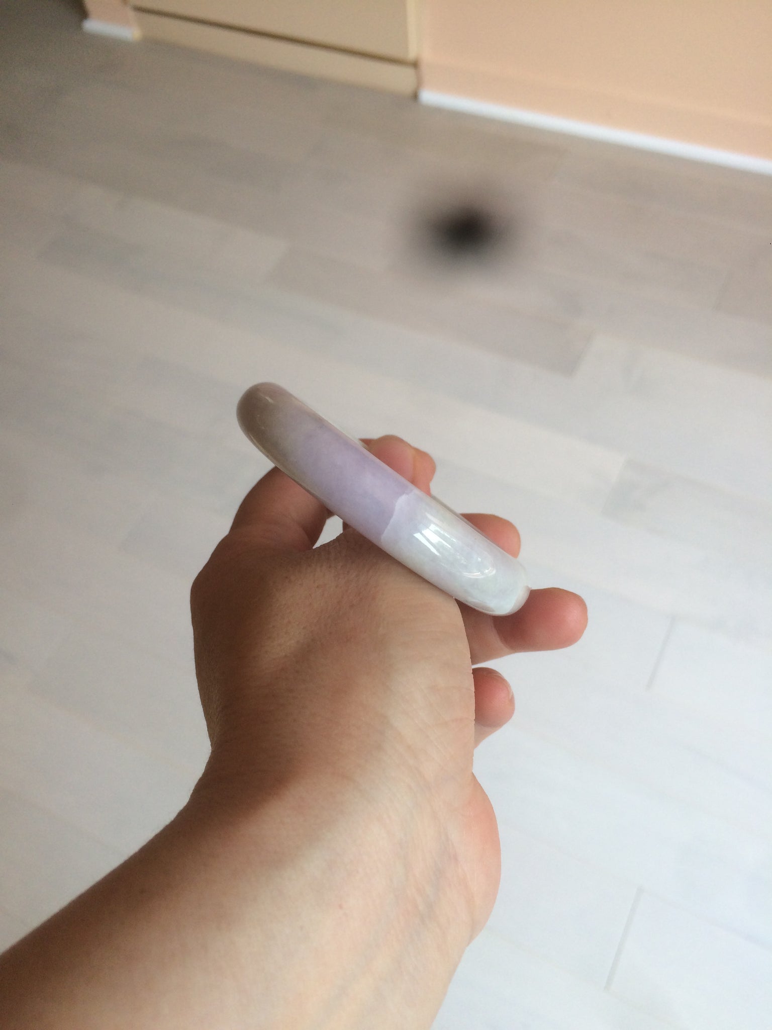 One crack with wax. The bangle is solid. Some hairlines and cotton lines. Cotton areas and spots. Some tiny rough spots with wax. Not transparent. The purple is lighter than in the photos.