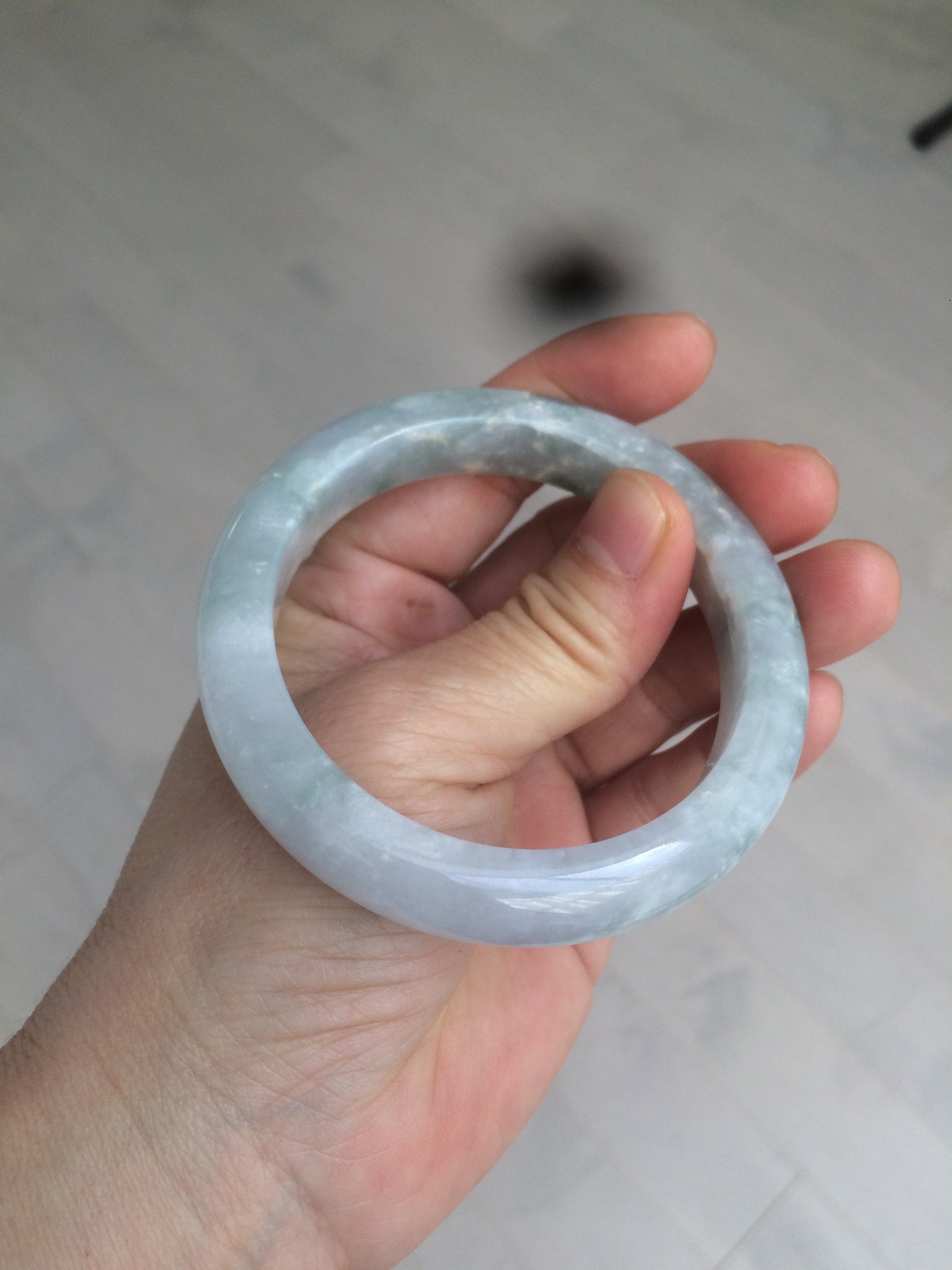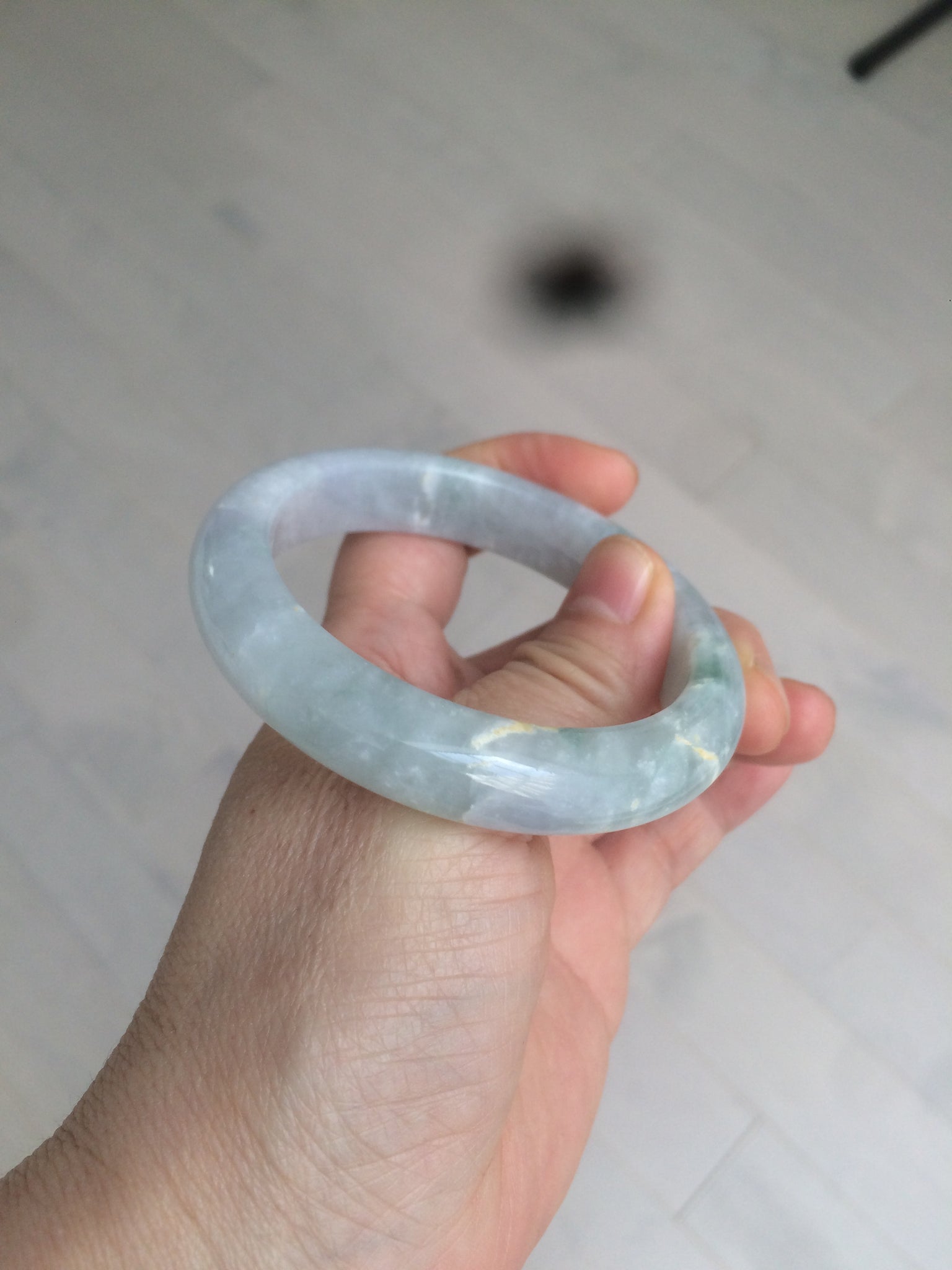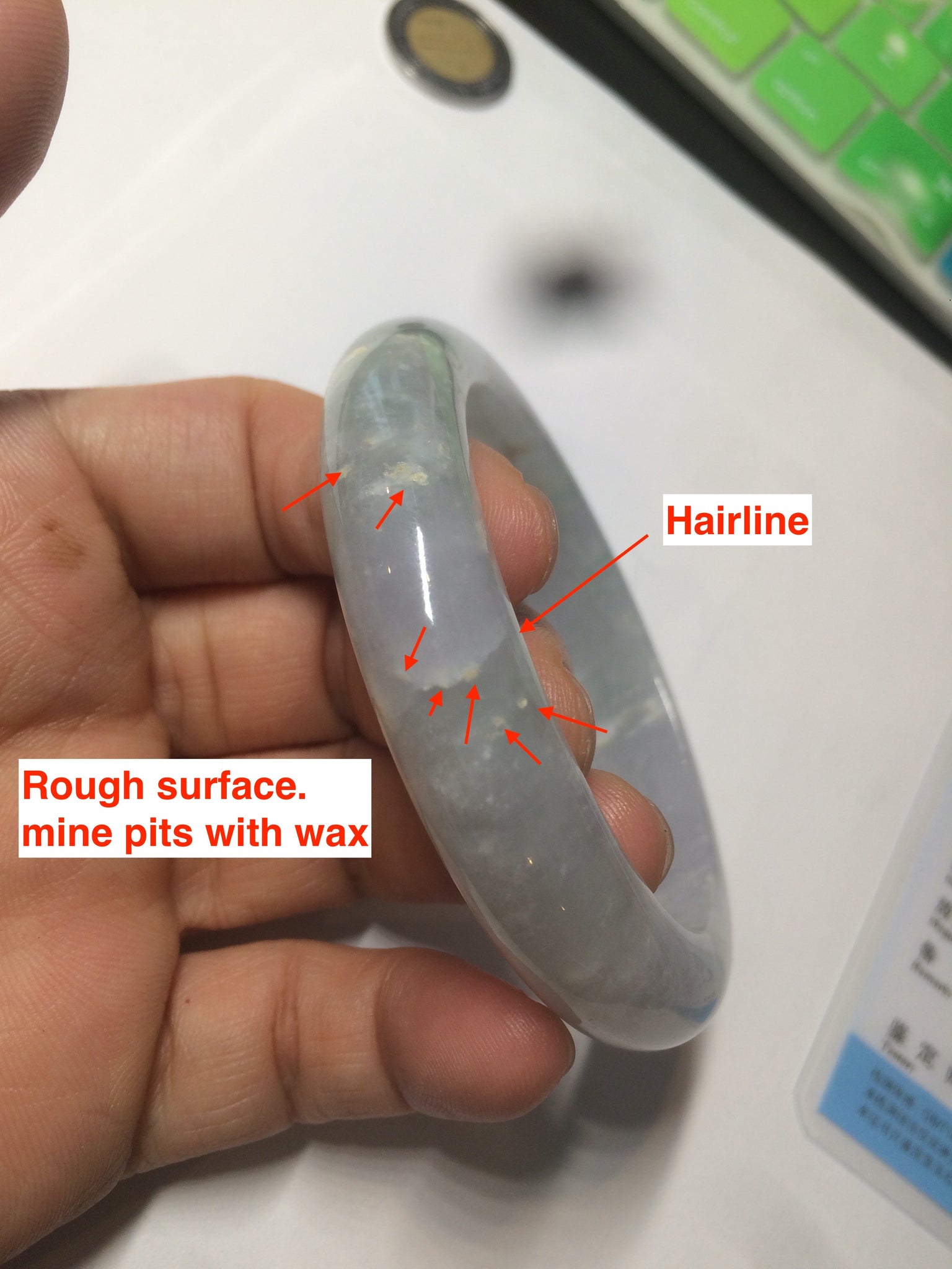 Some rough surfaces or mine pits with wax. Two hairlines, one is long u shape. Won't influence the firmness. Cotton areas and cotton spots. The purple is super light. Lighter than in photos.