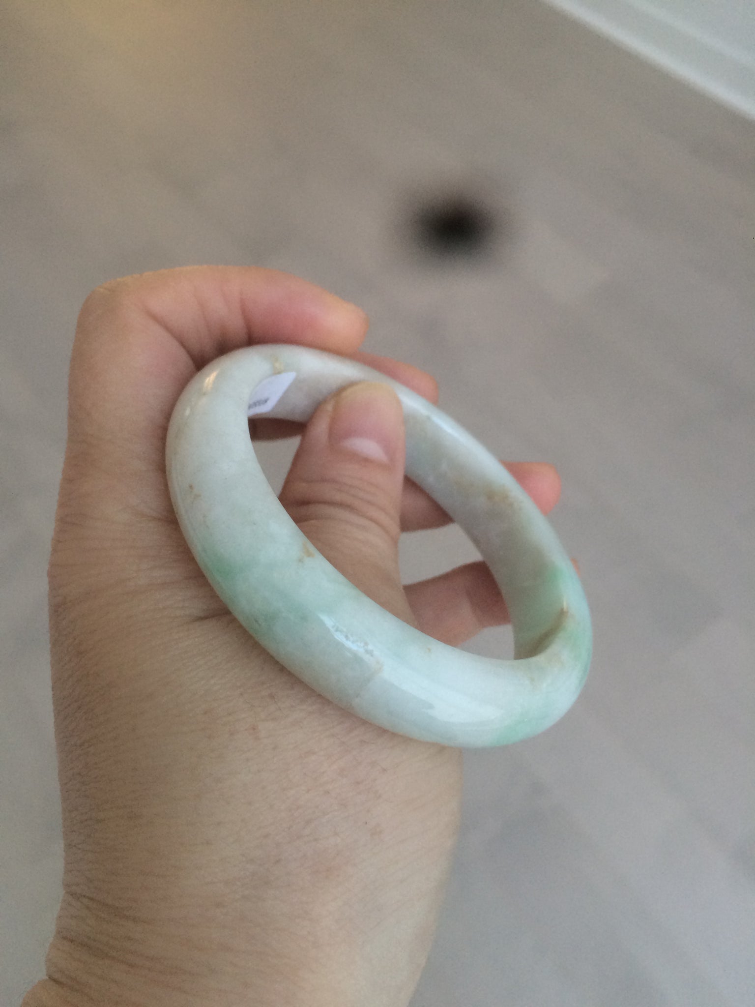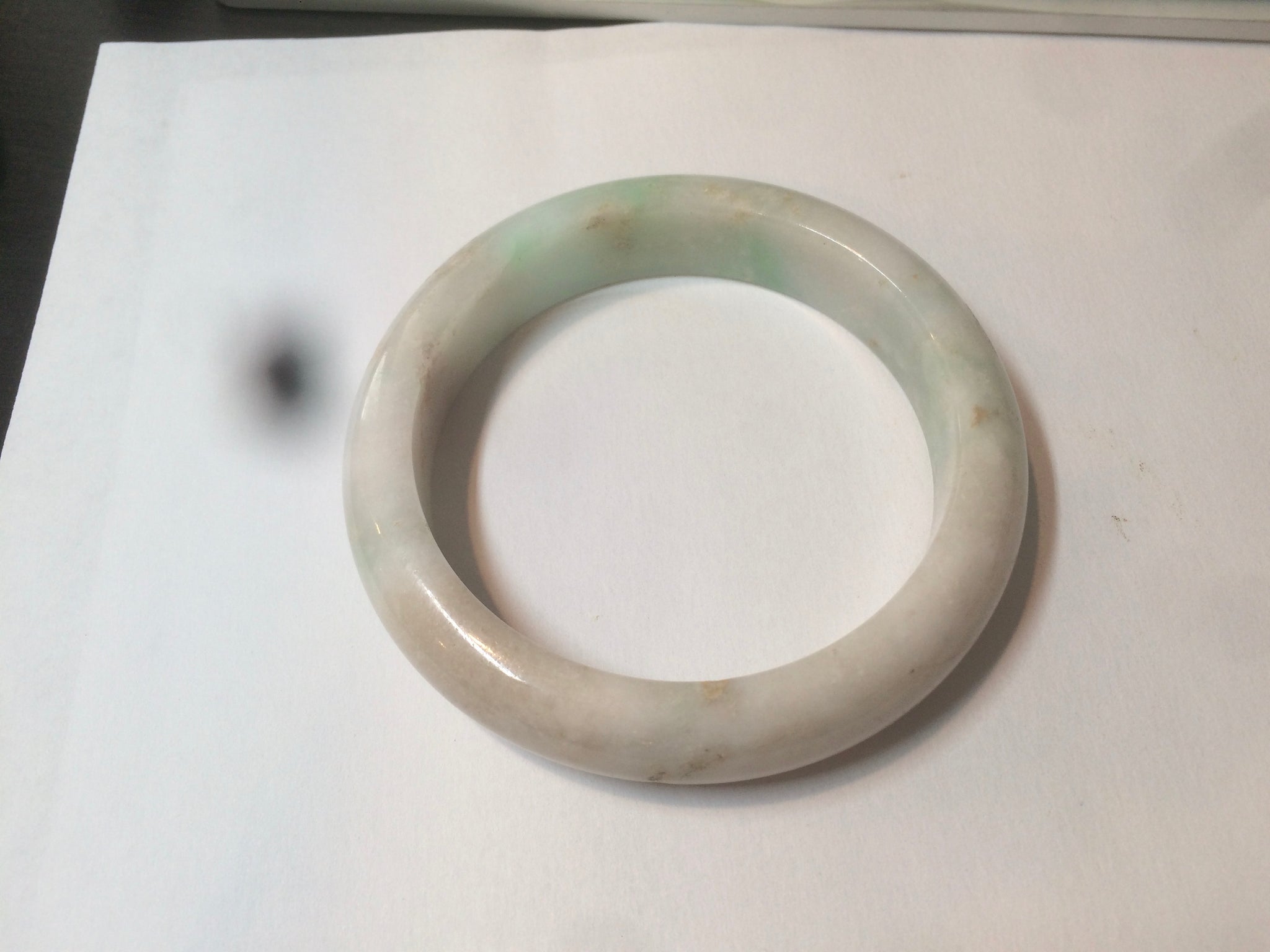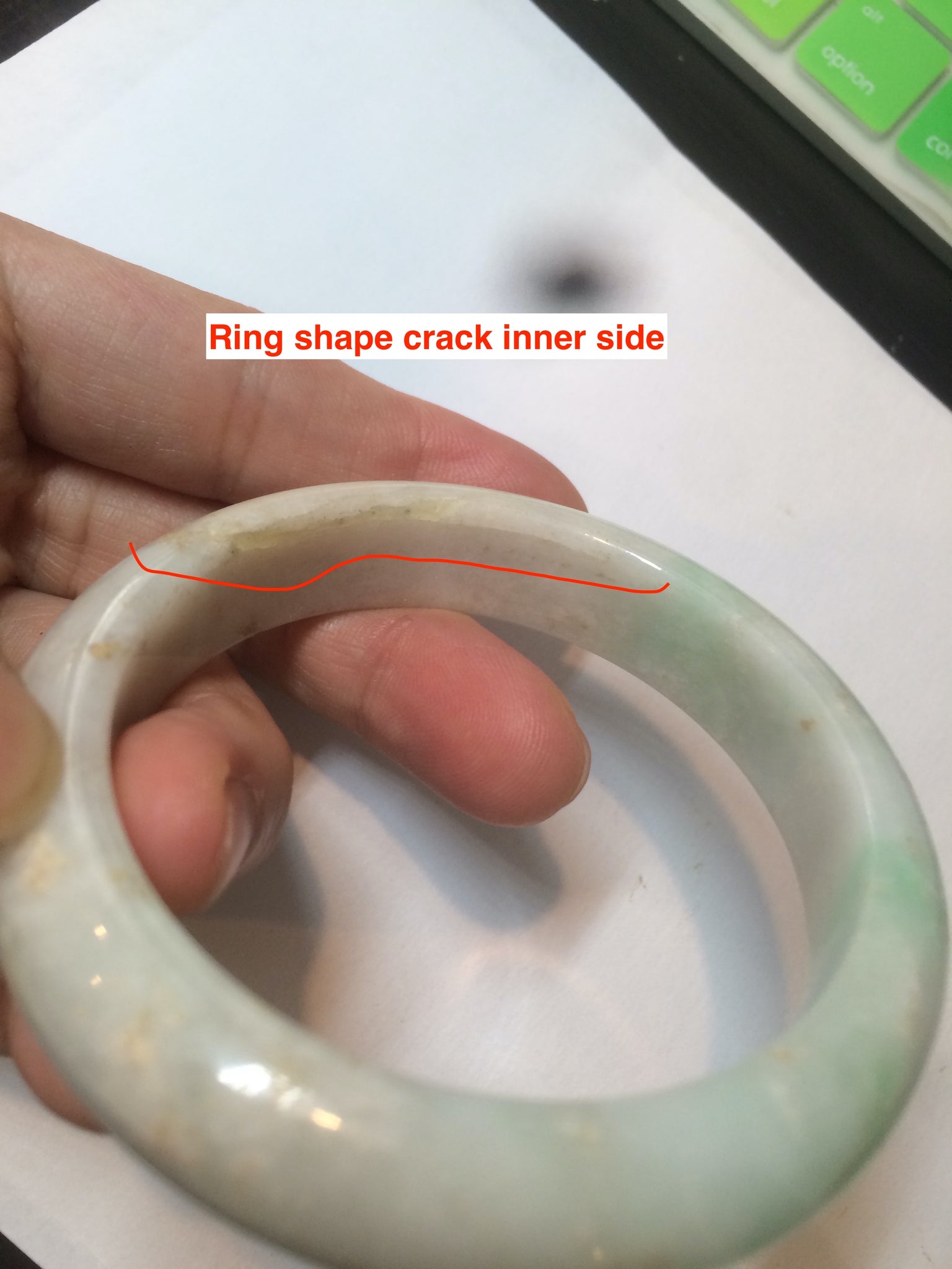 Some cracks with wax residue. One crack is ring shape. Won't influence the firmness. One hairline. Some rough surfaces with wax. Some small mine pits. Black spots and cotton spots. Brown jade area.