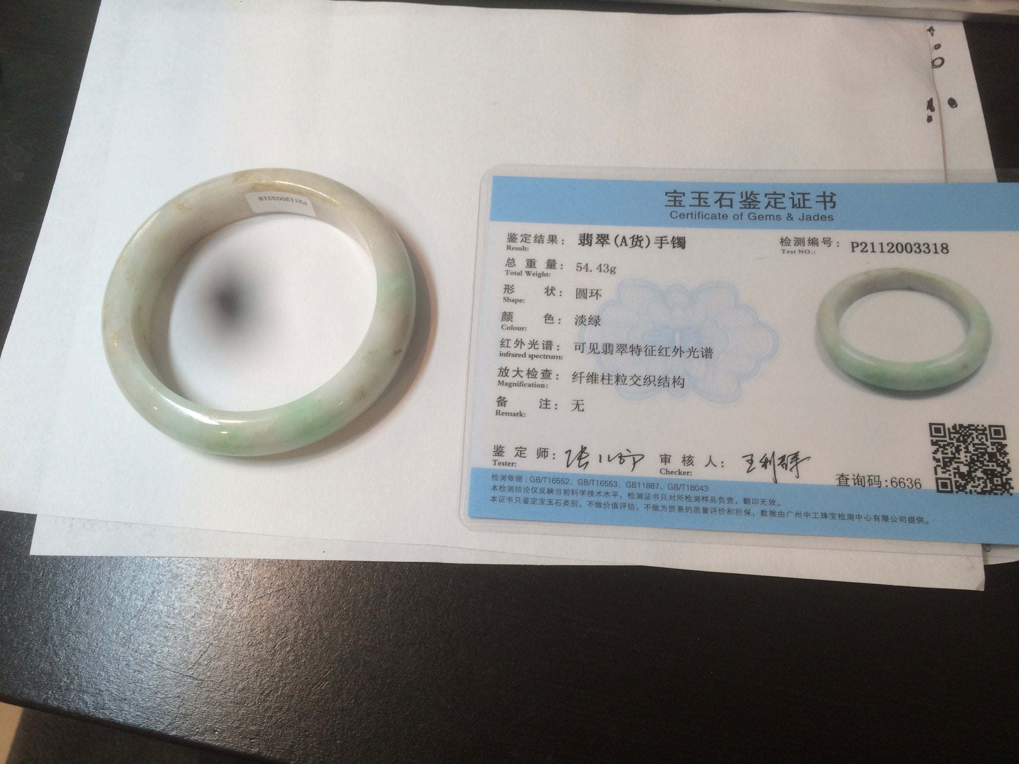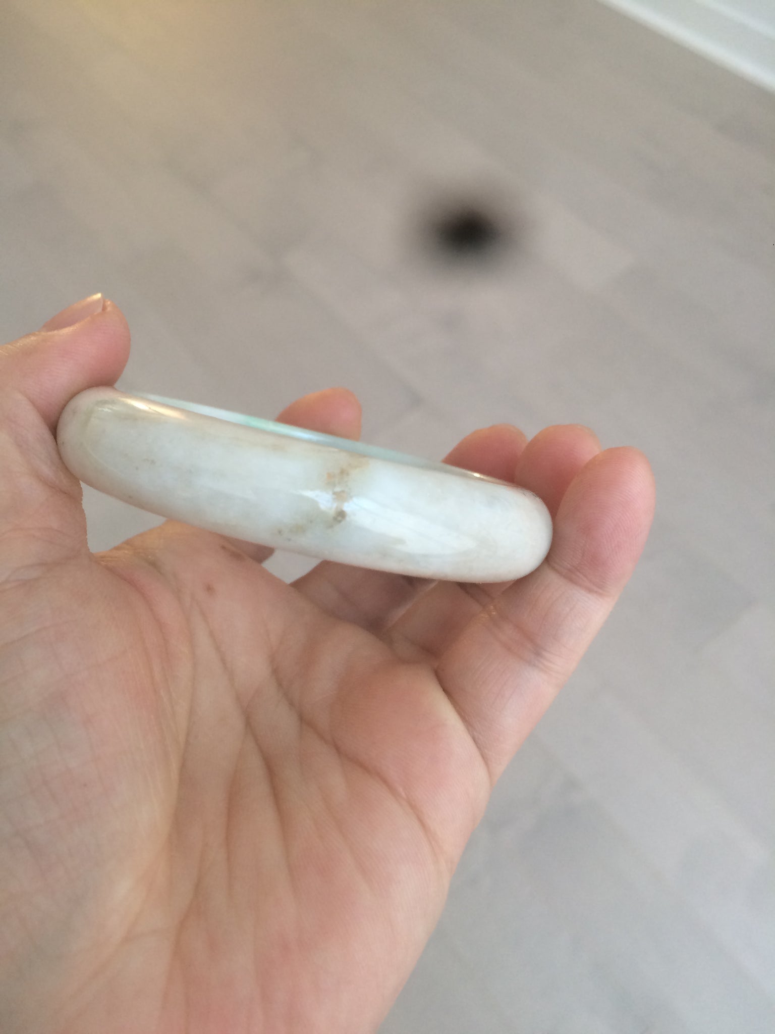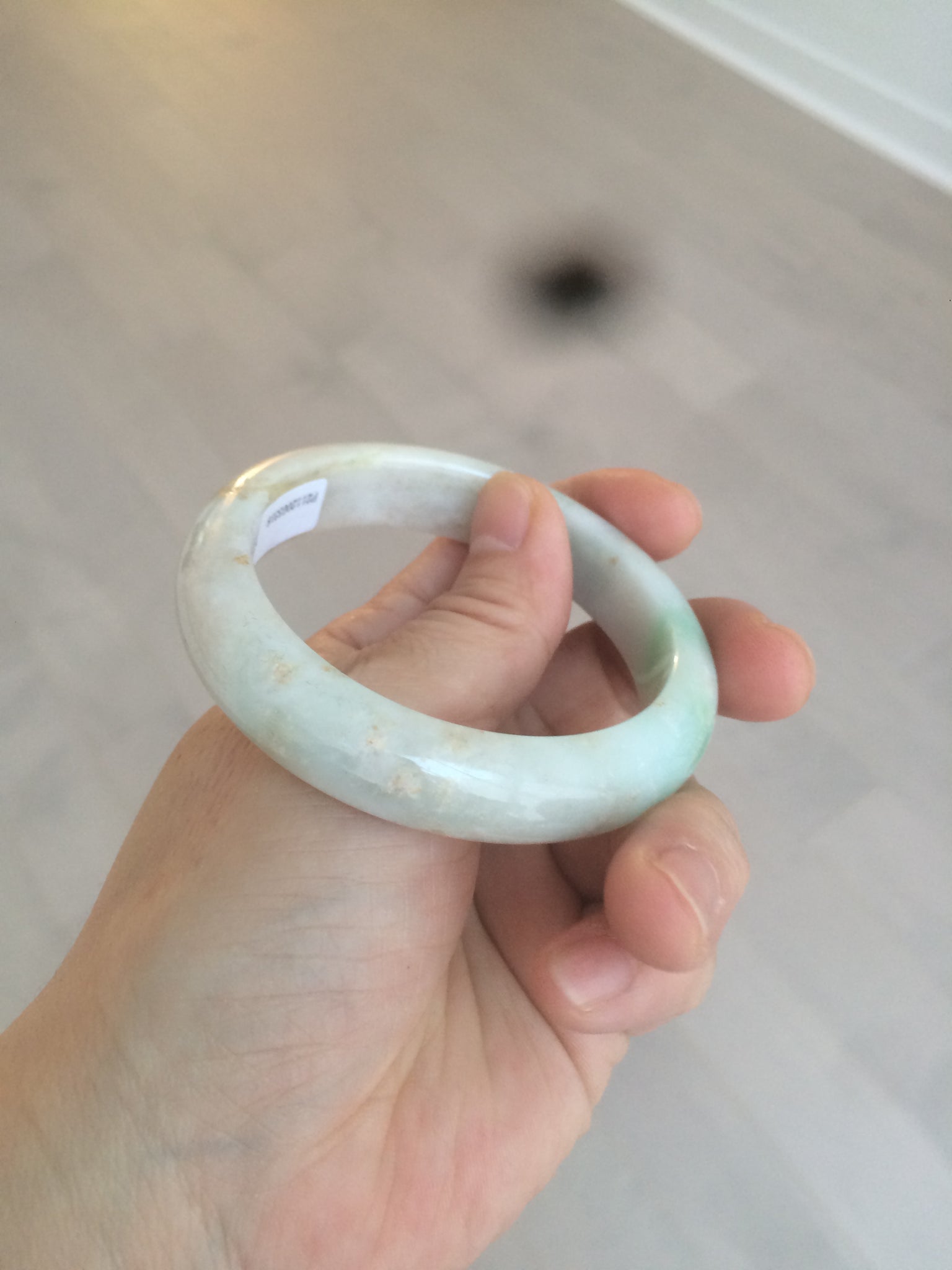 Some cracks with wax residue. One crack is ring shape. Won't influence the firmness. One hairline. Some rough surfaces with wax. Some small mine pits. Black spots and cotton spots. Brown jade area.