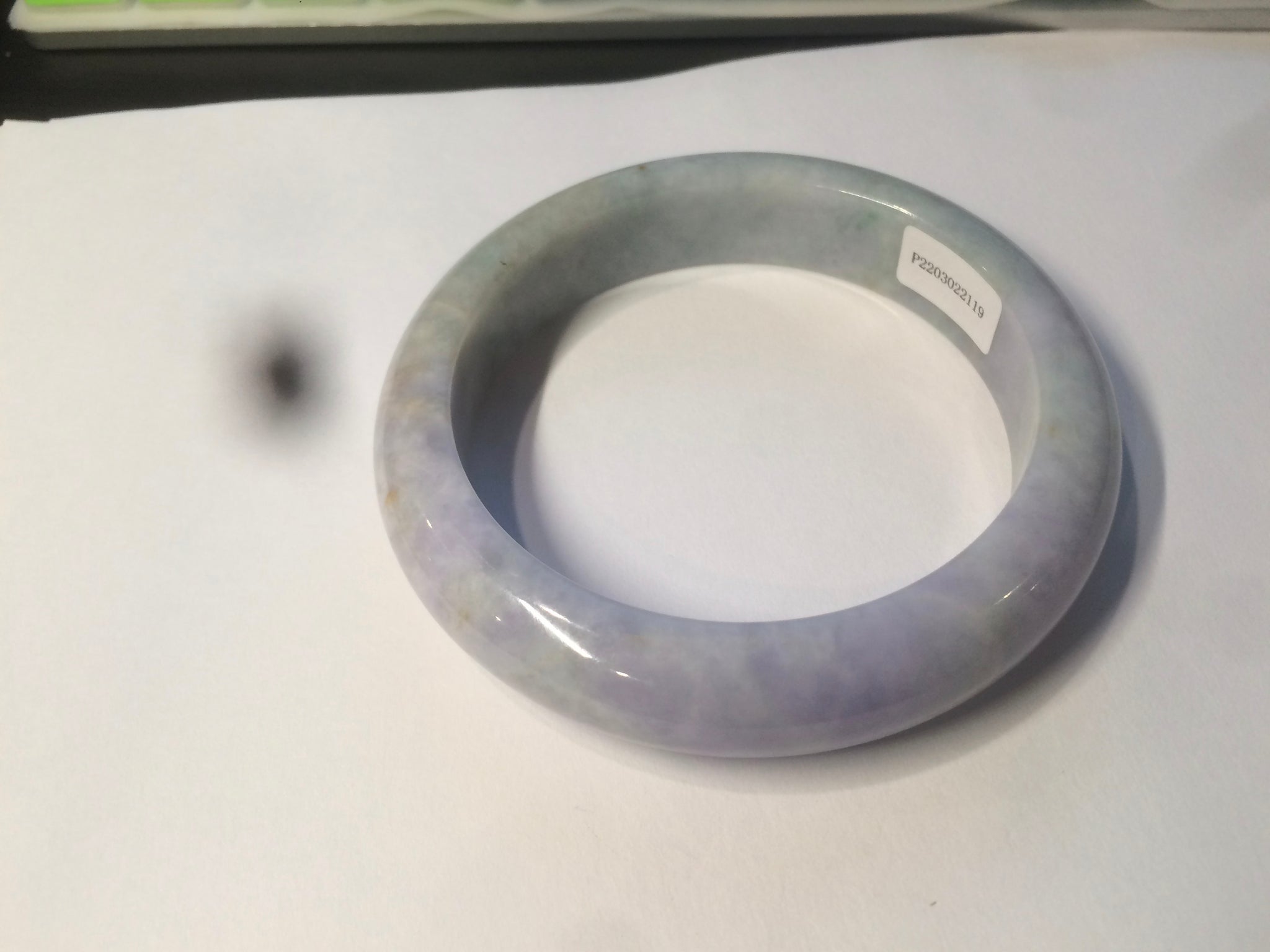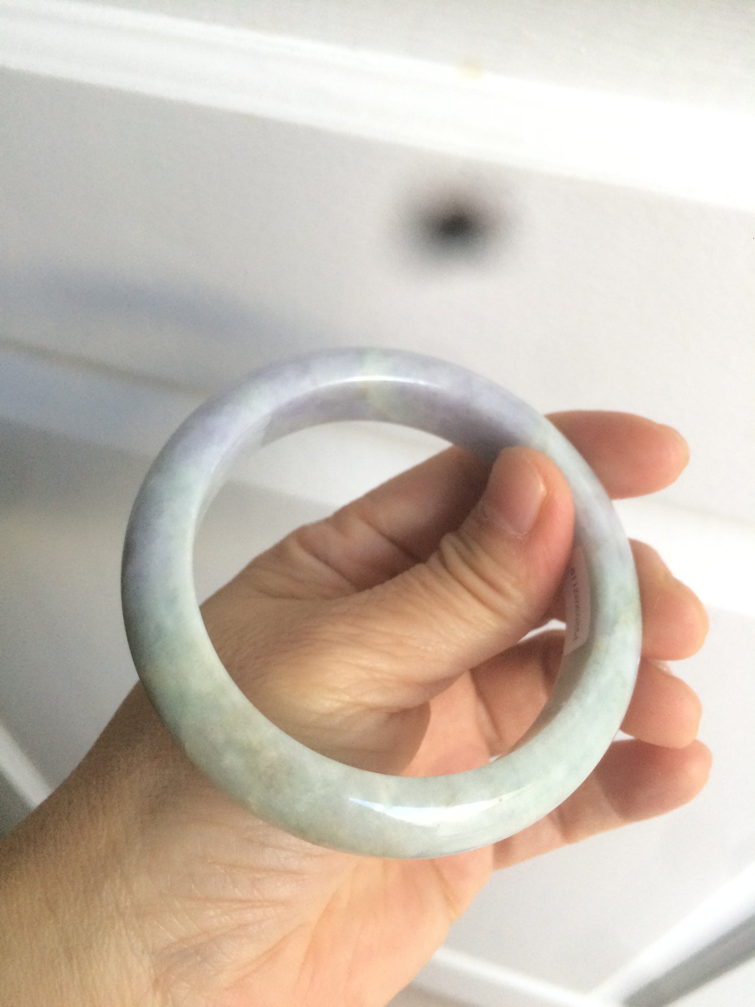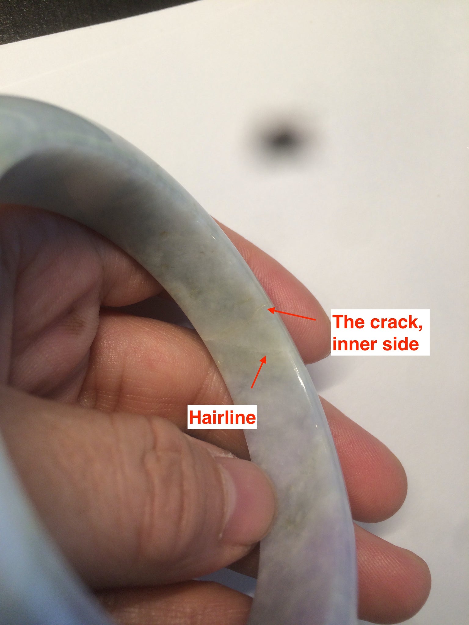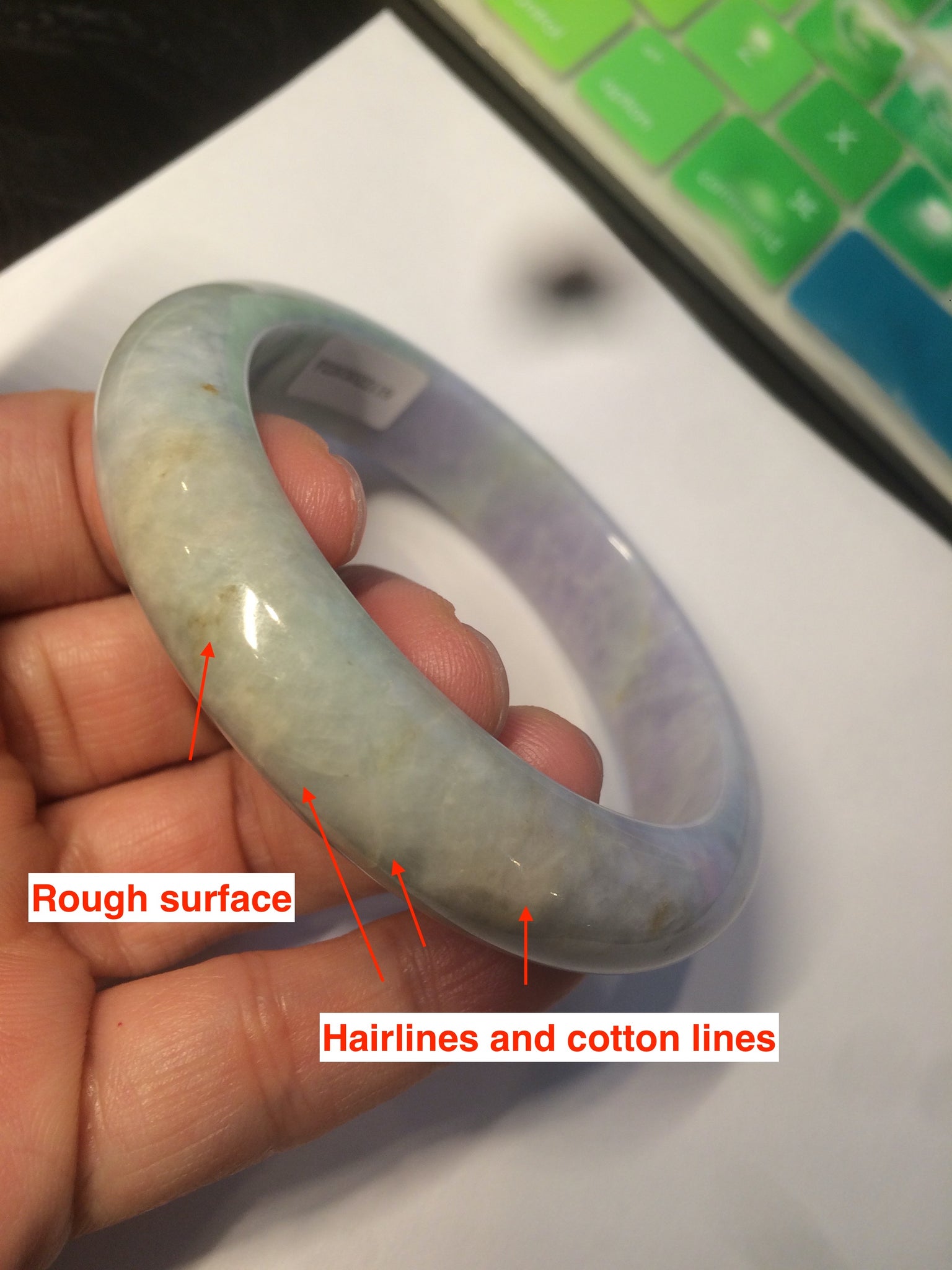 1 crack. The bangle is still firm. Quite a lot of cotton lines, cotton spots, and cotton areas (photos may not show all). One color root. Some rough surfaces. Some brown spots. The texture is not so fine(coarse). No transparent. Not watery. The purple is very light. Way lighter than in photos.
