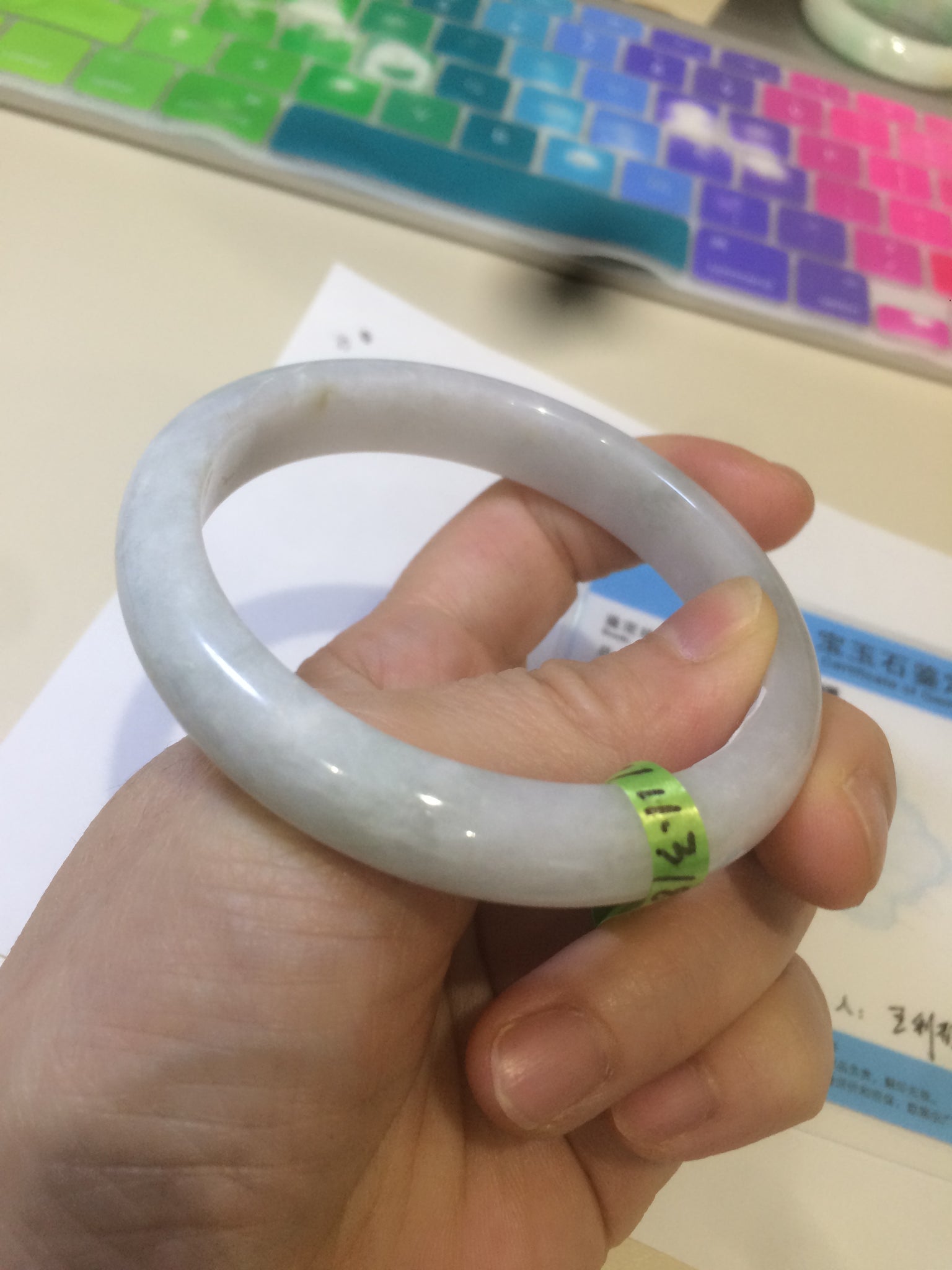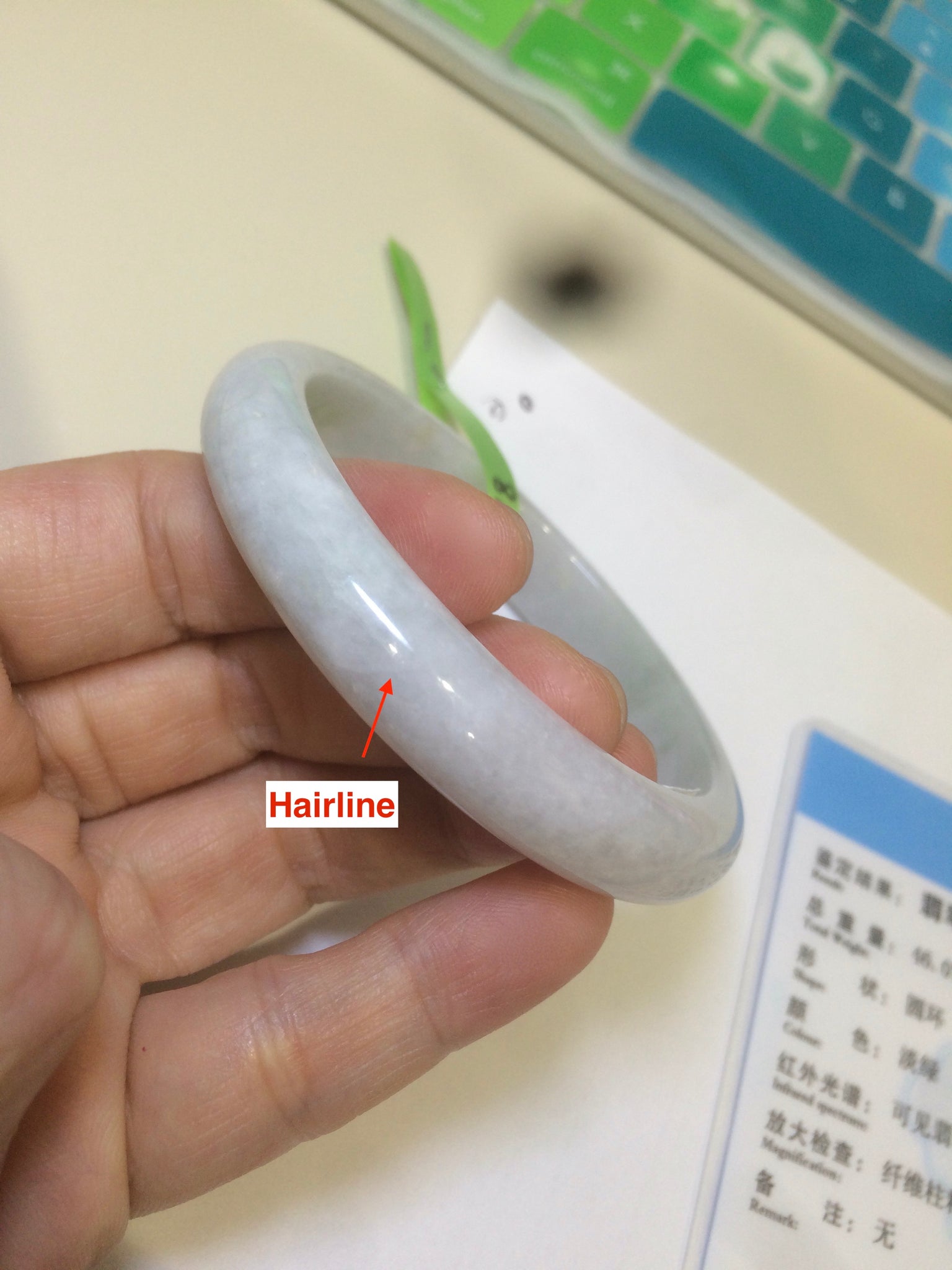 Some cracks. One is ring-shaped with wax residue. Some tiny rough surfaces. The rough surfaces may have an extremely tiny little bit of wax residue. Some hairlines. Cotton spots.