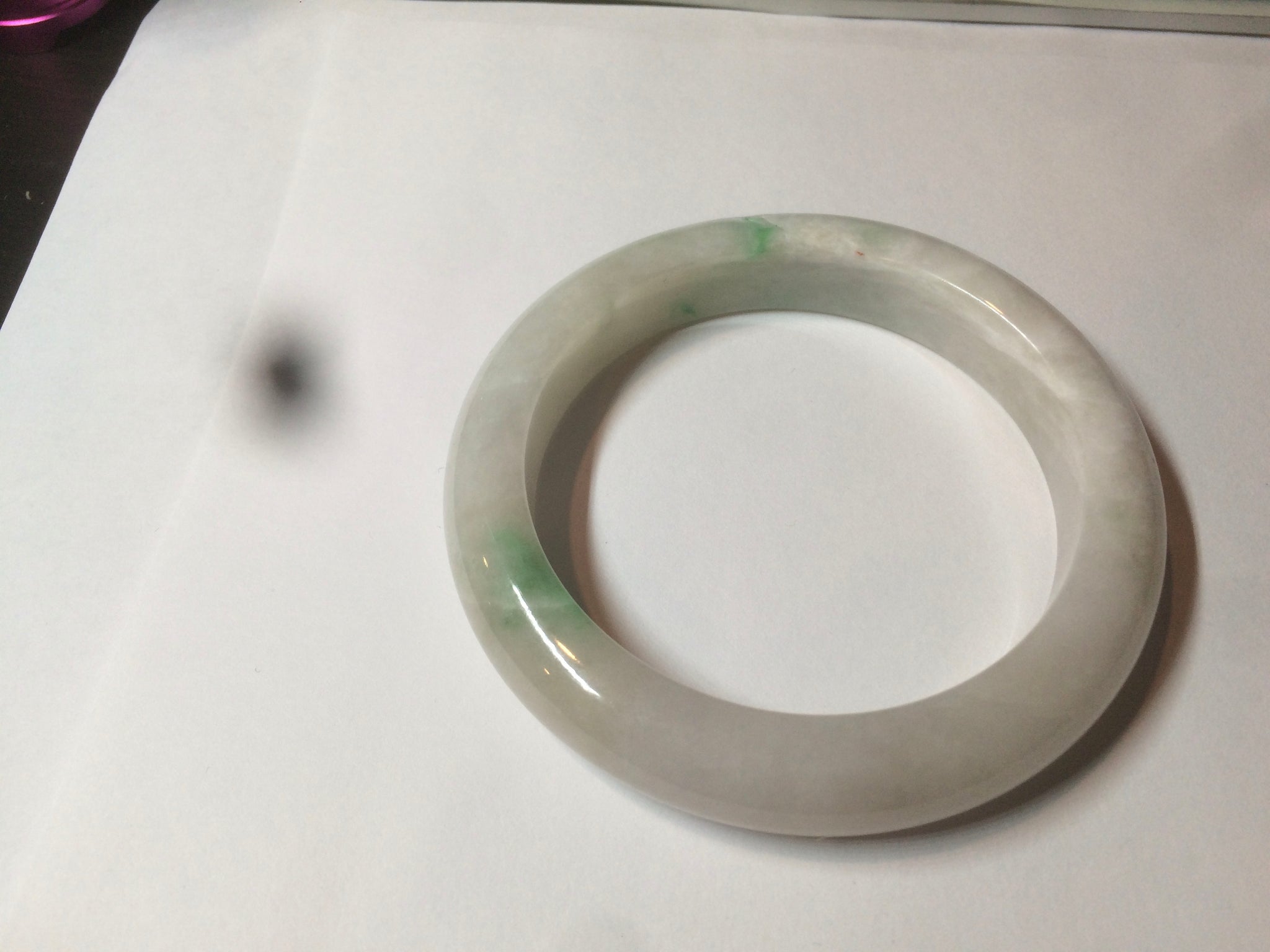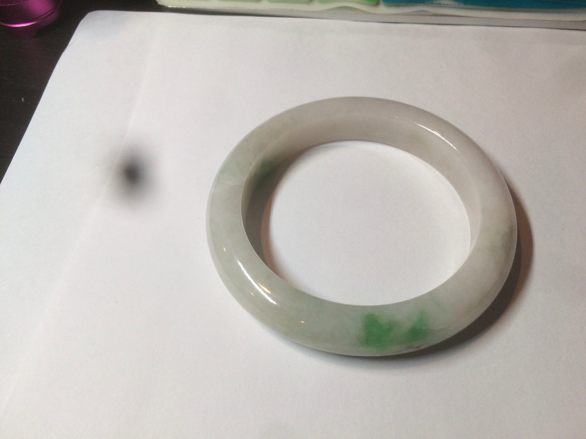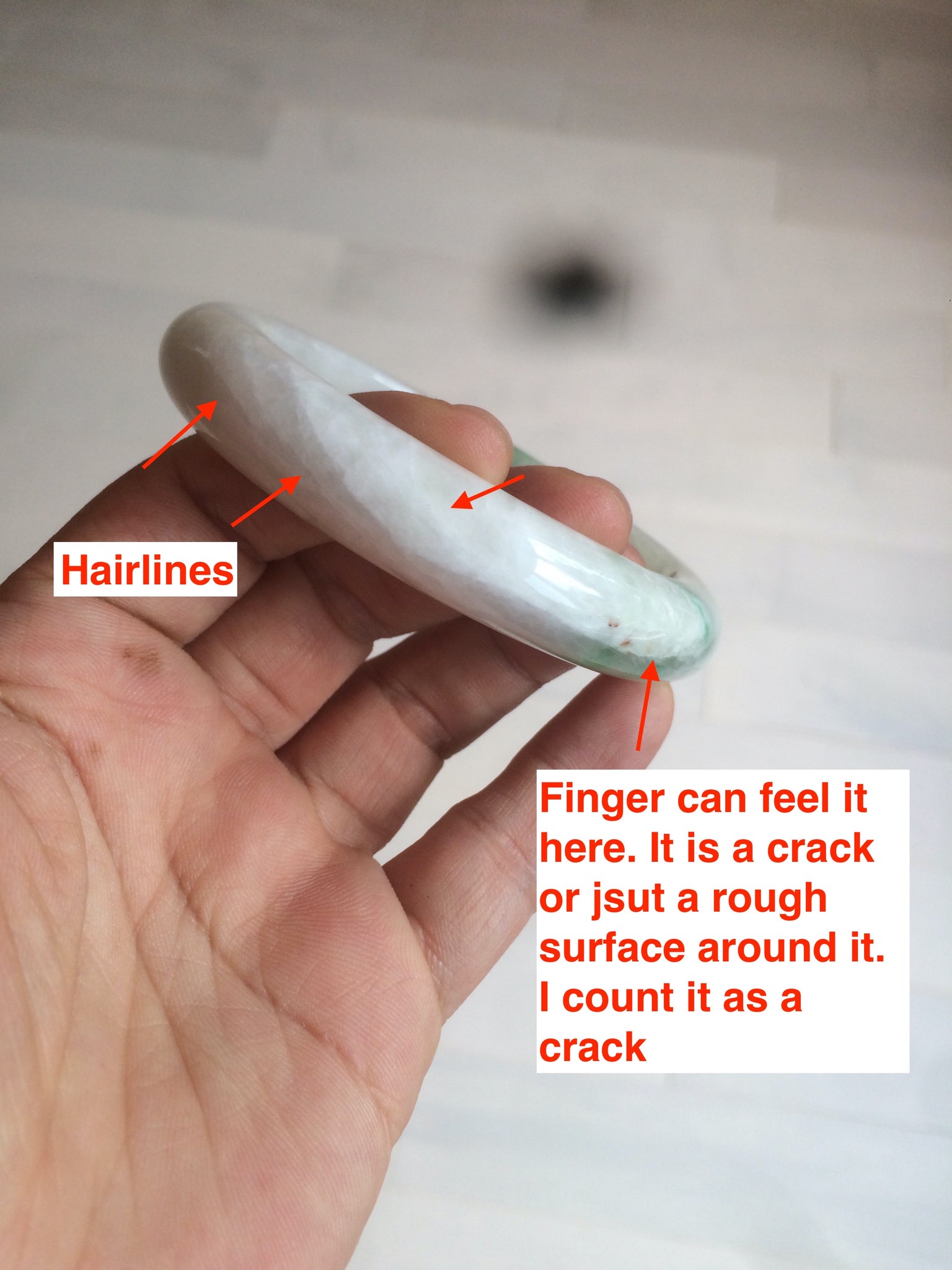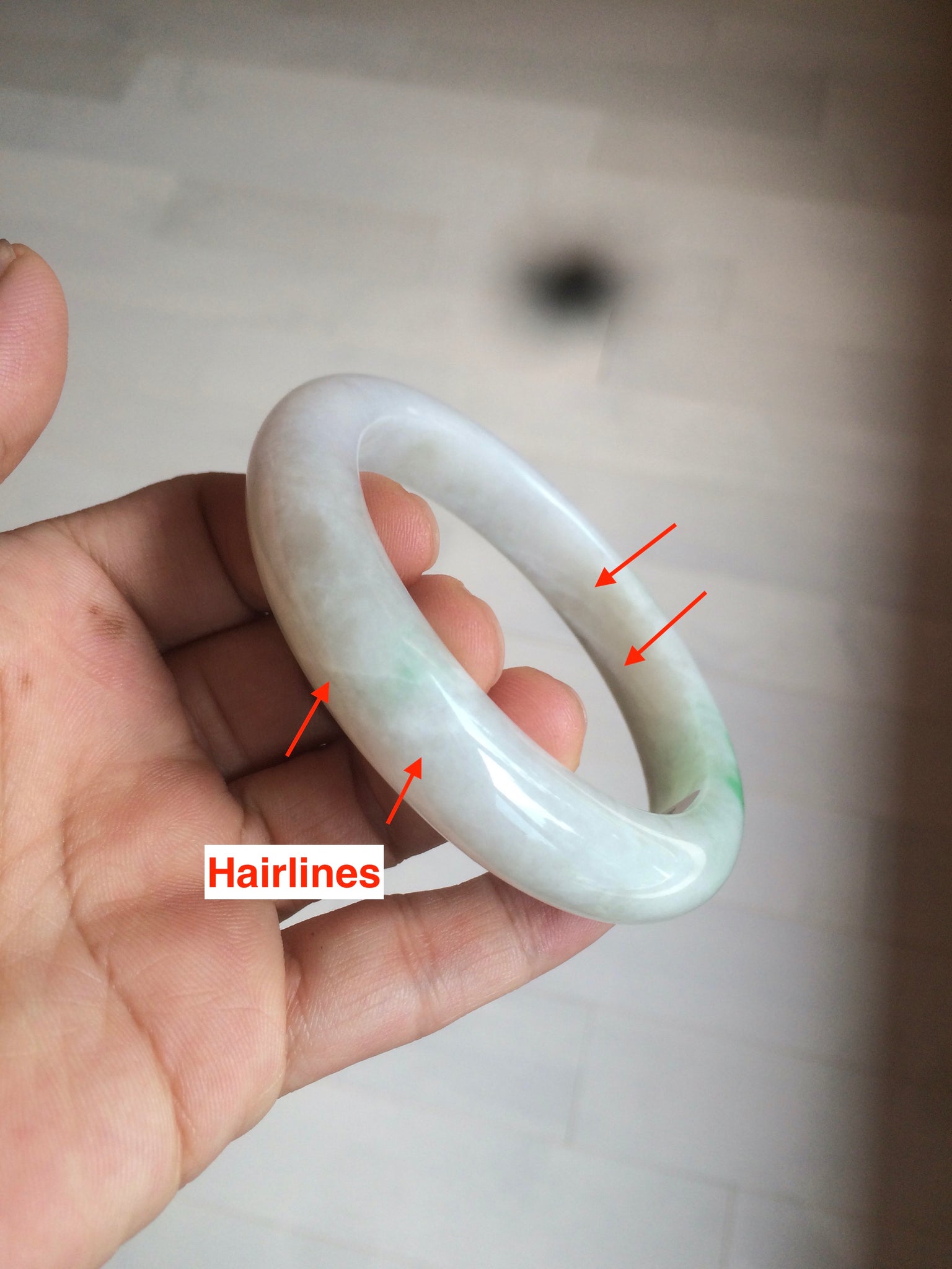 One u shape crack on a rough surface. Quite a lot of hairlines. Some of them are long. Photos may not show all. The bangle is solid(Guaranteed!). Makes a high-pitched sound when clicked. Some cotton spots and lines.  Not transparent. The purple is lighter than in the photos.