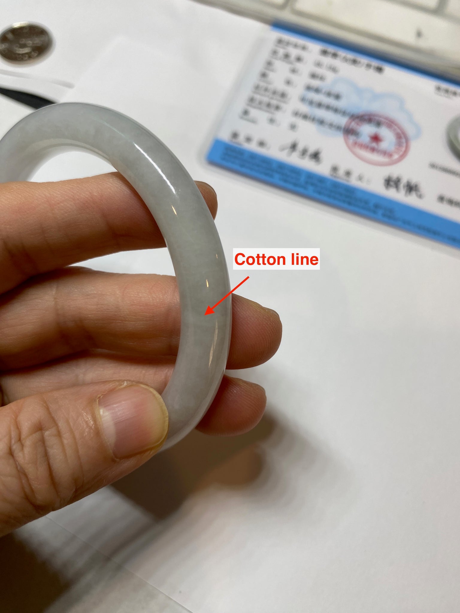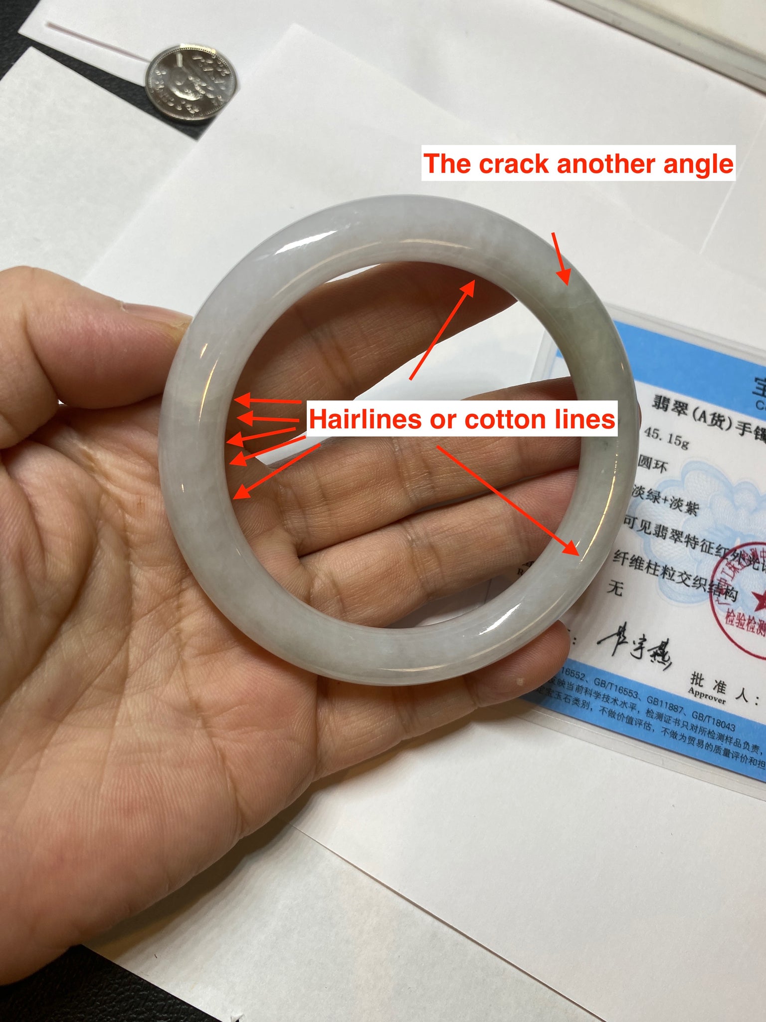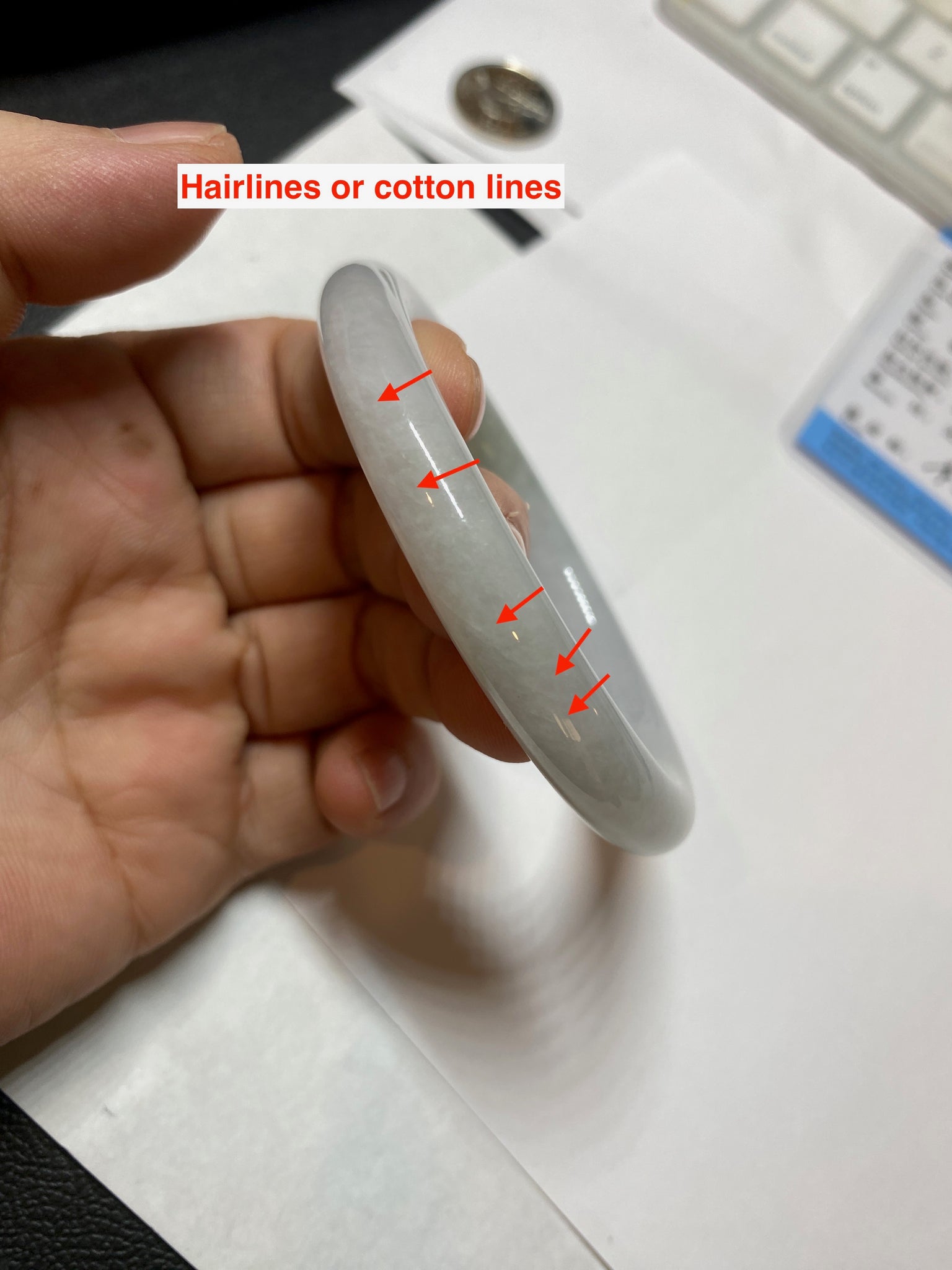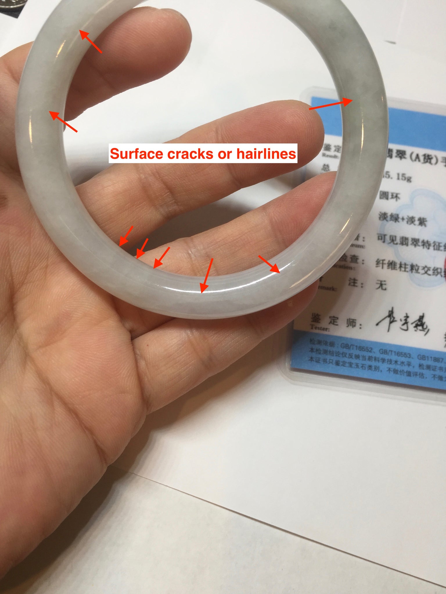 Some surface cracks with very tiny amount of wax. The bangle is solid(Guaranteed). Make high pitch sound when tapped. Some small rough surfaces/rough spots may with fissures or scratches. Some hairlines, cotton lines, cotton spots, and cotton areas. The purple is super light. lighter than in the photos due to the purple color always more camera friendly.