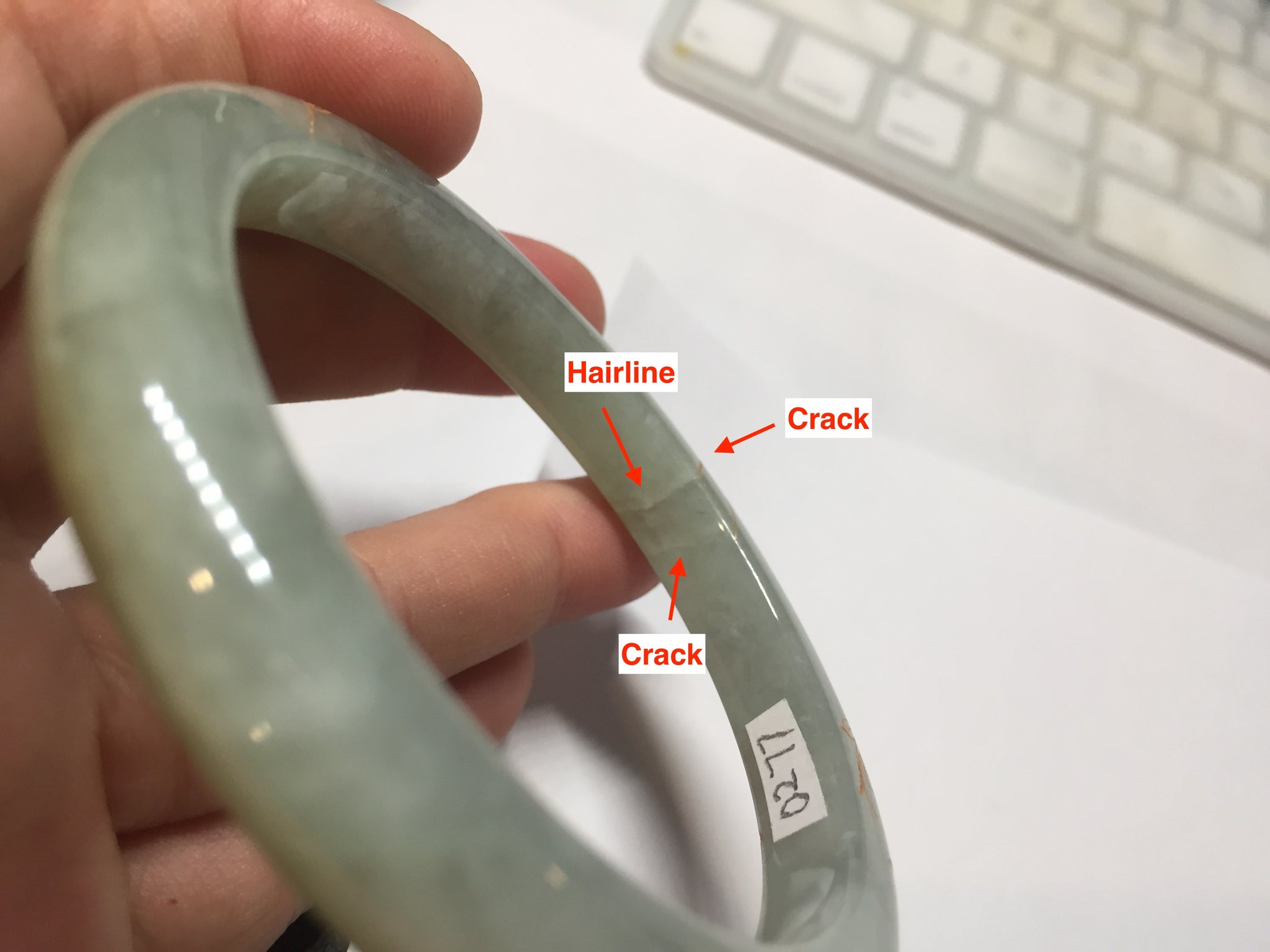 Some surface cracks, hairlines, rough surface covered by the carving. One crack is deep. The bangle is still firm(Guaranteed!). One hairline. Some cotton spots, cotton lines, and cotton areas.