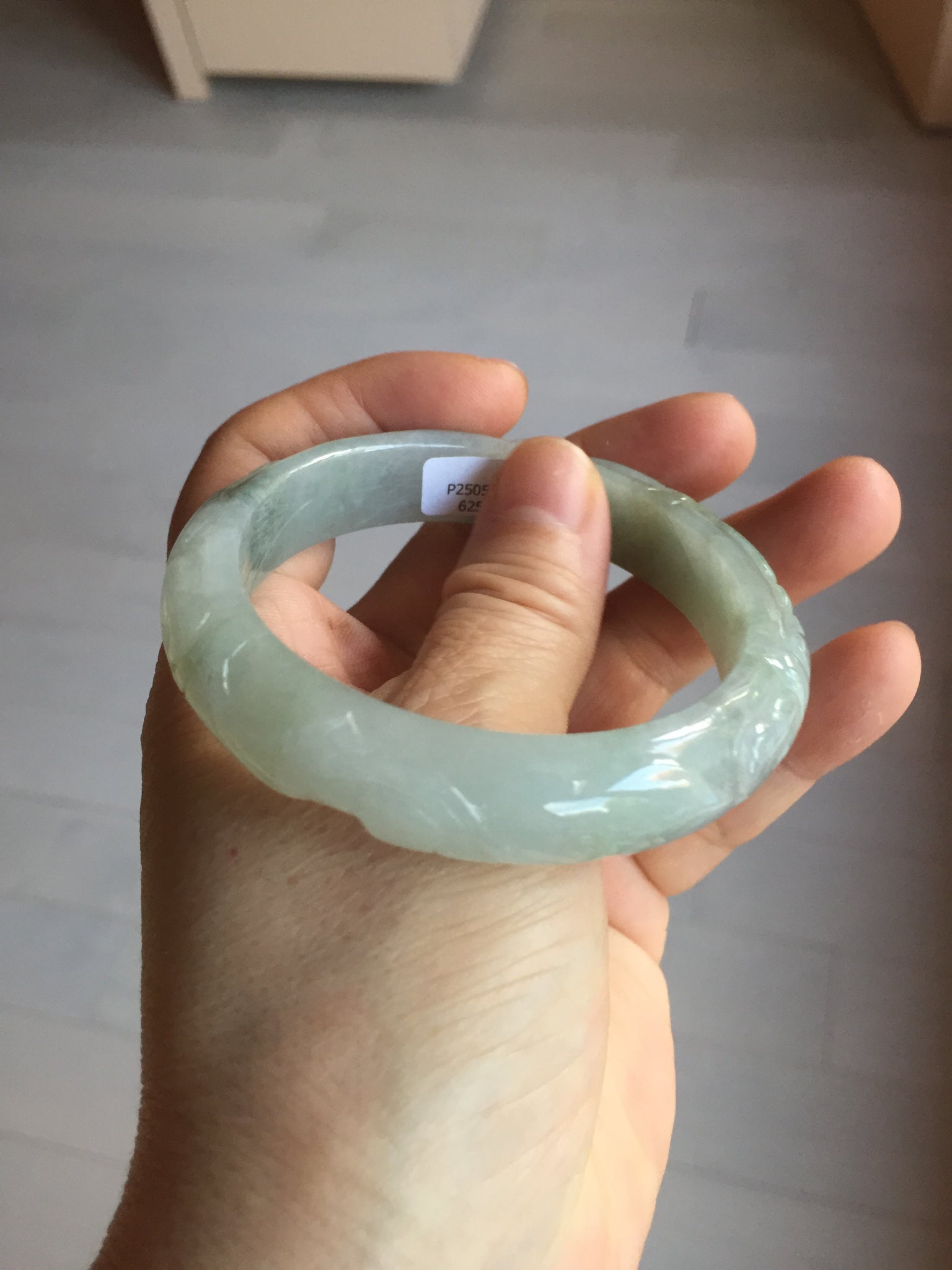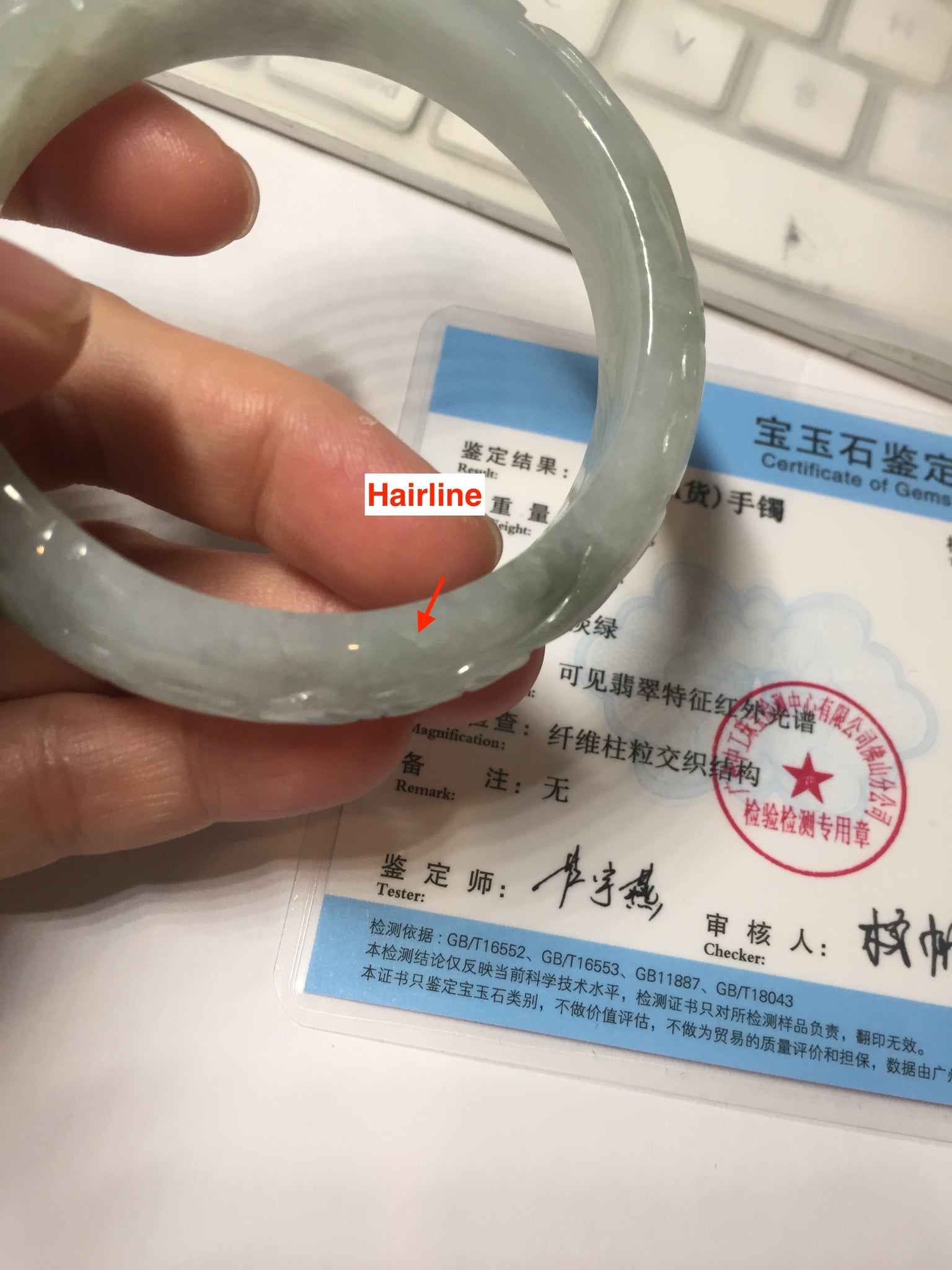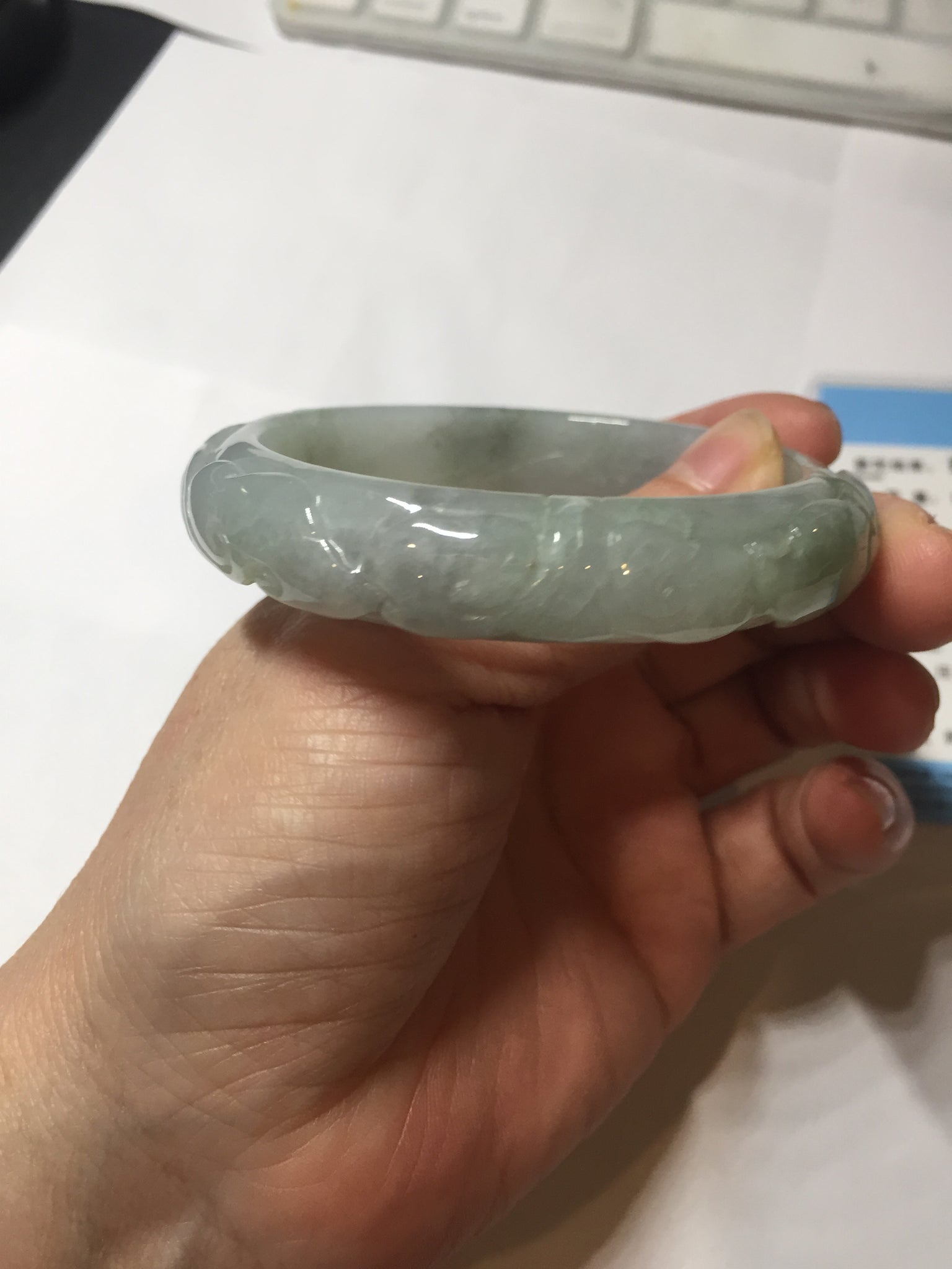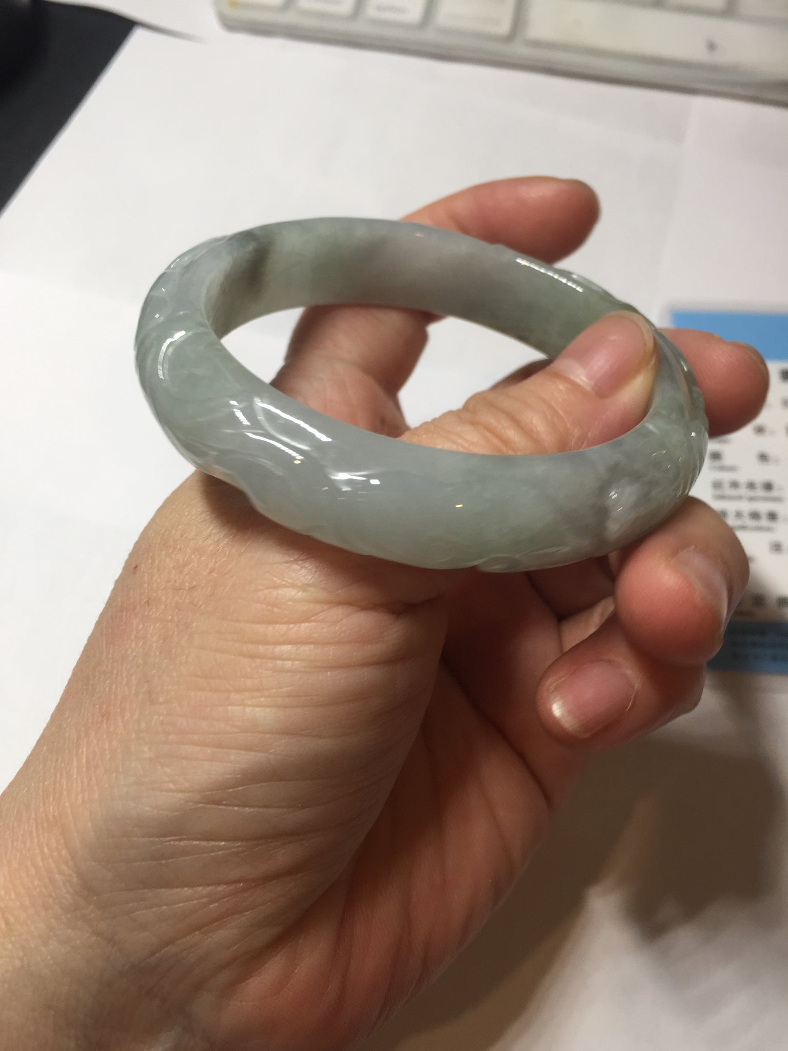 This exquisite light green jade bangle is masterfully carved with three powerful traditional motifs: