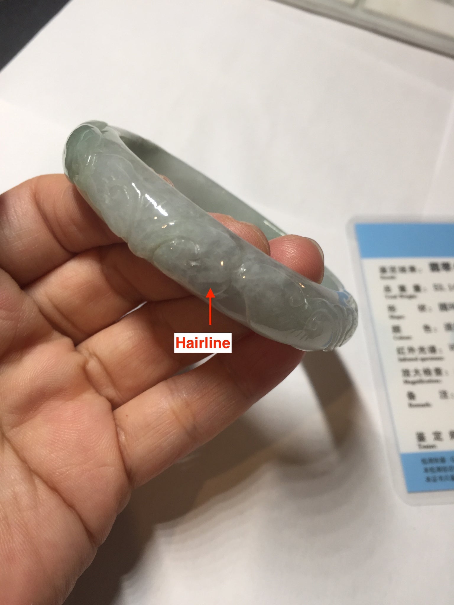 One V shape crack. Some hairlines are hidden by the carving. Guaranteed solid. Some cotton spots and cotton lines. Black dim area.