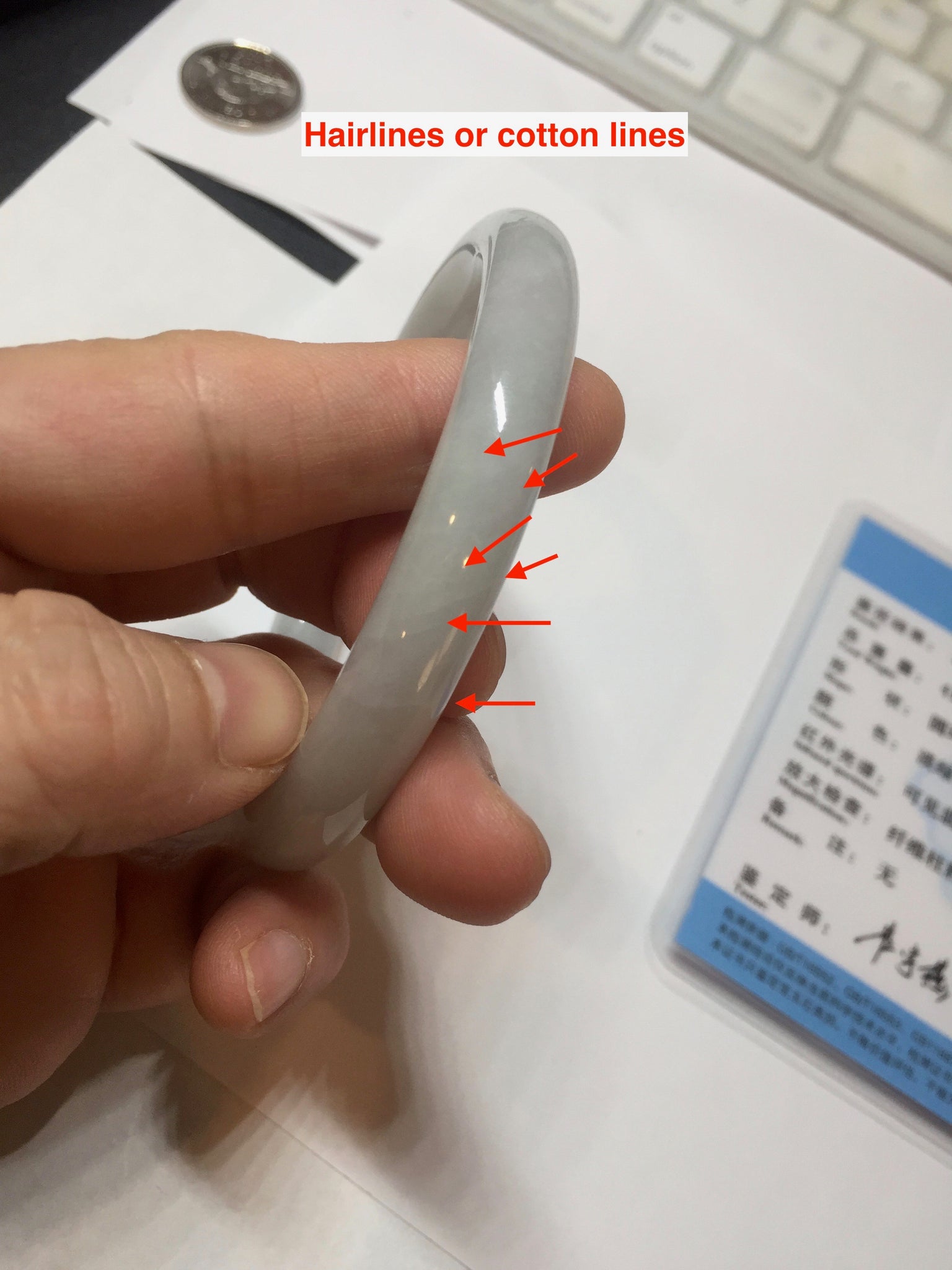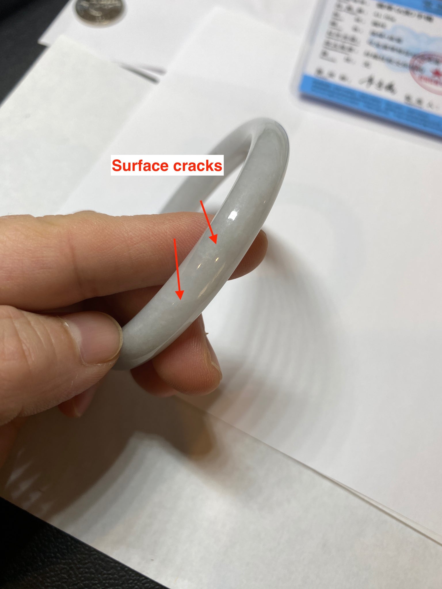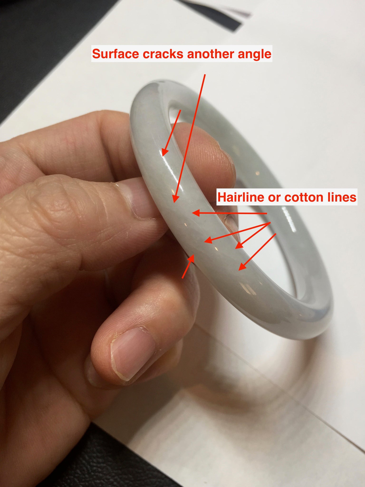 Some surface cracks with very tiny amount of wax. The bangle is solid(Guaranteed). Make high pitch sound when tapped. Some small rough surfaces/rough spots may with fissures or scratches. Some hairlines, cotton lines, cotton spots, and cotton areas. The purple is super light. lighter than in the photos due to the purple color always more camera friendly.