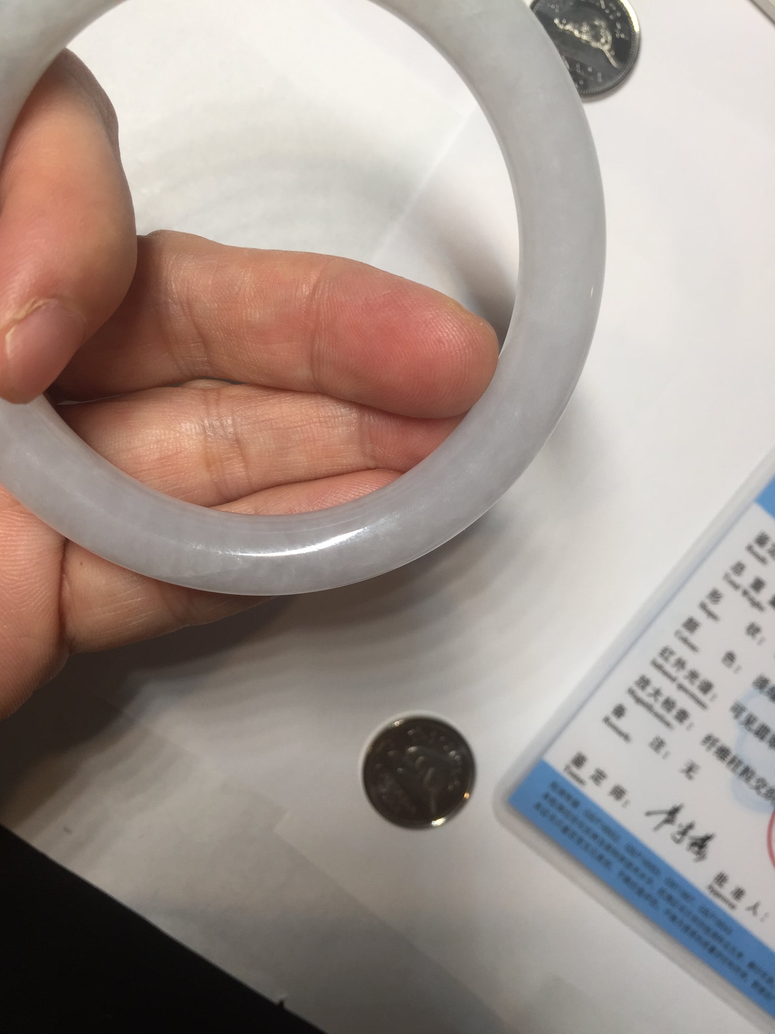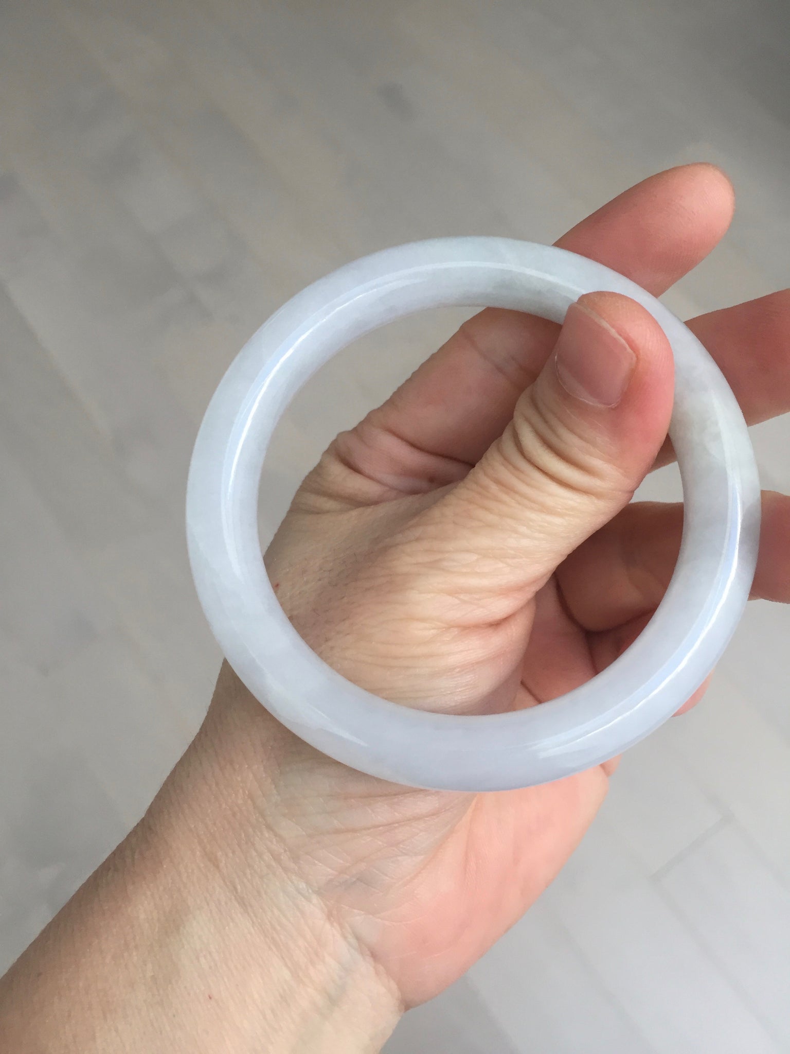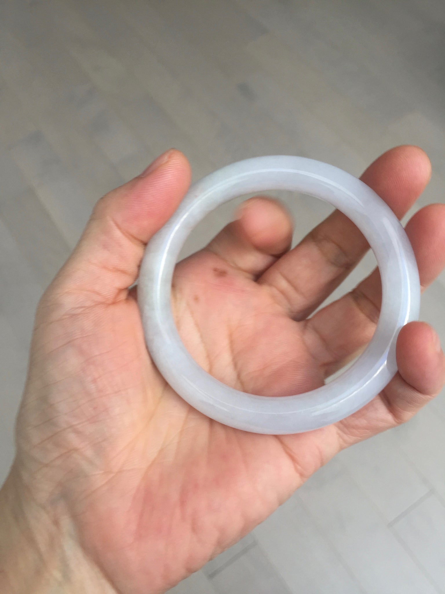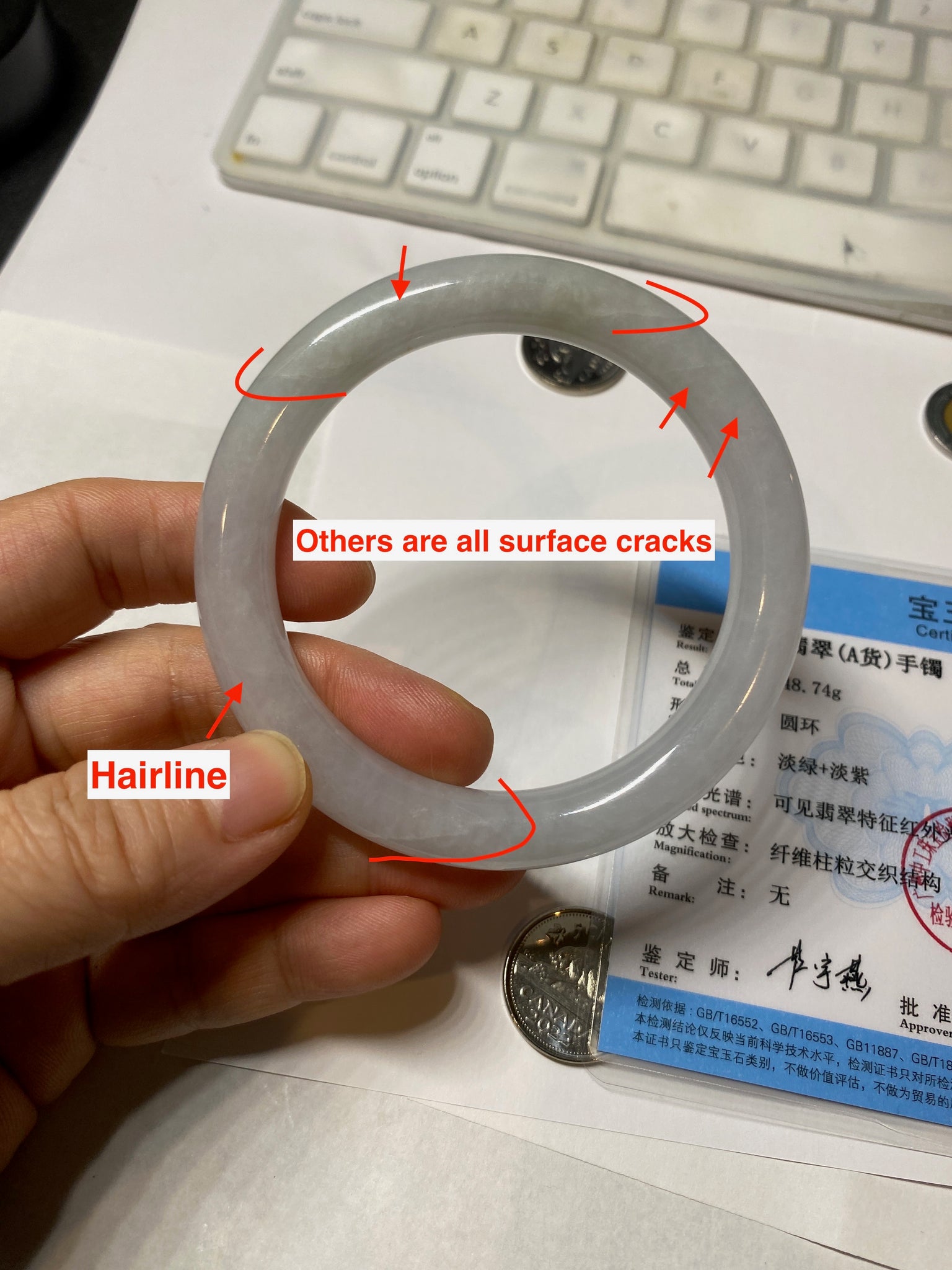 Some surface cracks with very tiny amount of wax. Three of them are U shape. The bangle is solid(Guaranteed). Make high pitch sound when tapped. One hairline. Some small rough surfaces/rough spots. Some cotton lines, cotton spots, and cotton areas. The purple is super light. lighter than in the photos due to the purple color always more camera friendly.