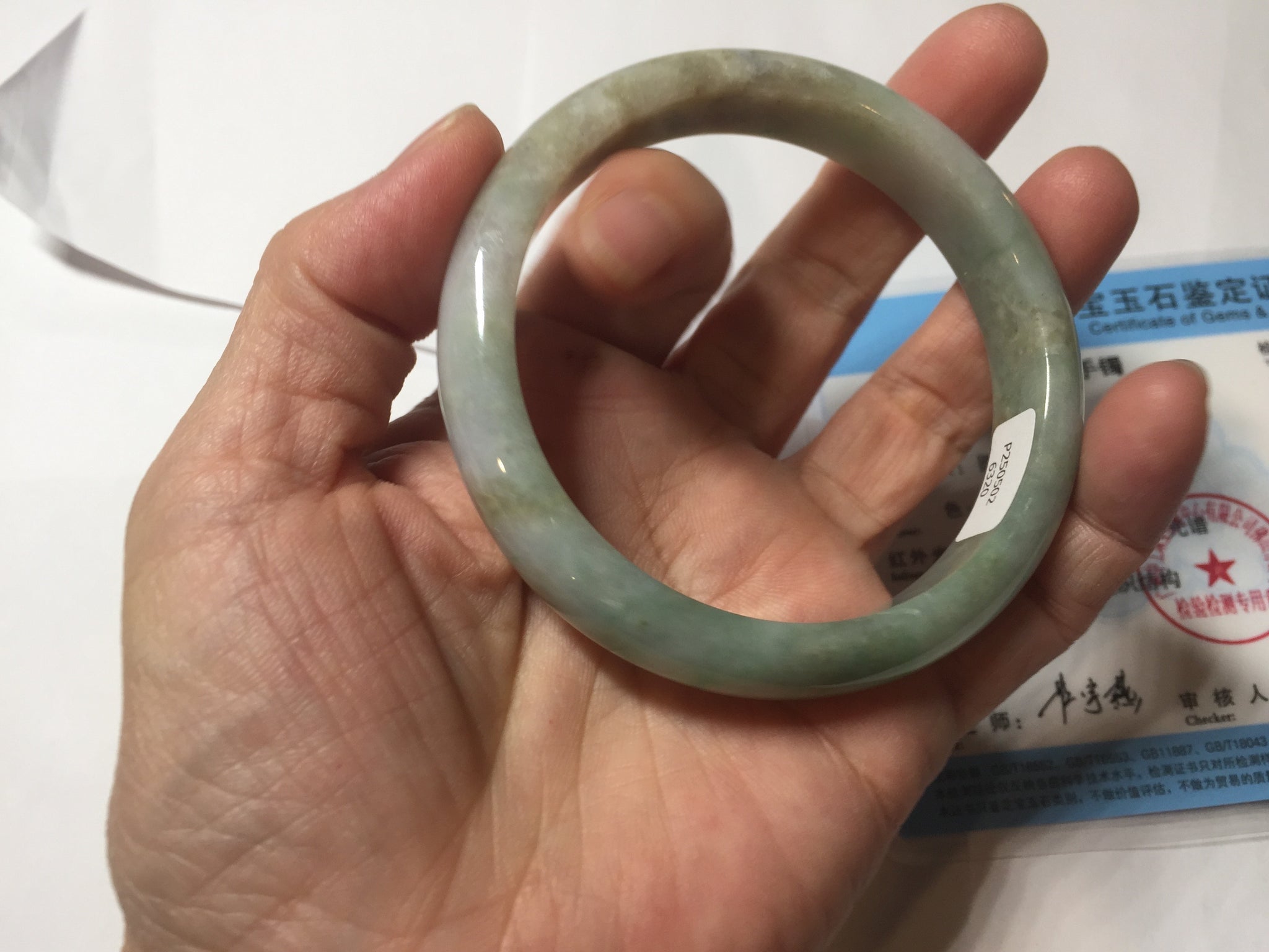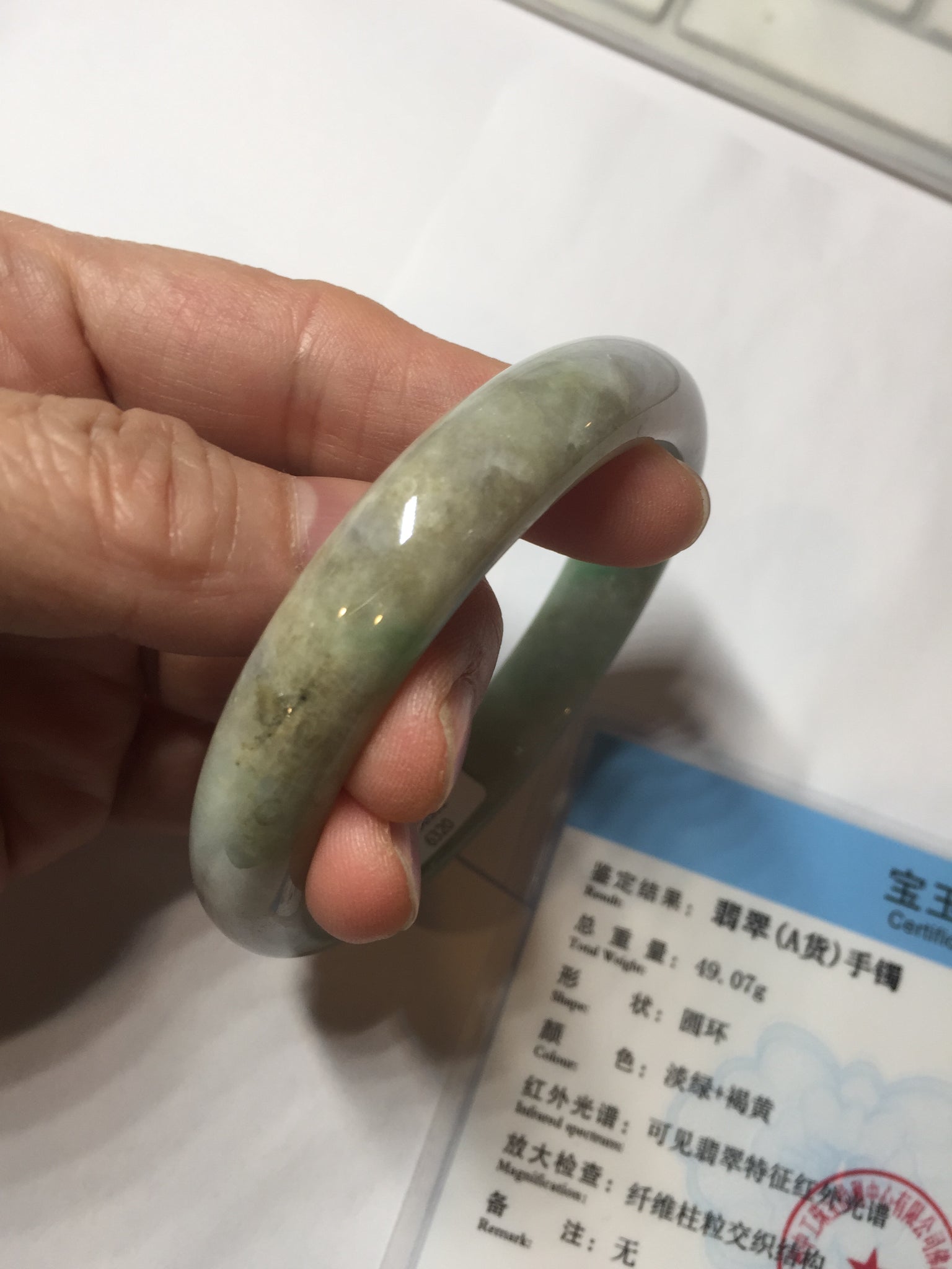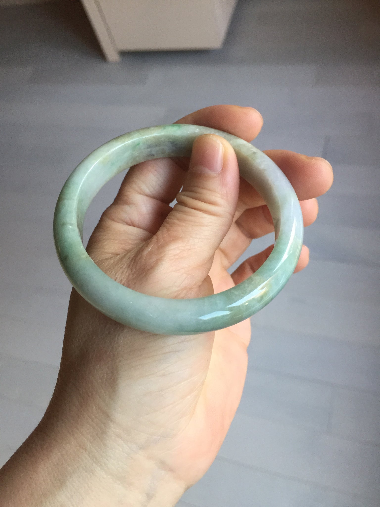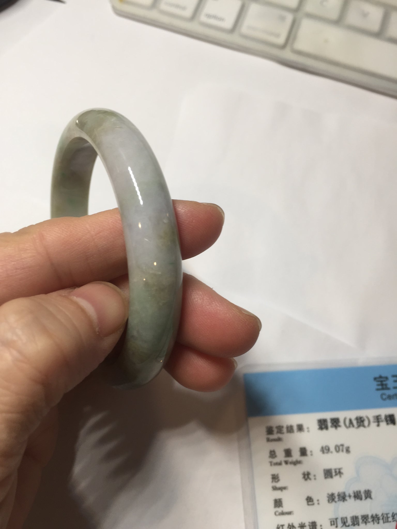 Some surface cracks or scratches. The bangle is solid(Guaranteed). Yellow rough surface. Some color roots, cotton lines, cotton areas, and cotton spots. Not transparent. The purple is lighter than in the photos due to the purple color always more camera friendly.