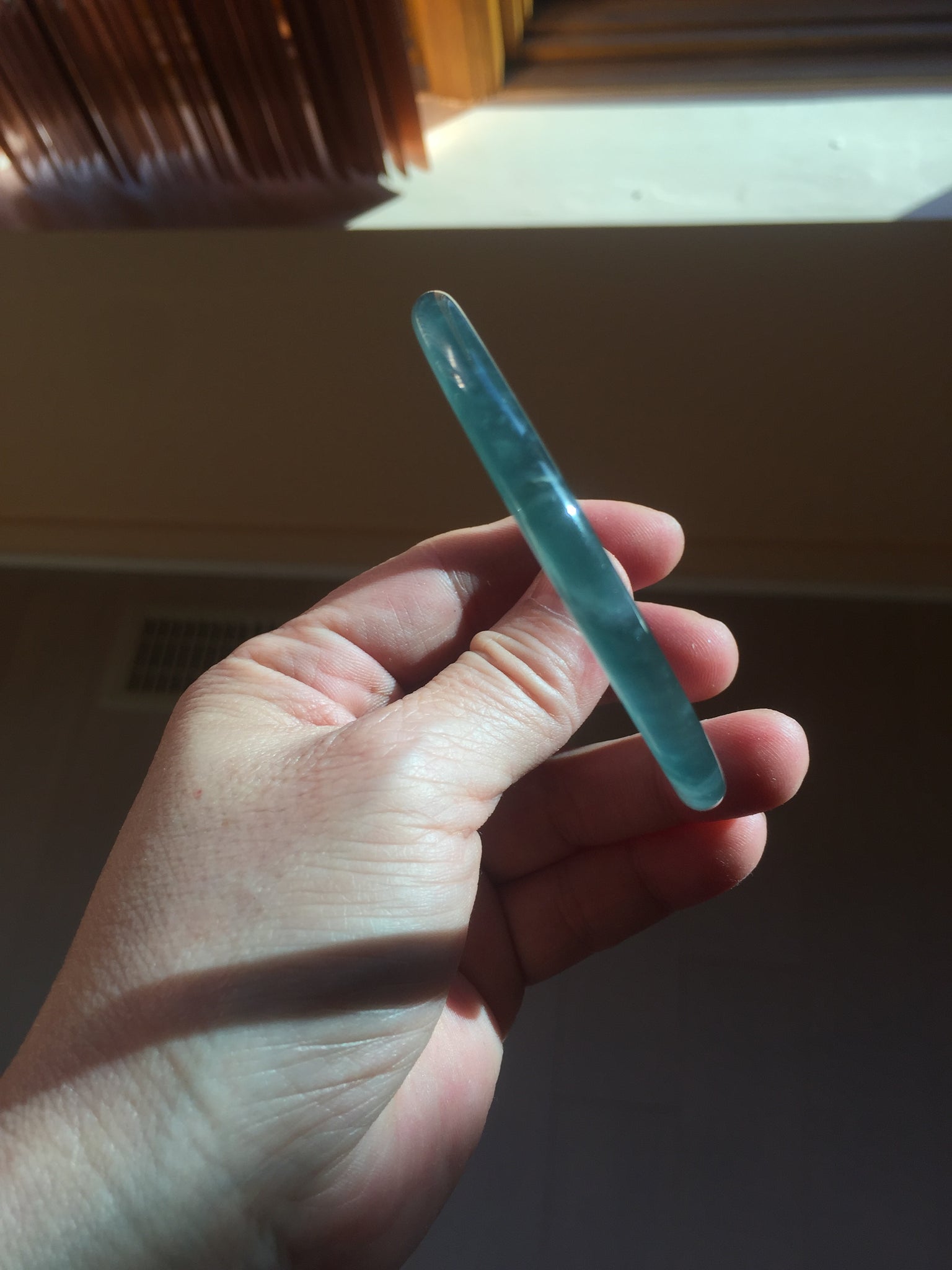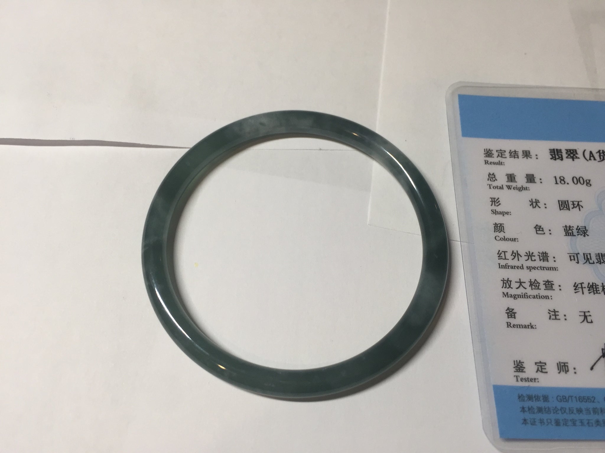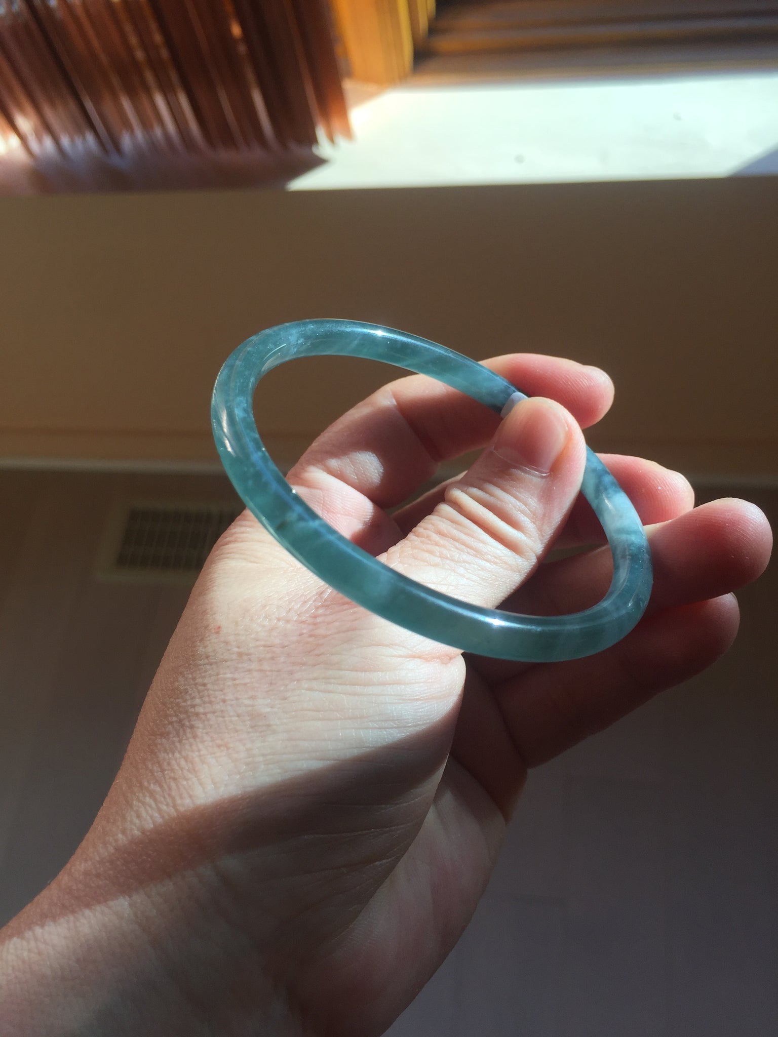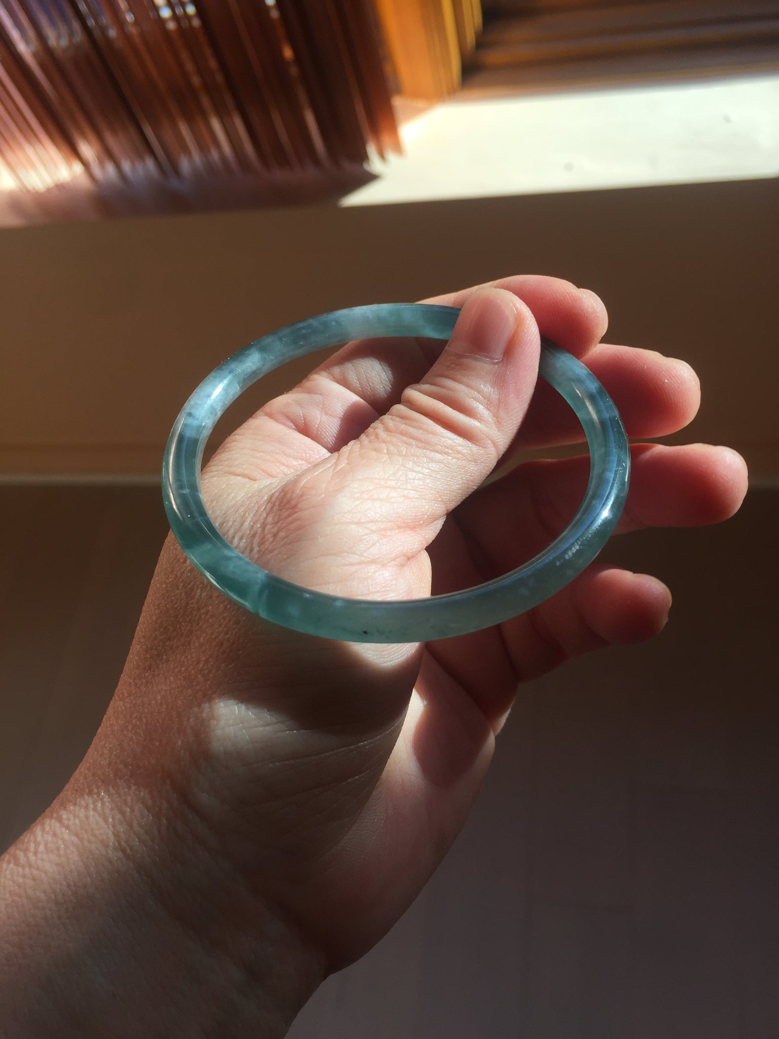 One crack. Some cotton areas, cotton lines and cotton spots. One cotton area has some tiny rough spots. The bangle has some gray/ black color.