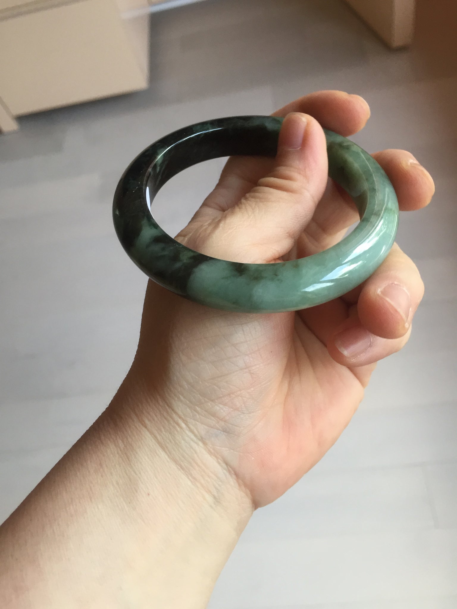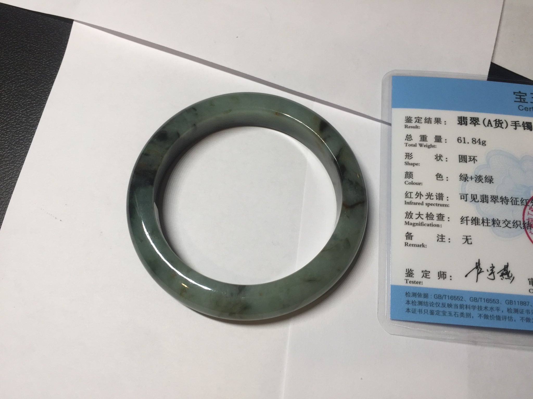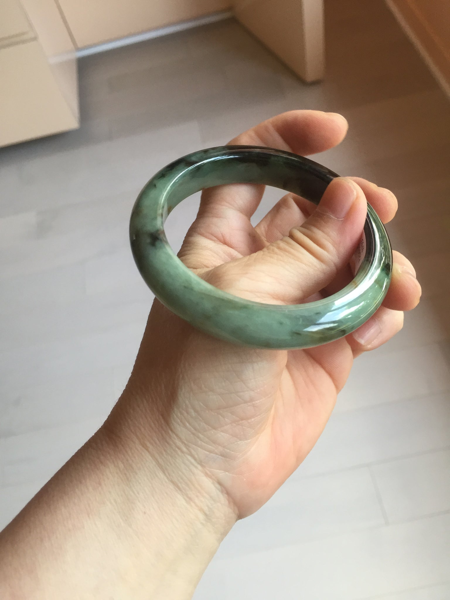 Rough surface with mine pit, surface cracks and fissures. The bangle is solid(Guaranteed). One part is narrower and thinner than other parts. Some cotton spots and lines. Not transparent. Has some black/gray color.