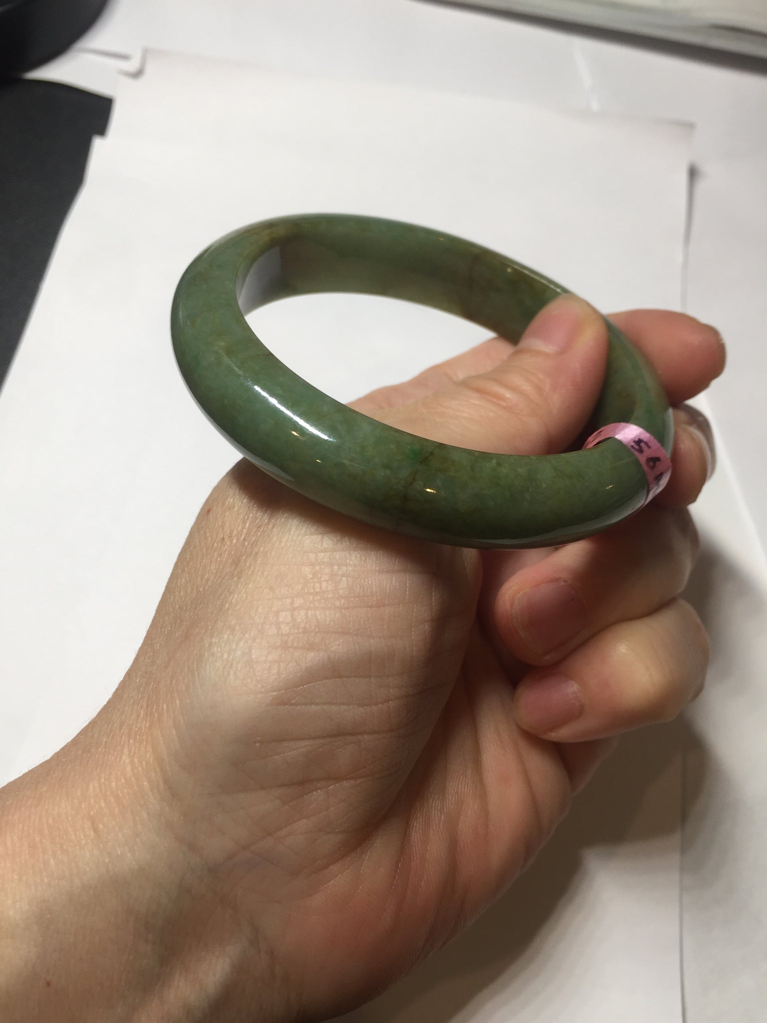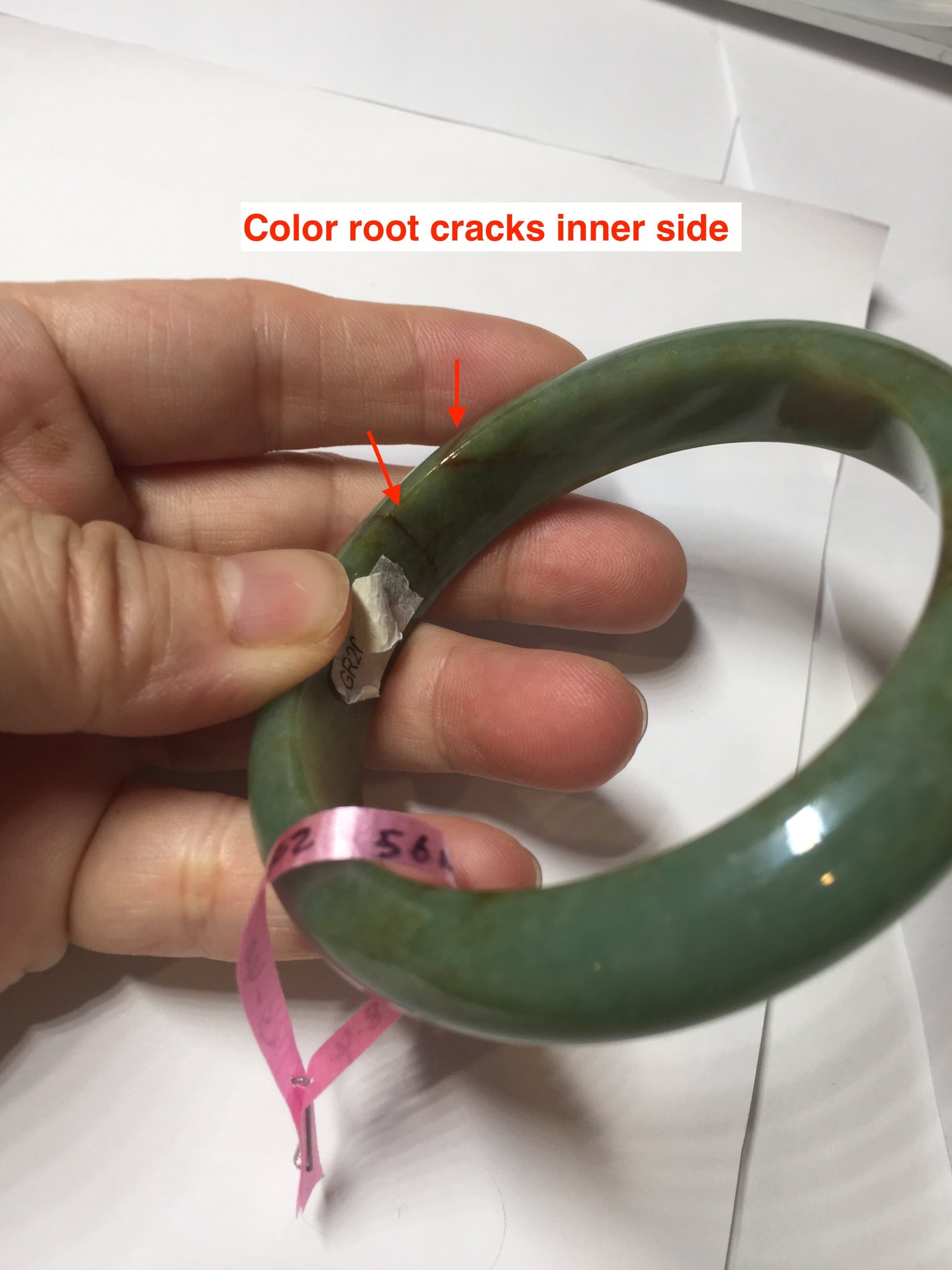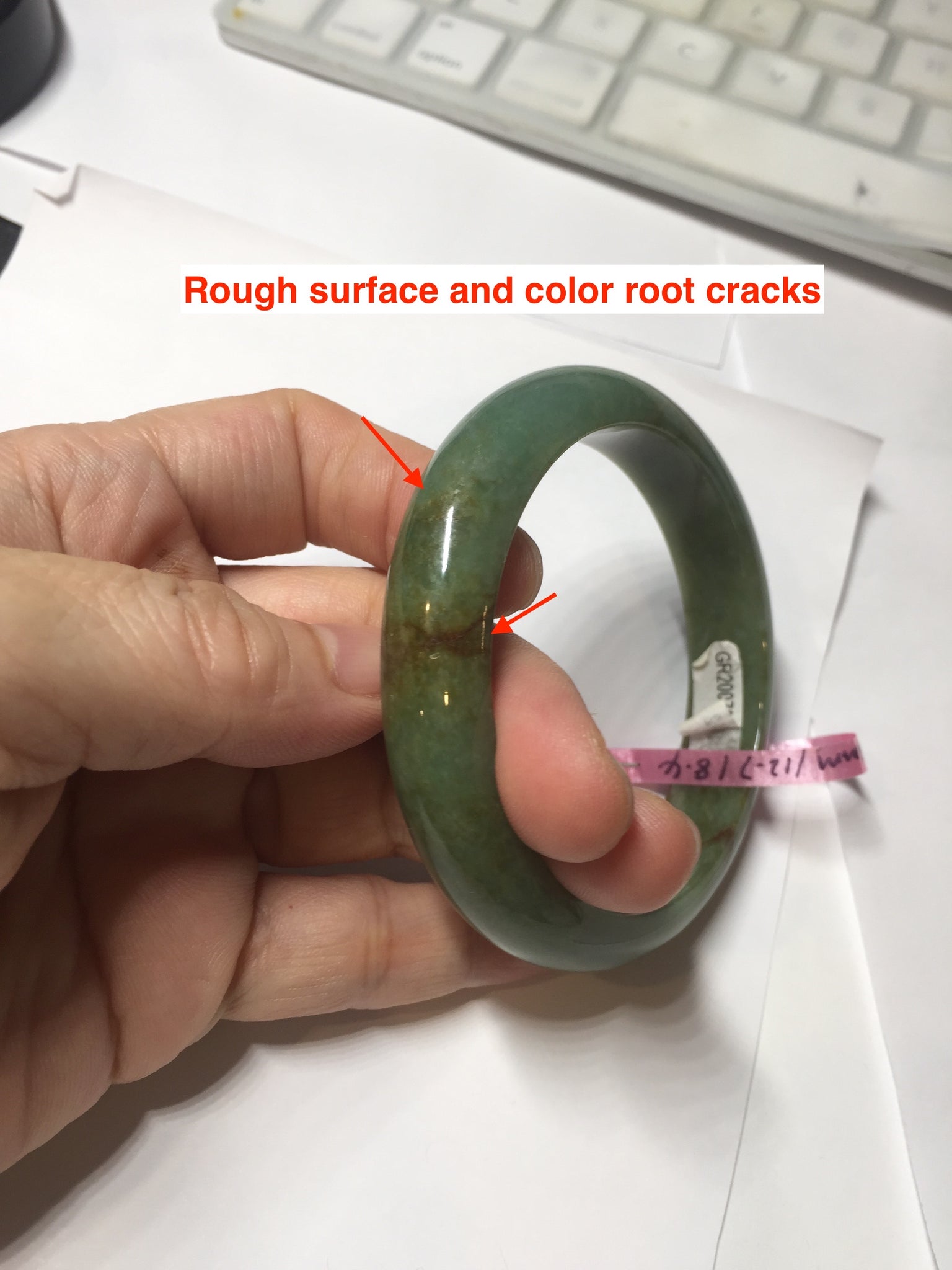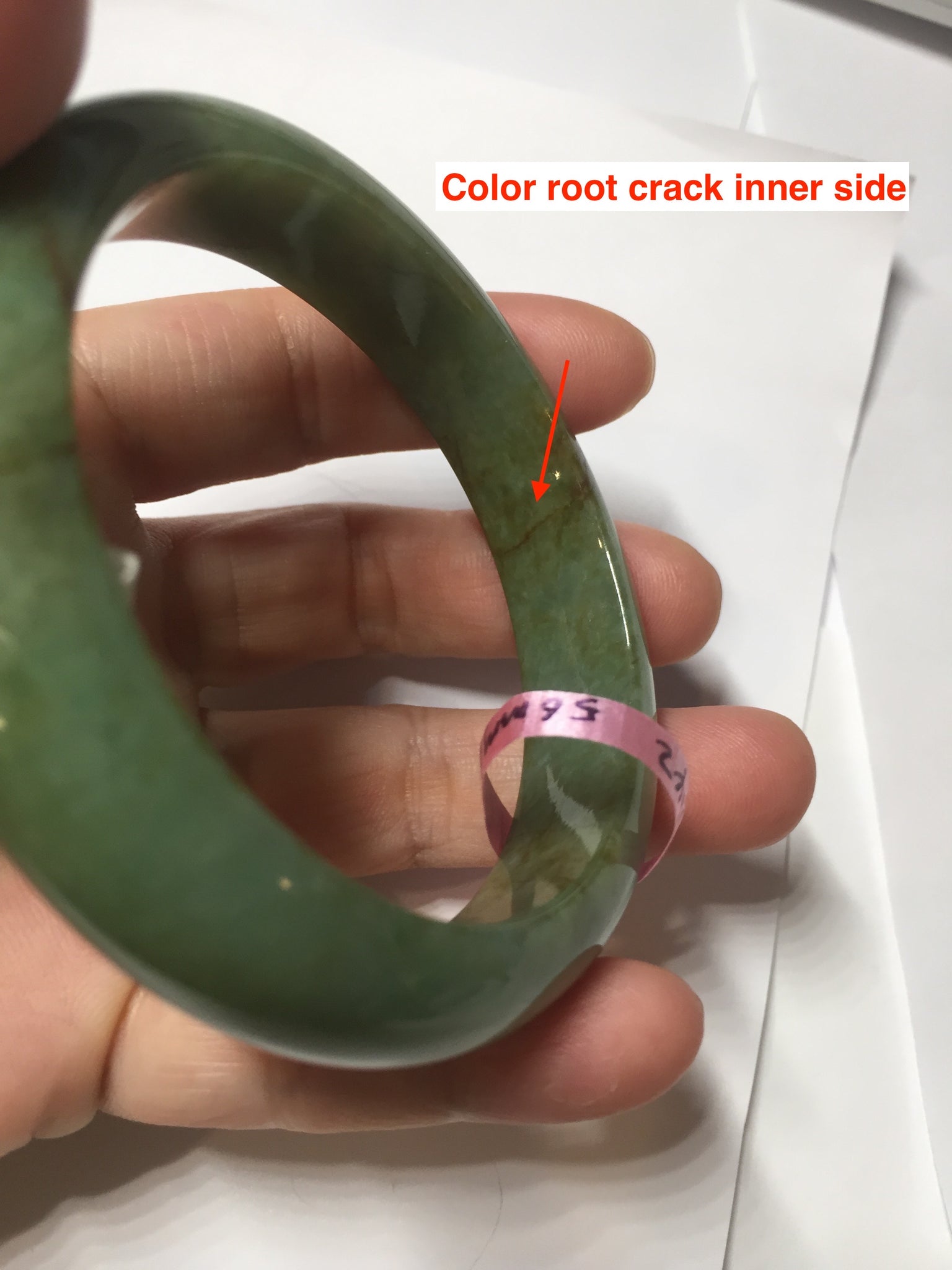 Some red/brown color root cracks. One of them is around the bangle color root crack. The bangle is still solid(Guaranteed! ). Usully color root cracks won't have big impact to the firmness. Just hot good infusion. Make high pitch sound when tapped. Some cotton lines, cotton areas, and cotton spots. Not transparent.